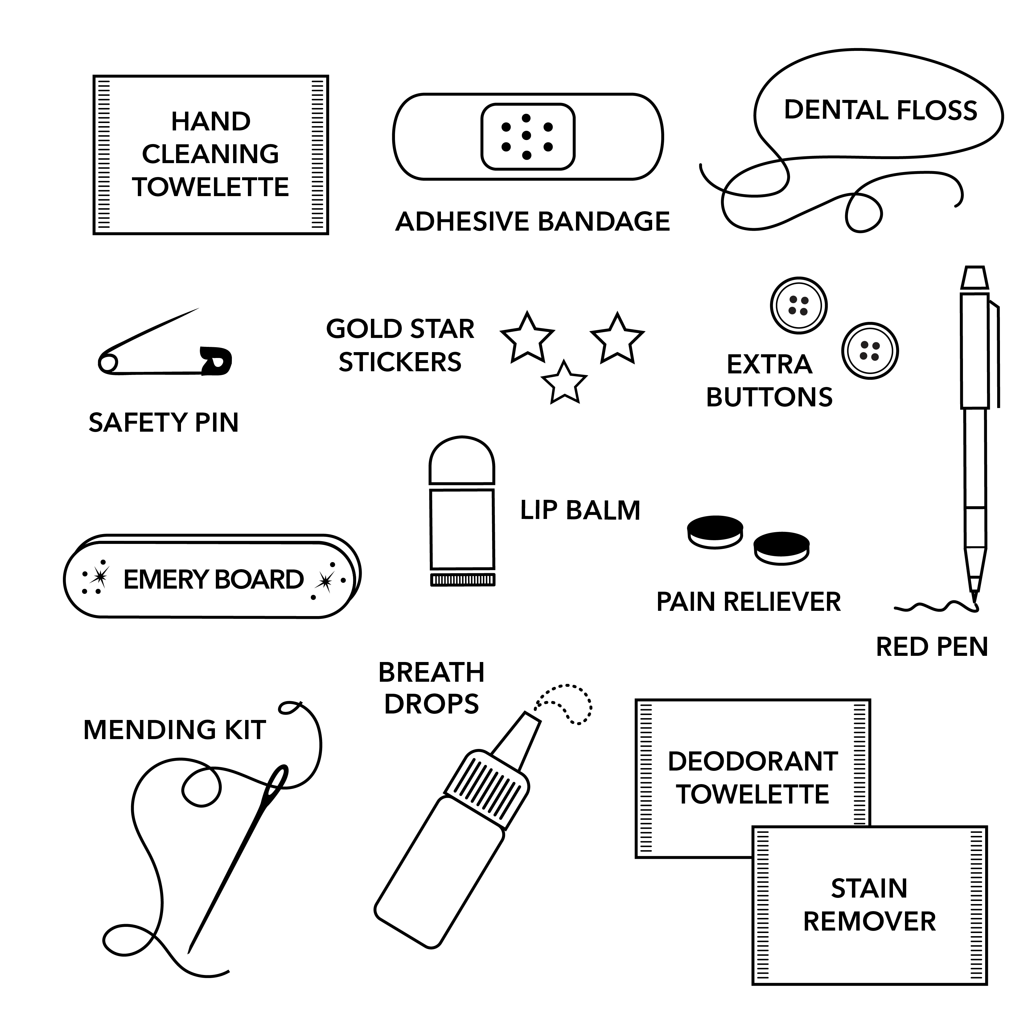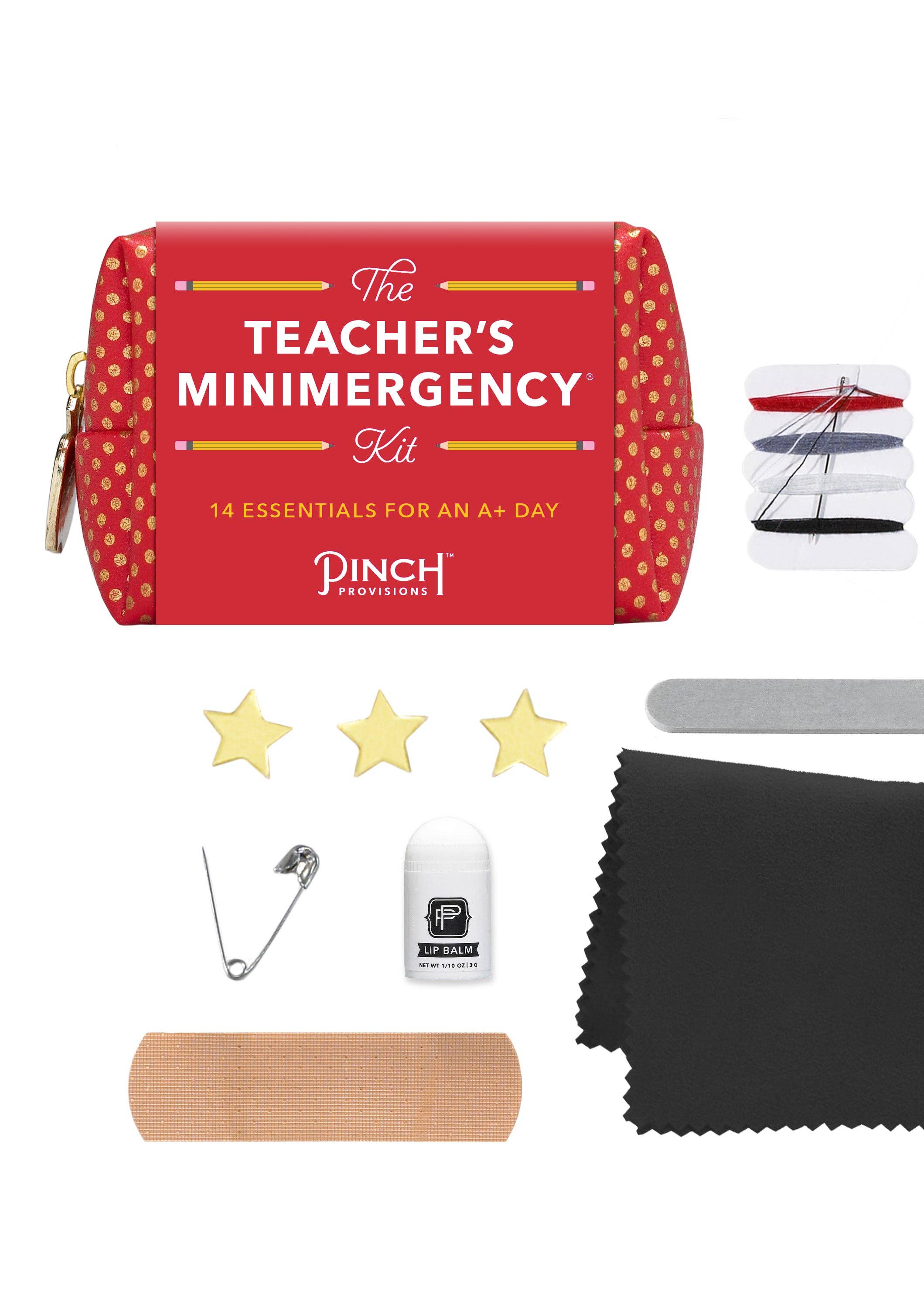 Not available to ship outside of the US. Pop quiz: What’s the perfect gift for teachers? Answer: The Minimergency® Kit for Teachers by Pinch Provisions®. This adorable red & gold polka dot pouch (with a charming apple zipper pull) contains 18 educator essentials, including a mini red pen and gold star stickers.
