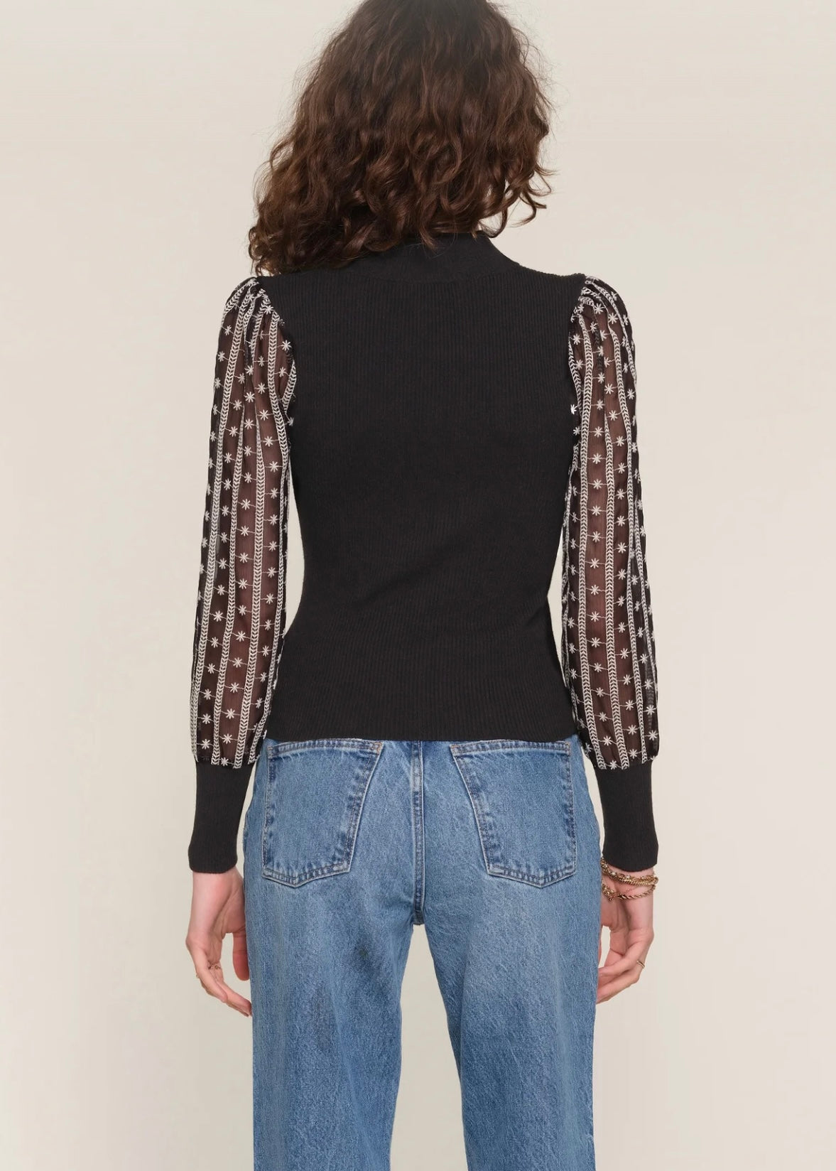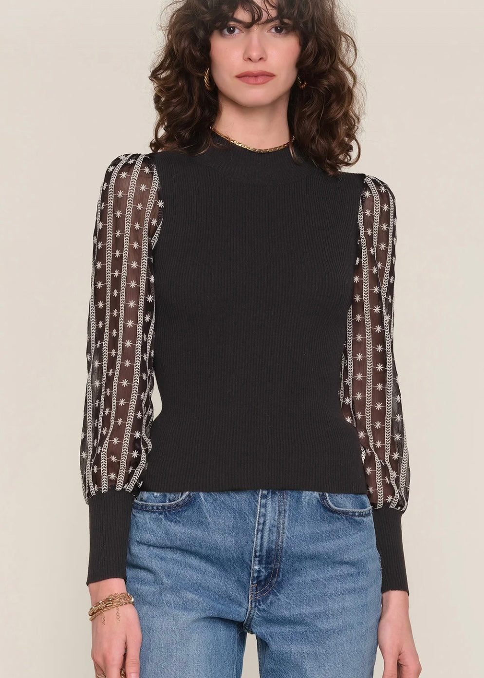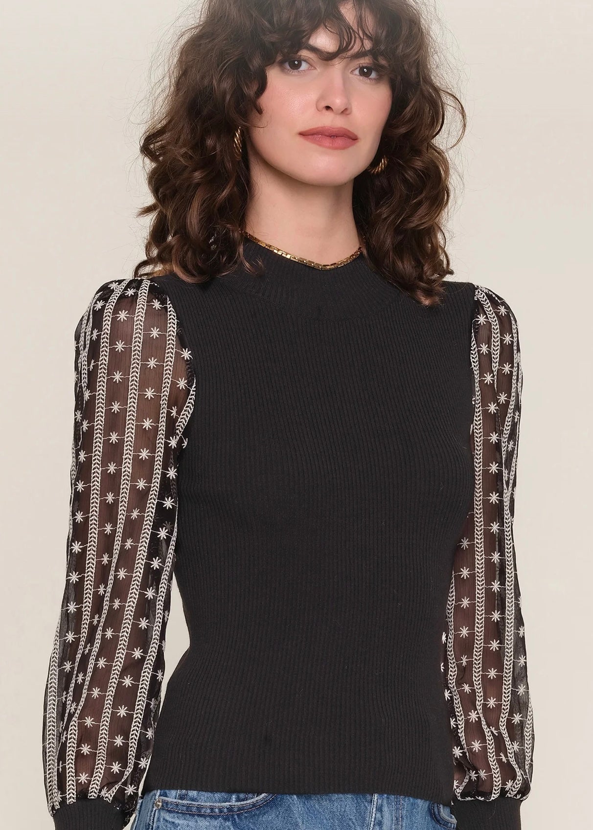 It features contrast, embroidered chiffon sleeves