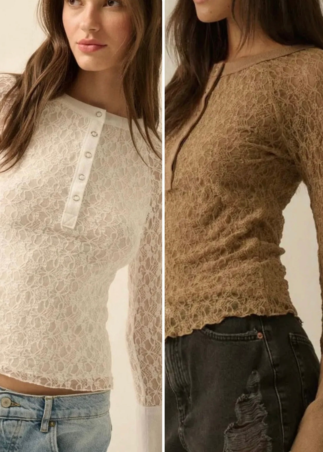 Featuring a delicate floral lace design and a round neckline trimmed with soft rib-knit, this top adds a flirty touch to your outfit. Long raglan sleeves lead to split cuffs with contrasting rib-knit for a fun, unexpected twist. The half-snap henley closure makes dressing easy, while the sleeveless lining keeps you cool and comfy all day long. Perfect for mixing playful details with classic style