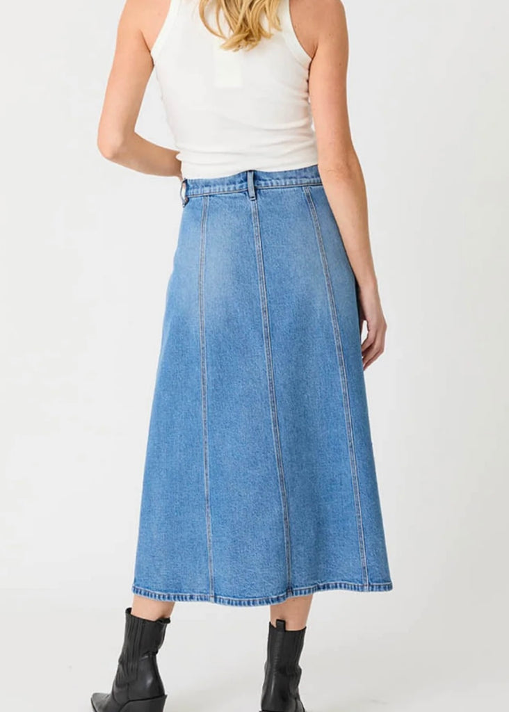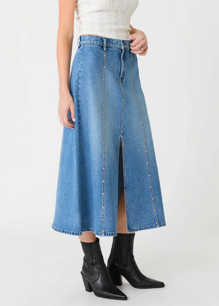 The Parker Blue Moment Studded Skirt features a flattering high-waisted fit and a chic midi length perfect for versatile styling