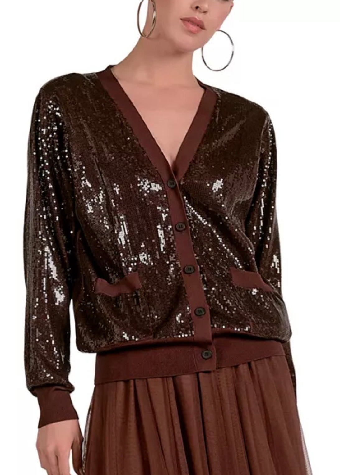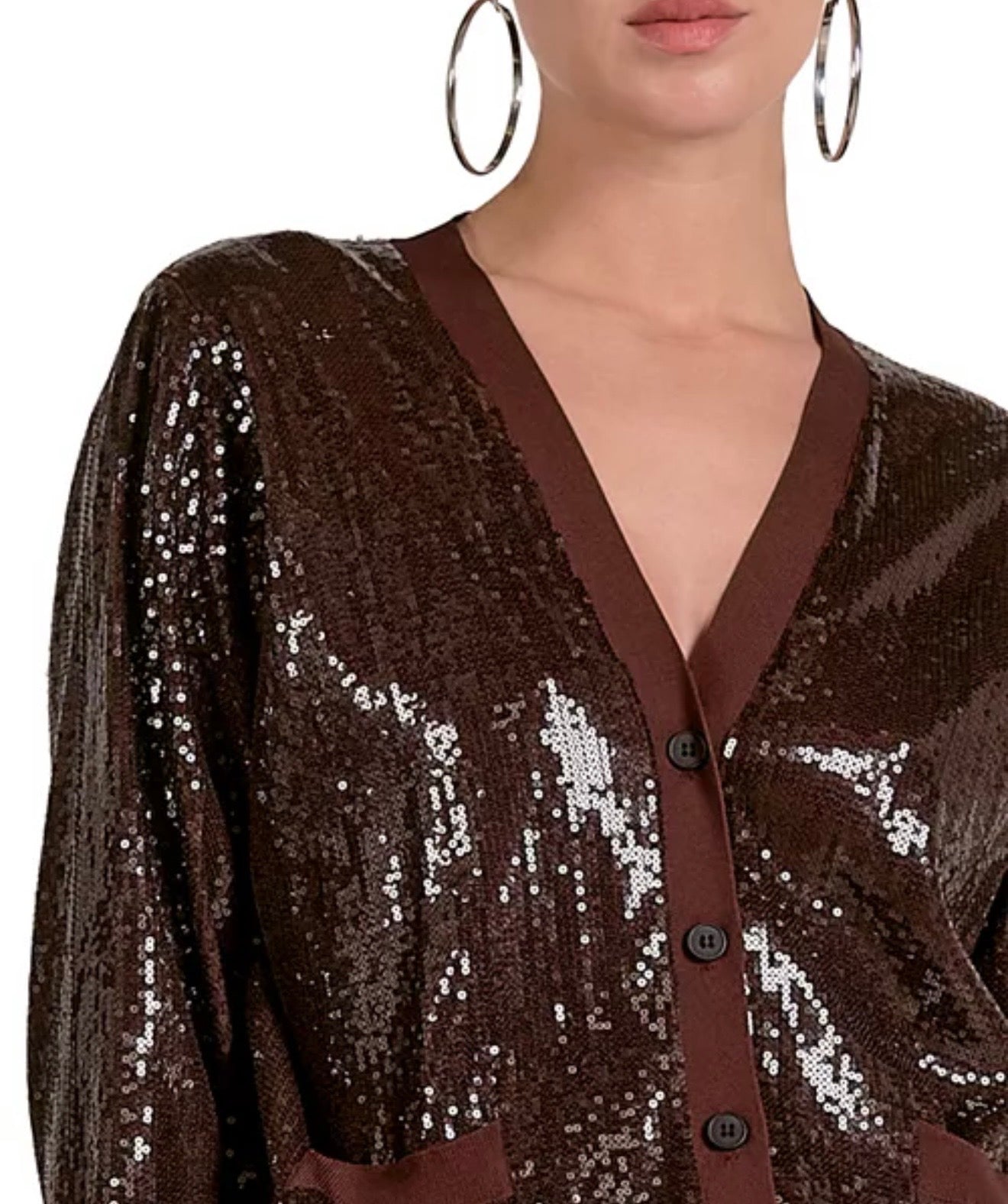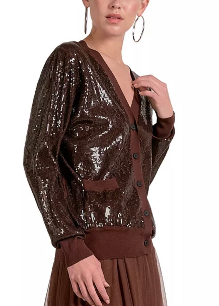 Made with a chocolate colored sequin fabric, this V-neck cardigan by Elan, features a front-button closure and convenient pockets