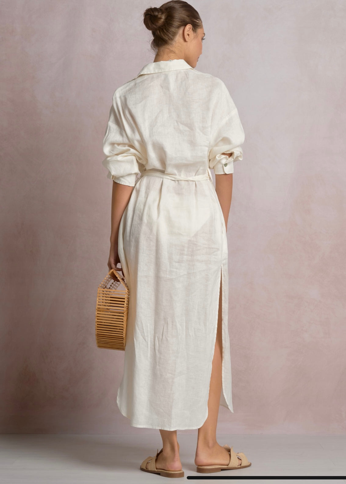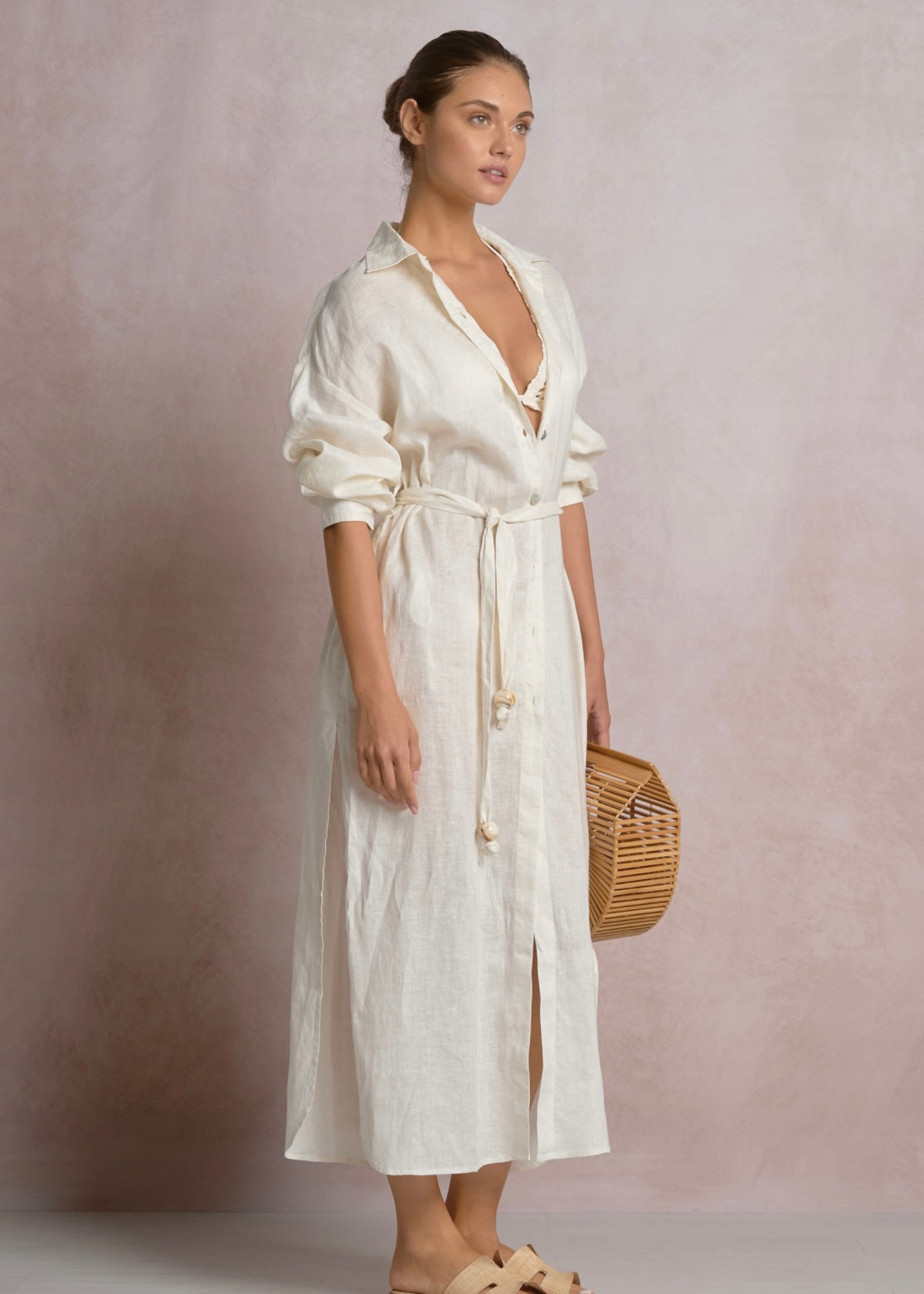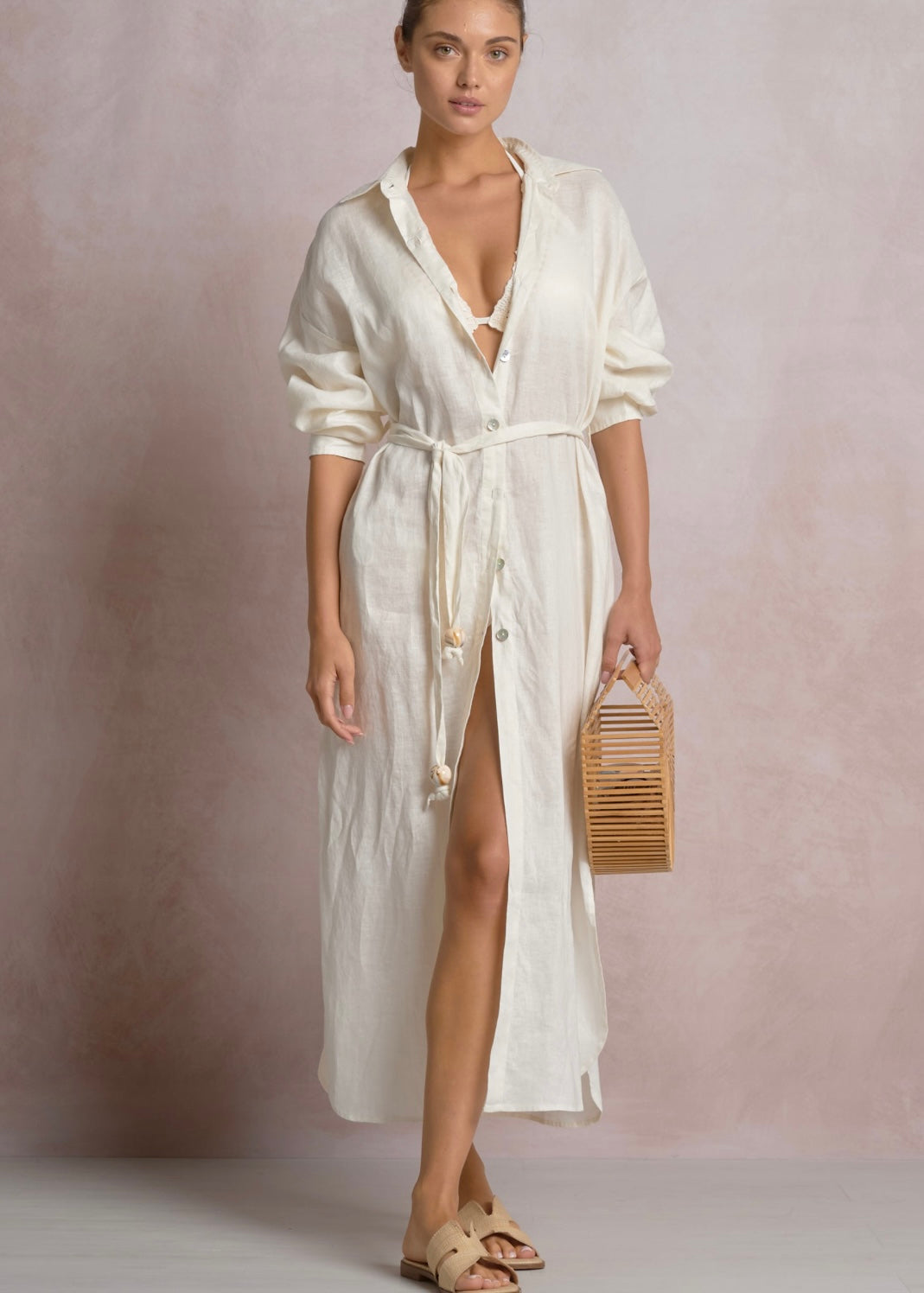 Made of 100% linen, this dress can be worn open as a cardigan over your bathing suit, or buttoned up as a dress for a casual yet chic look