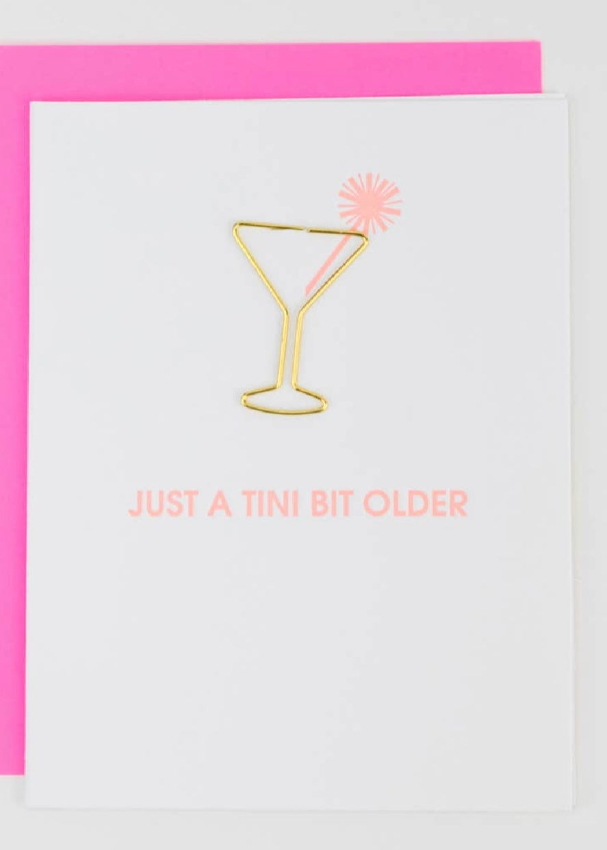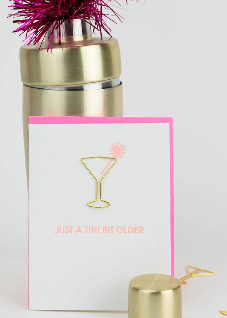 • Our “Just a Tini Bit Older” card is the ultimate birthday toast, letterpress printed on a vintage printing press in sunny California. Featuring sunset pink ink and paired with a bold pulsar pink envelope, this playful favorite comes with a reusable gold martini glass paper clip—perfect for holding cash, a gift card, or saving as a keepsake.