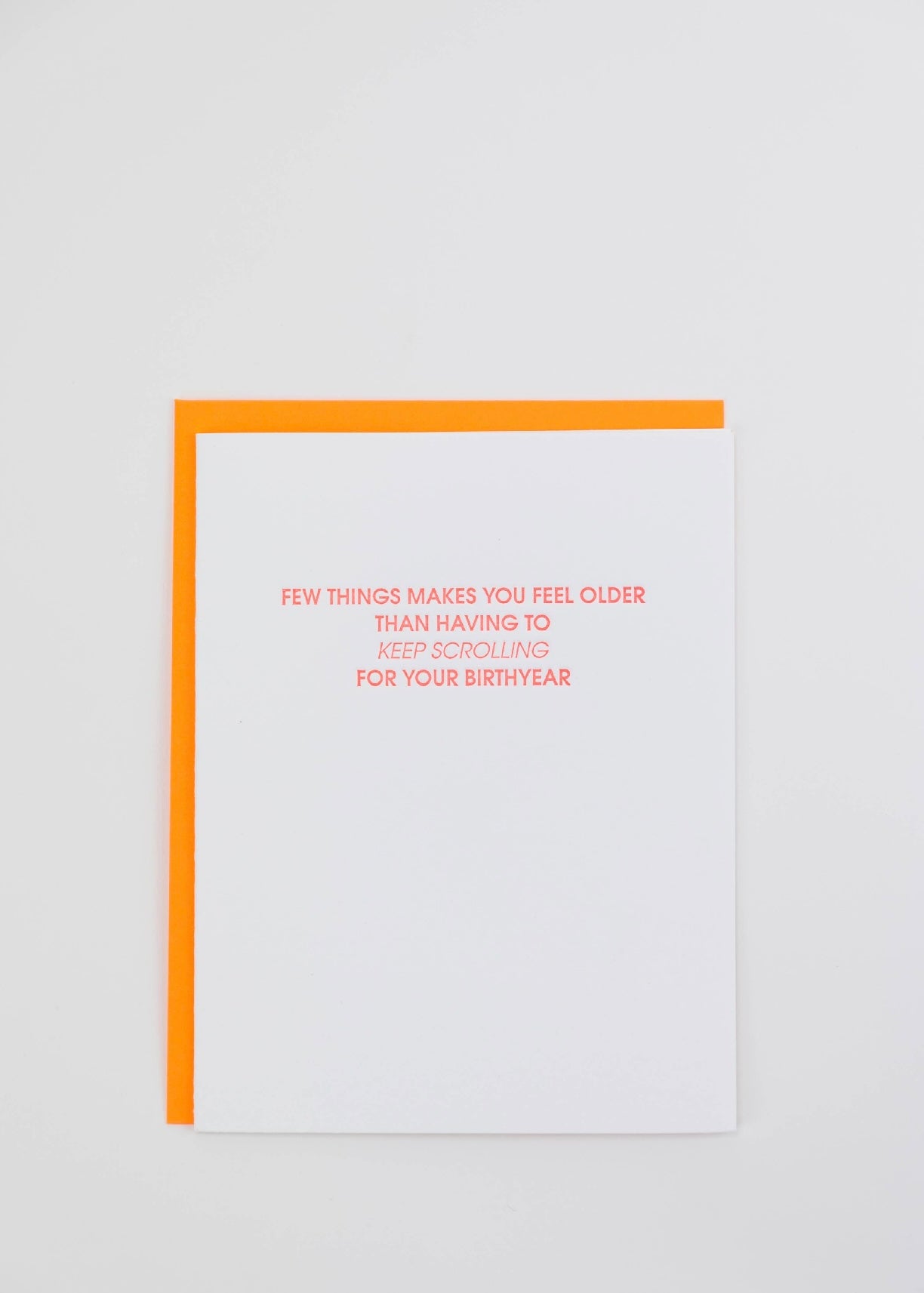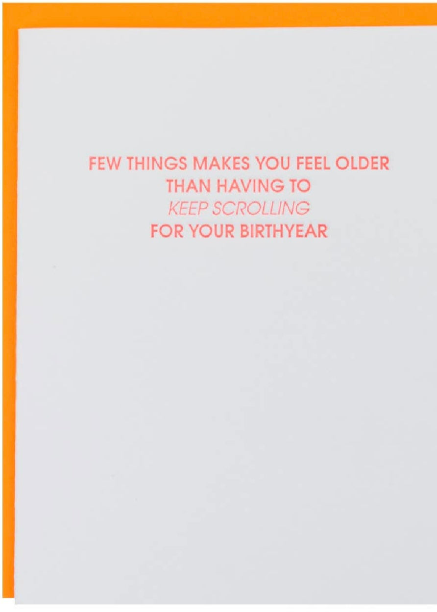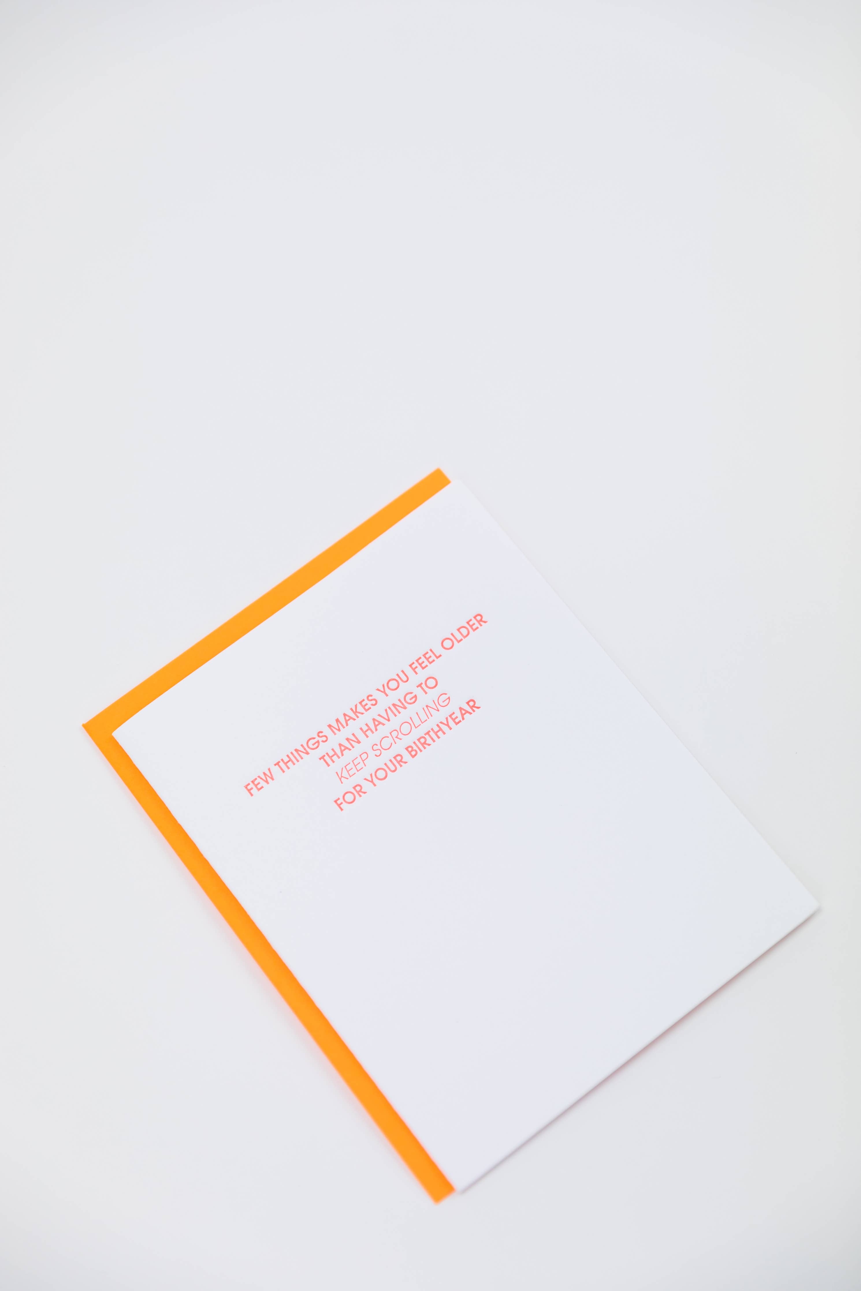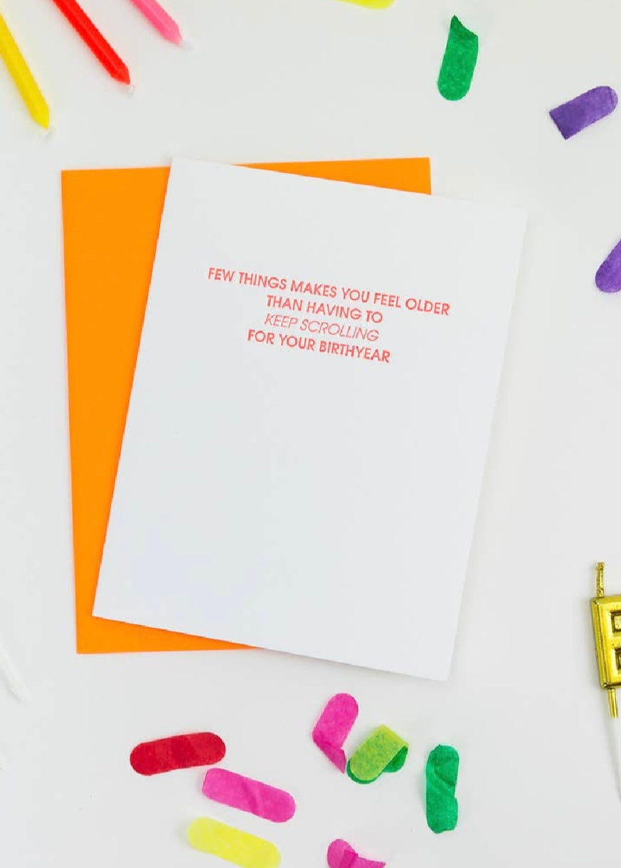 Few things make you feel older than having to keep scrolling to find your birth year. Our “Keep Scrolling Birthyear” card is letterpress printed on a vintage printing press in sunny California. Featuring bold neon orange ink with a matching neon orange envelope, this snarky birthday card says what everyone’s thinking.