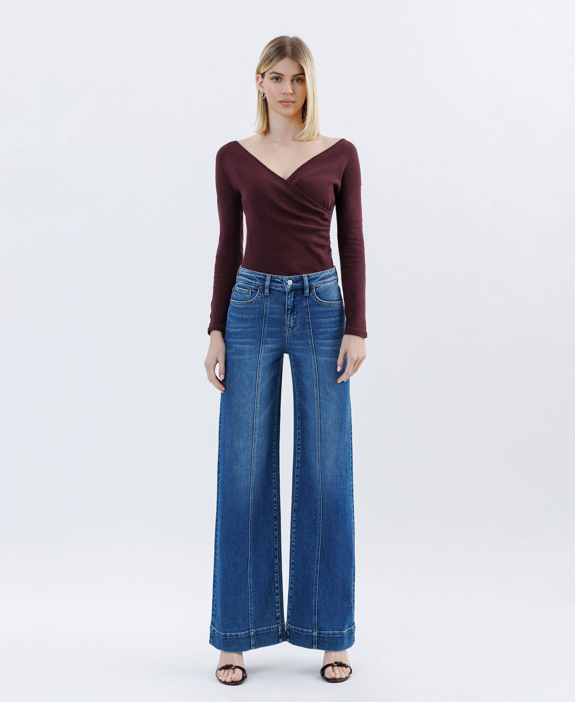 Expertly crafted with comfort stretch denim, these High Rise Trouser Hem Jeans by Flying Monkey offer a wide leg silhouette and full length coverage