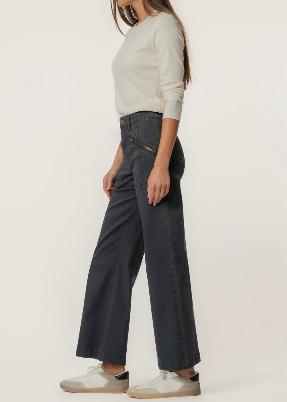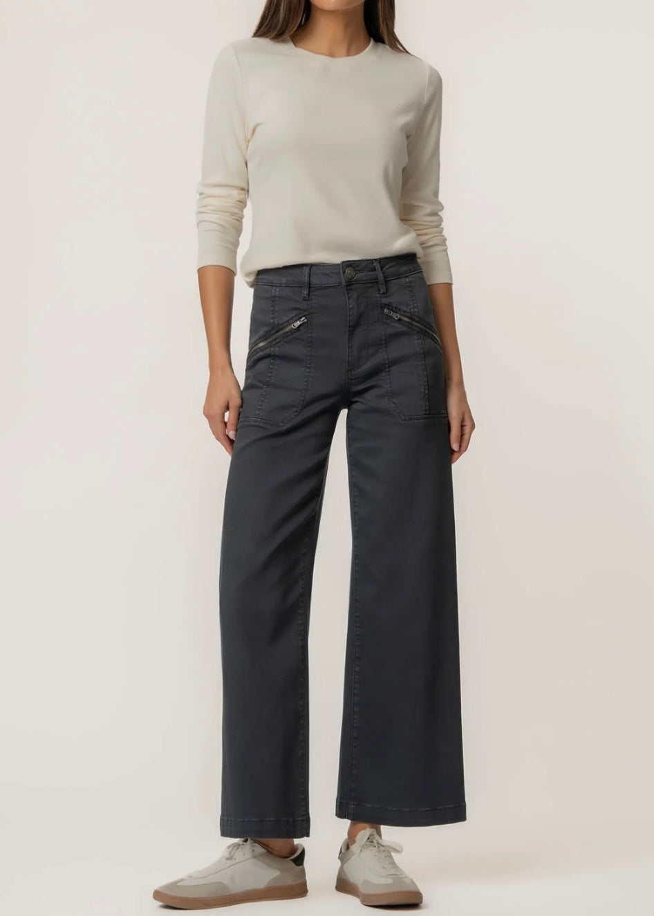These high-rise wide leg jeans in a sleek black wash combine modern style with all-day comfort. Designed with functional pockets with zippers, they add a bold, utility-inspired touch. Made from very stretchy fabric, they move with you while keeping their shape.