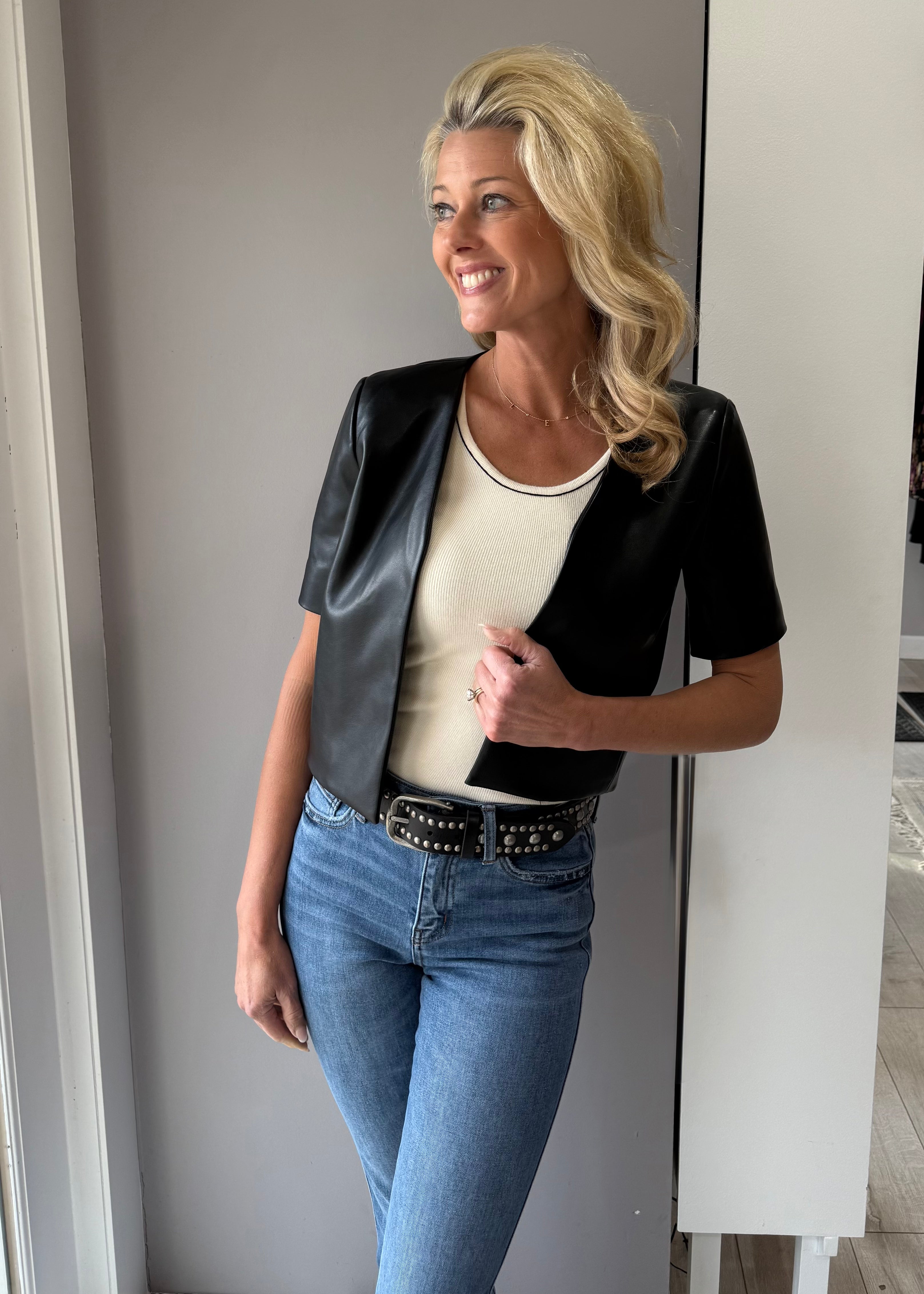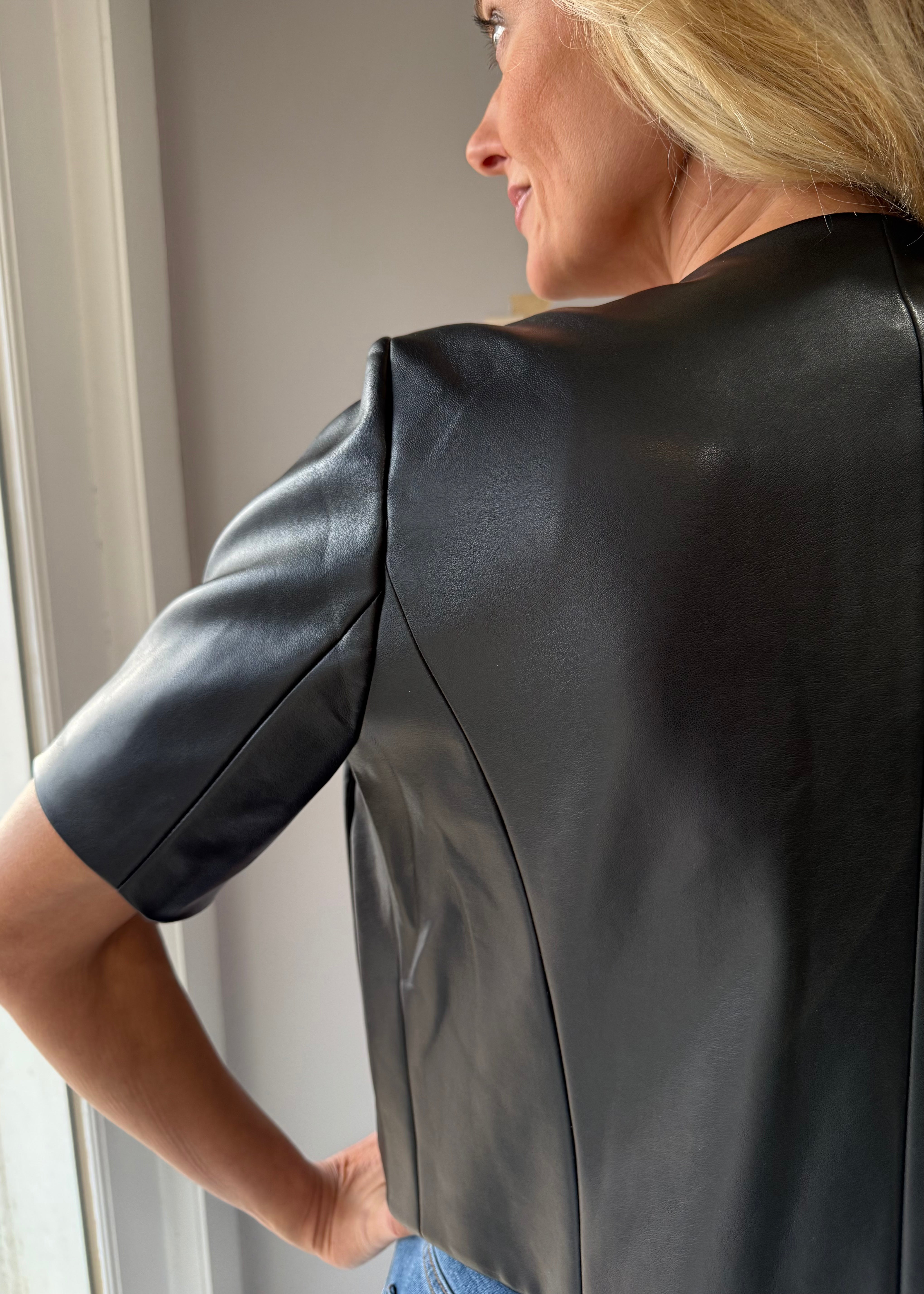 Black The Bella Jacket features a black, collarless design with short sleeves and a pleather exterior that mimics the appearance of genuine leather