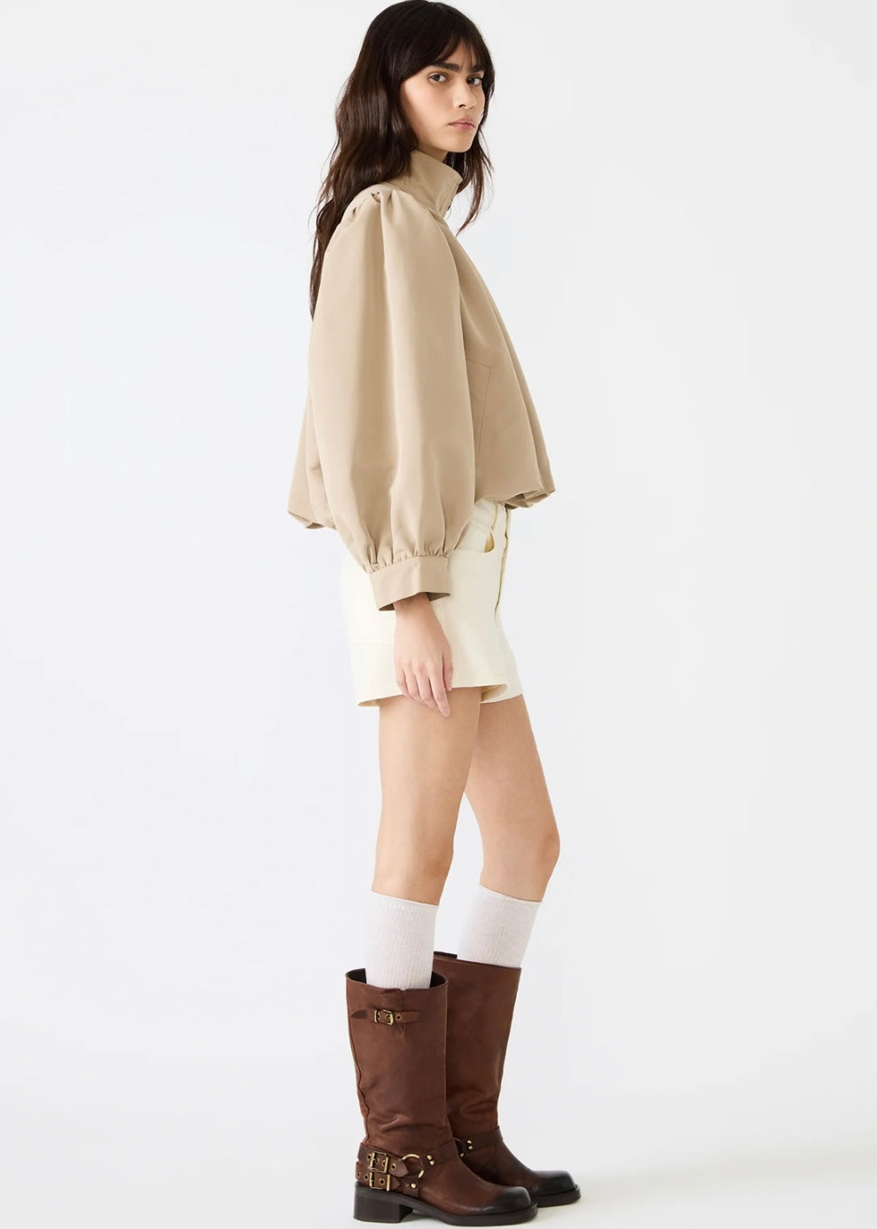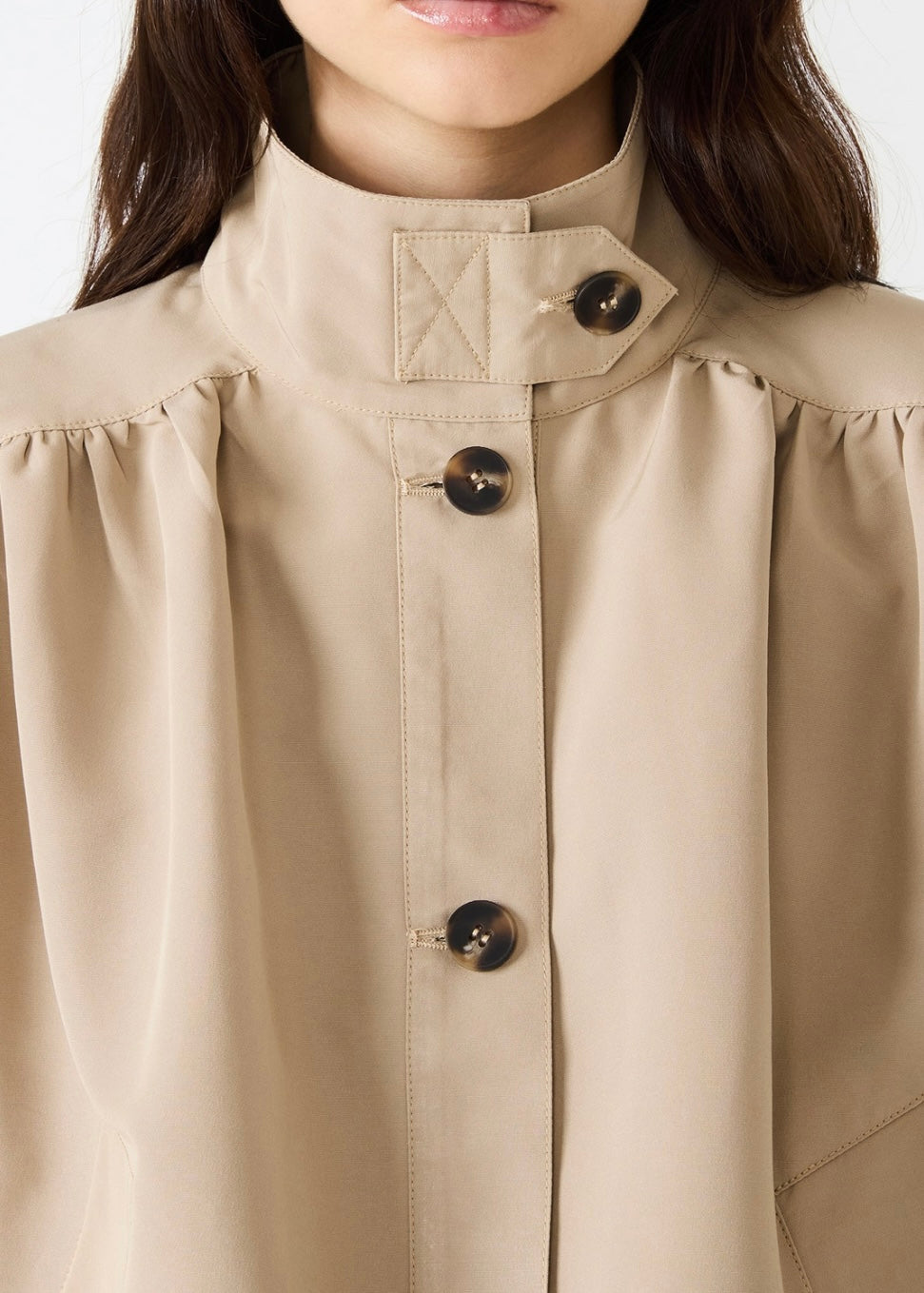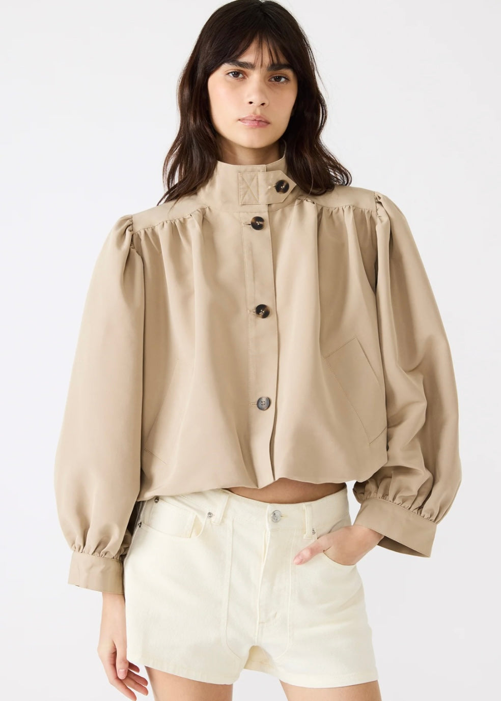 This jacket is a tailored button-up jacket that features a classic collared neckline and structured silhouette in a versatile tan hue. The front button closure provides easy styling flexibility, while the refined collar adds polish to any ensemble. Perfect for layering over basics or dressing up casual pieces, this wardrobe essential transitions seamlessly from day to evening. The timeless design and neutral colorway make it an invaluable addition to any modern wardrobe.