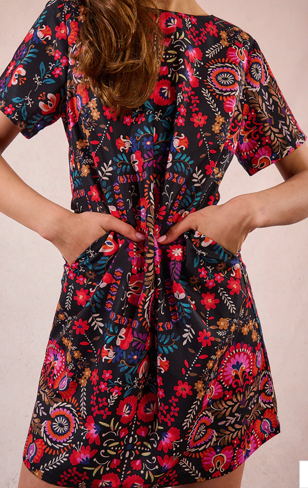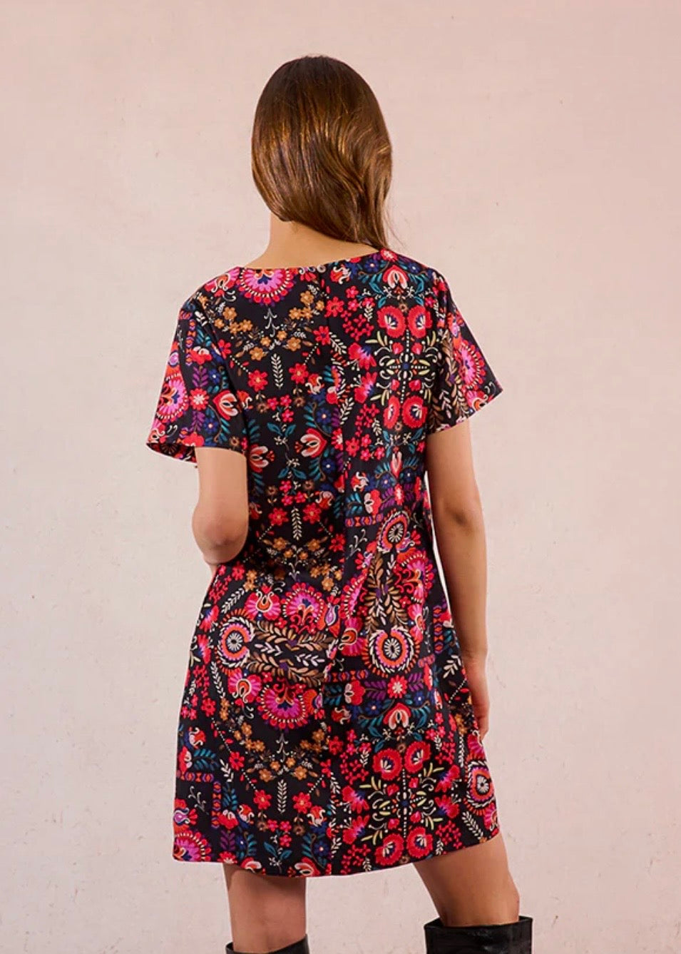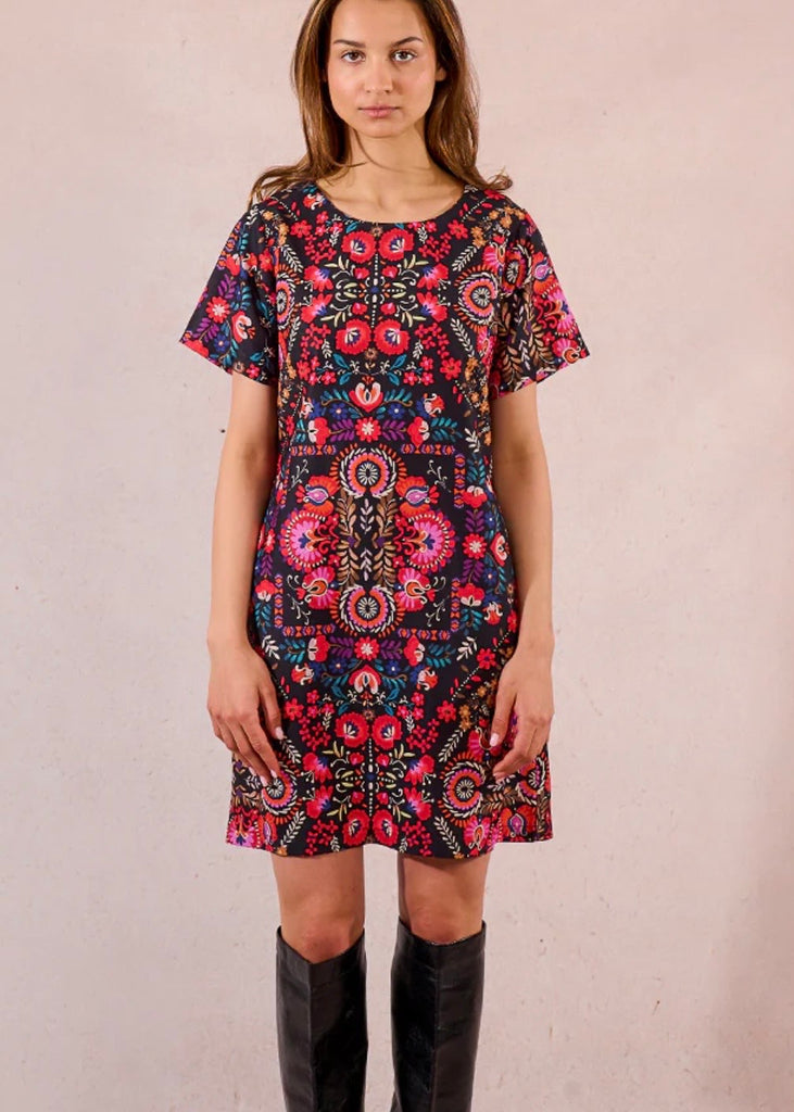 The Irina Dress features a round neckline, short sleeves, and an ethnic print in a t-shirt cut