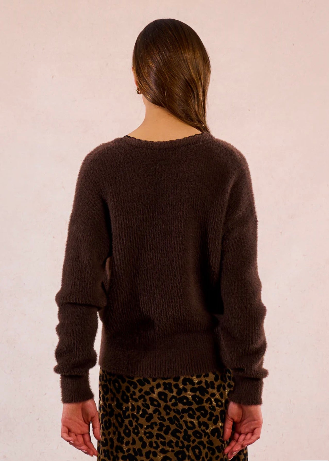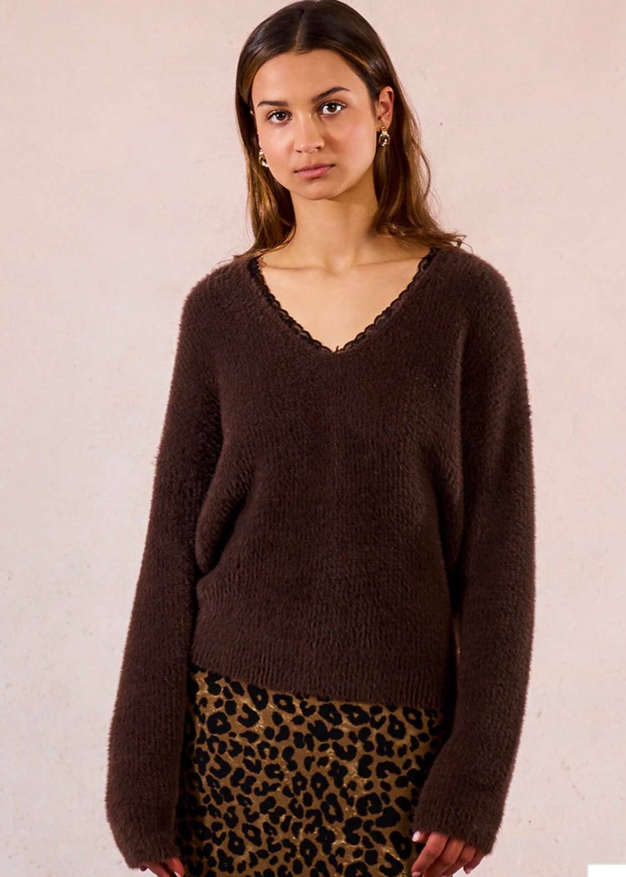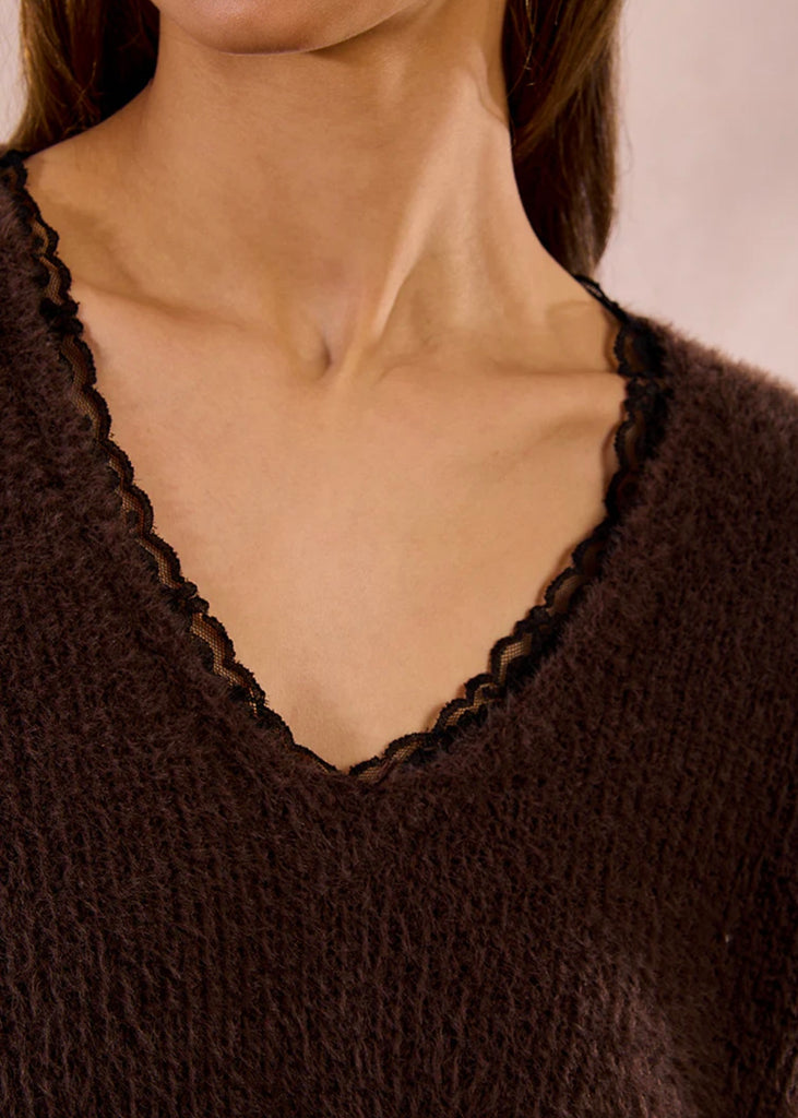 Cozy up in the Molly Sweater, where playful fluffiness meets a delicate touch. Featuring long sleeves and a flattering V-neckline trimmed with charming lace, this straight-fit sweater adds a fun and feminine twist to your chilly-day wardrobe. Perfect for layering or wearing solo, it’ll keep you comfy and cute all season long!