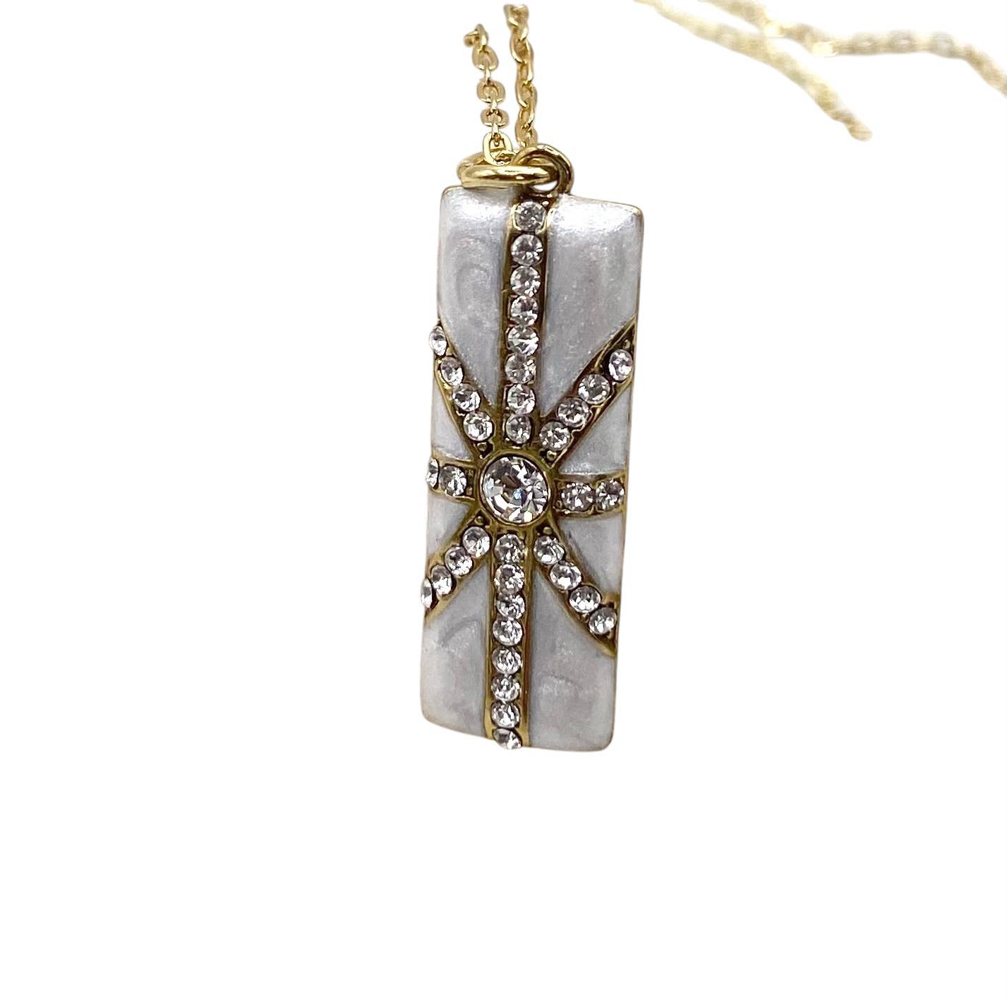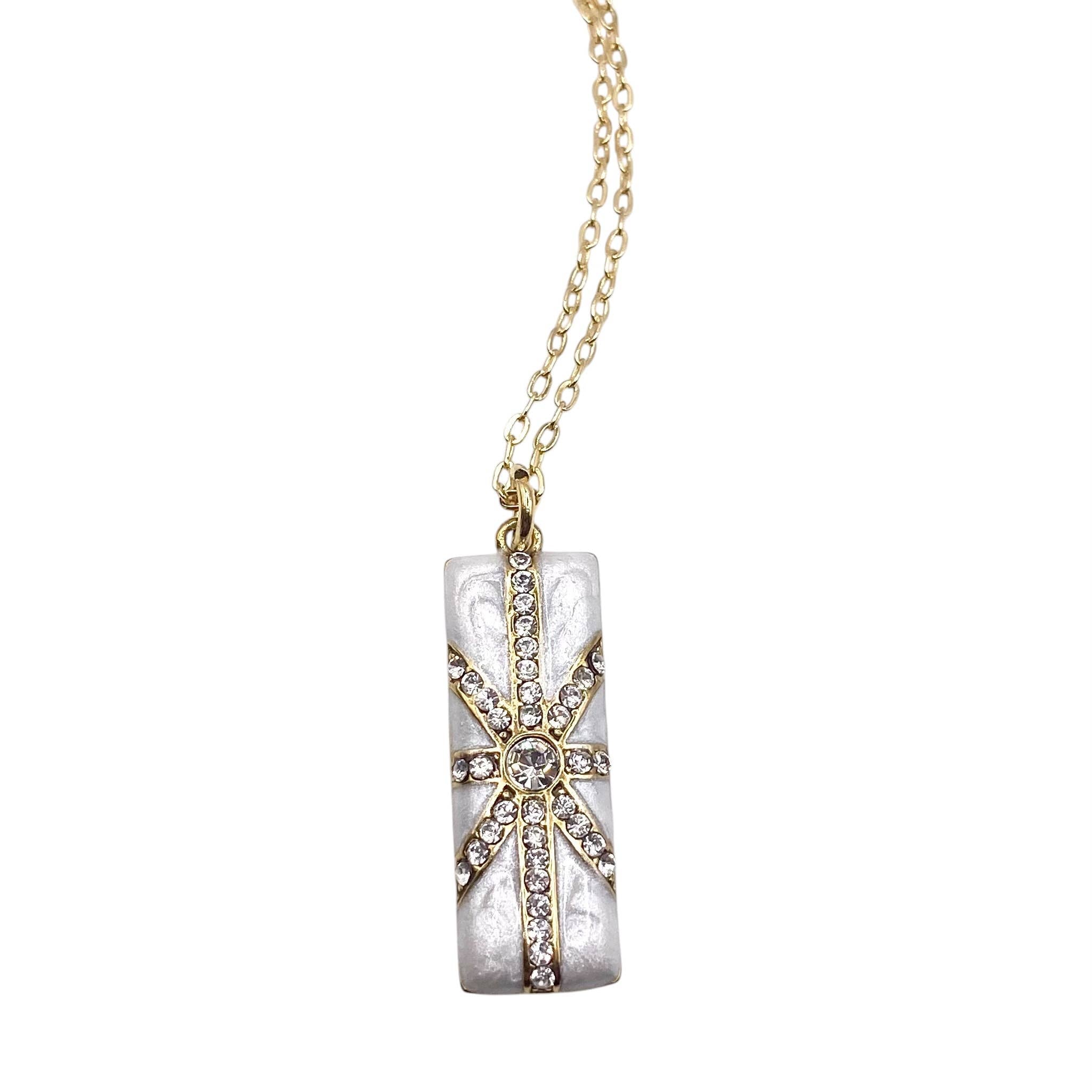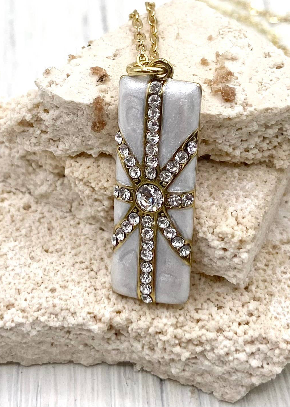 This chic piece blends modern charm with vintage sparkle — featuring a glossy enamel bar accented with a crystal-studded starburst and luxe gold detailing