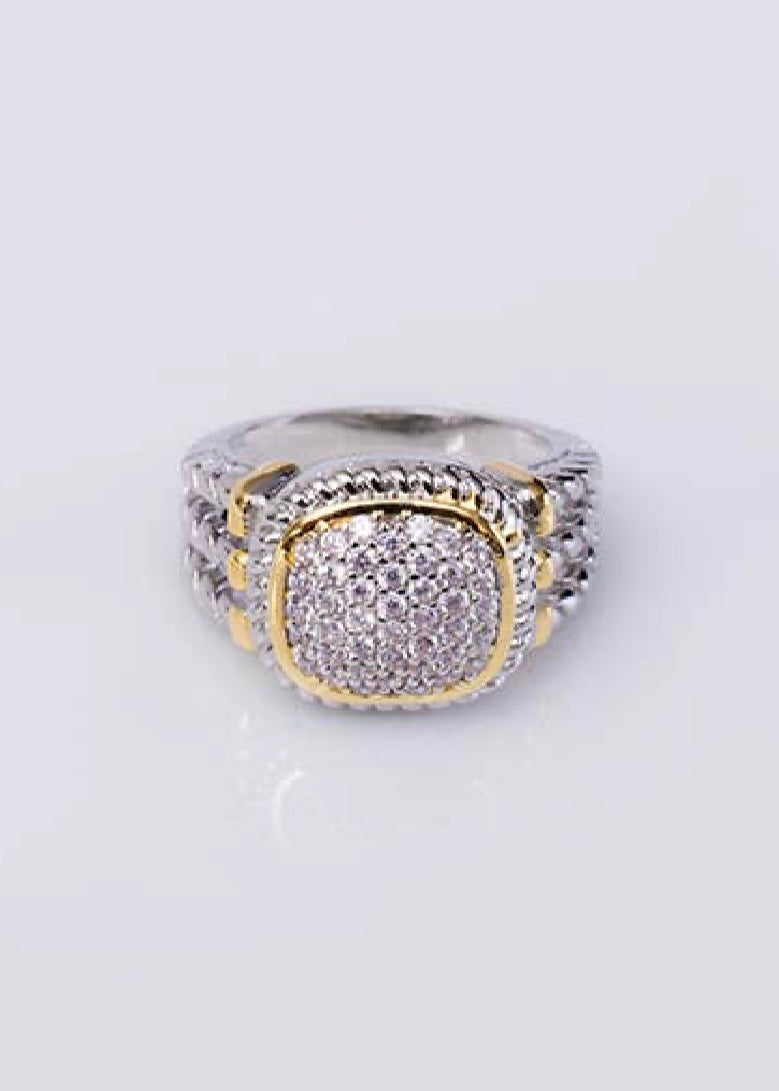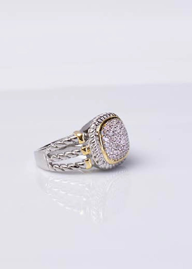 Lovely 2 tone pave ring Cabled shank Nicely framed Rhodium plated Avail in sizes 6,7,8