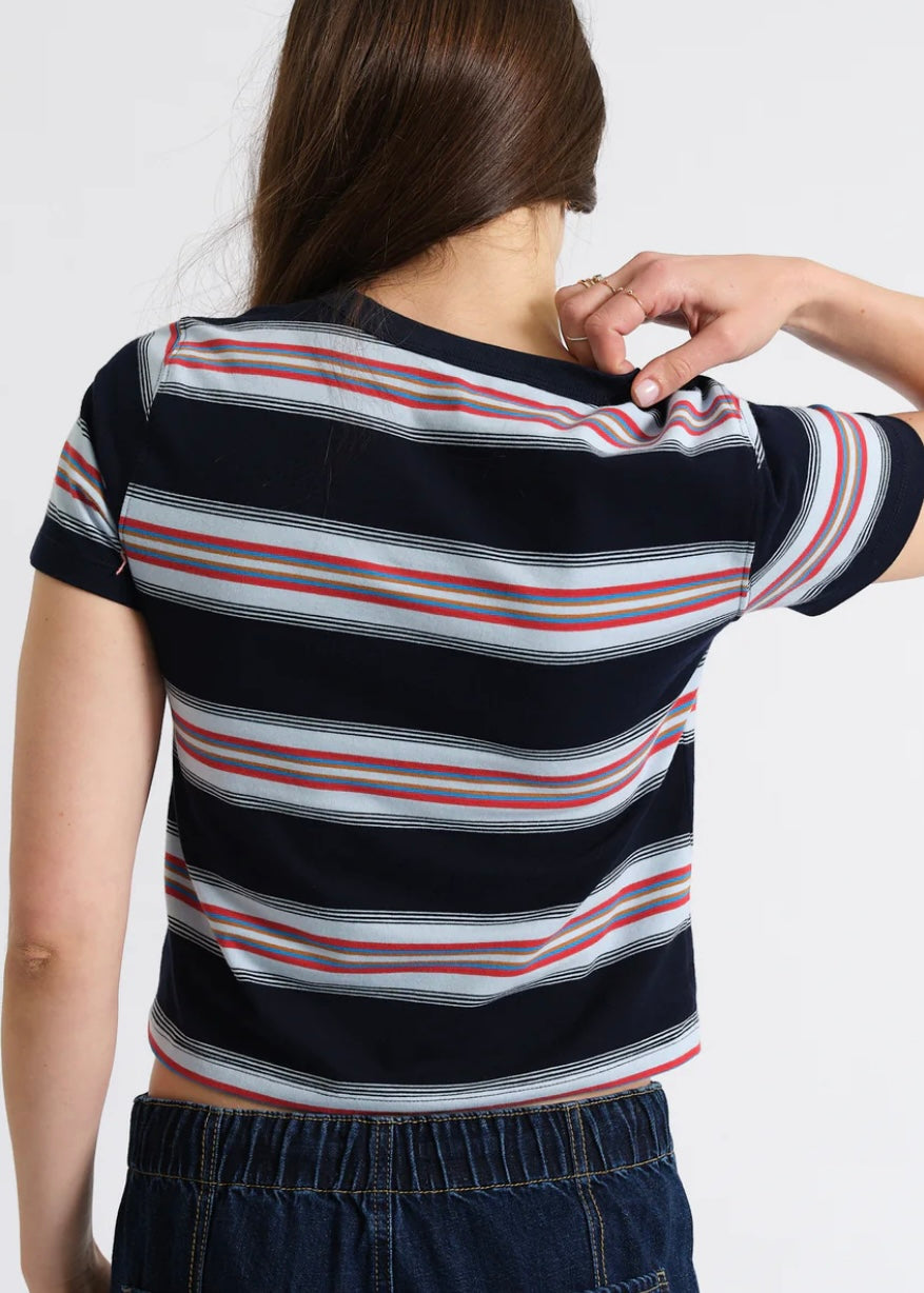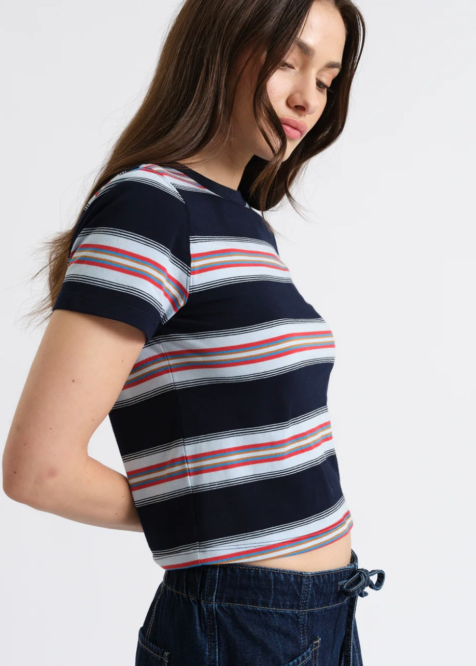 The Zuma Short Sleeve Crew Neck Tee is an everyday essential with a playful edge. Designed with a classic crew neckline and fitted silhouette, this tee features a shadow stripe pattern that adds just the right amount of visual interest while still styling like a neutral. Easy, flattering, and endlessly wearable, it’s the kind of top you’ll reach for on repeat.