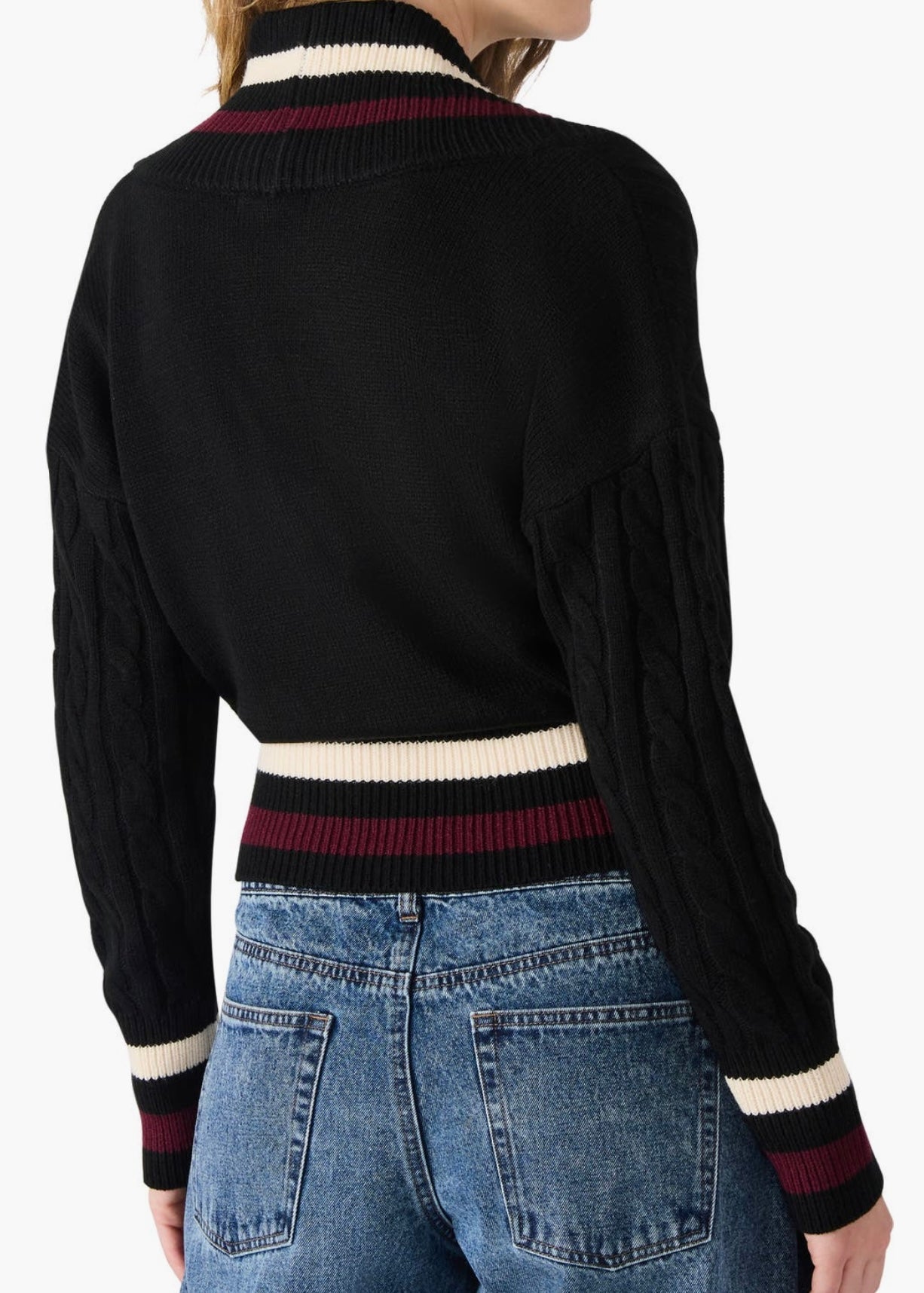 Accented with varsity-inspired striping, ADDISON is a versatile pullover sweater with a faux wrap that you can wear on or off the shoulders.