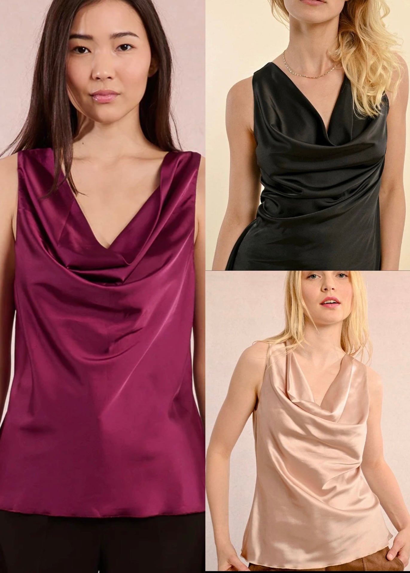 Made with soft satin and a wide cowl neck, this sleeveless top is perfect for a night out.