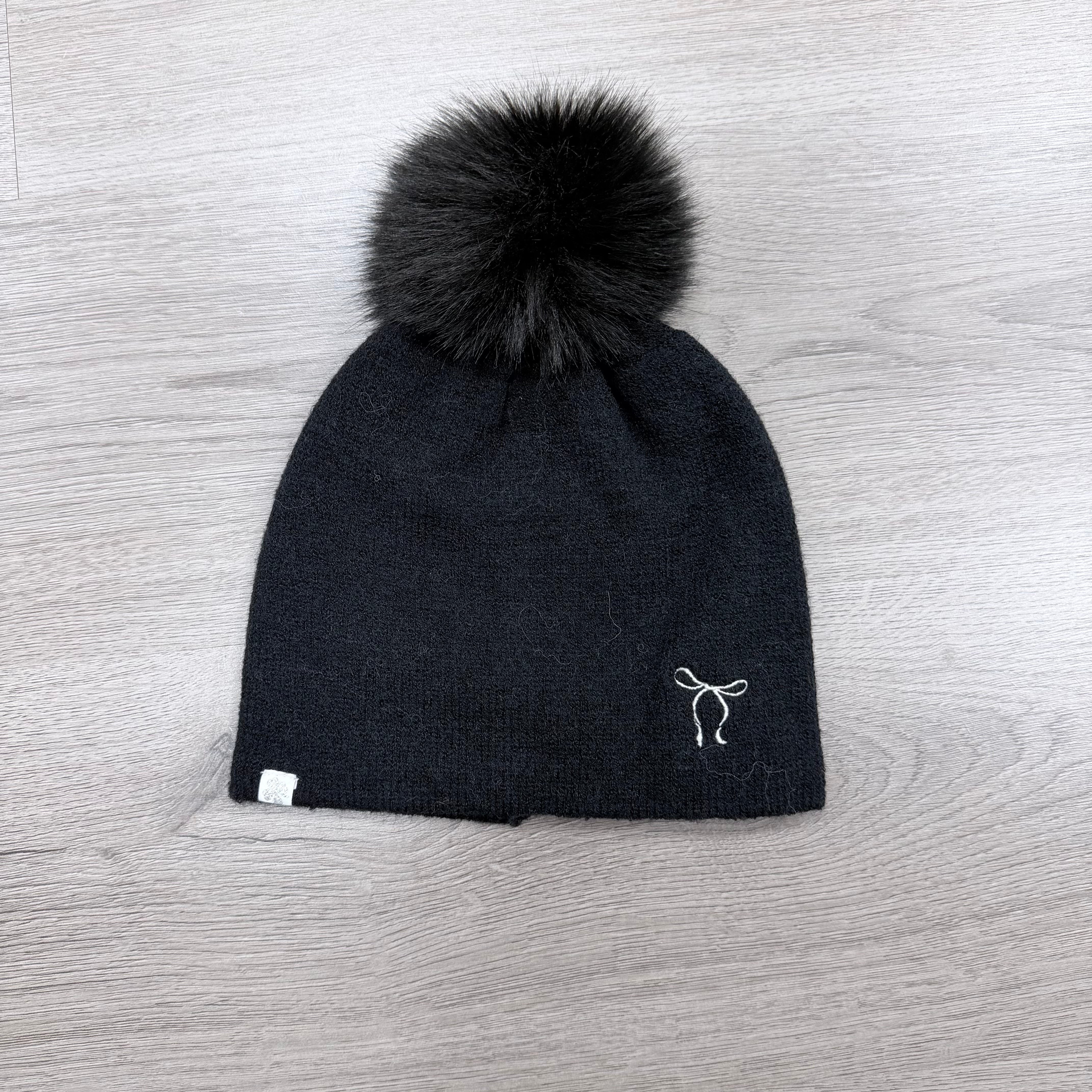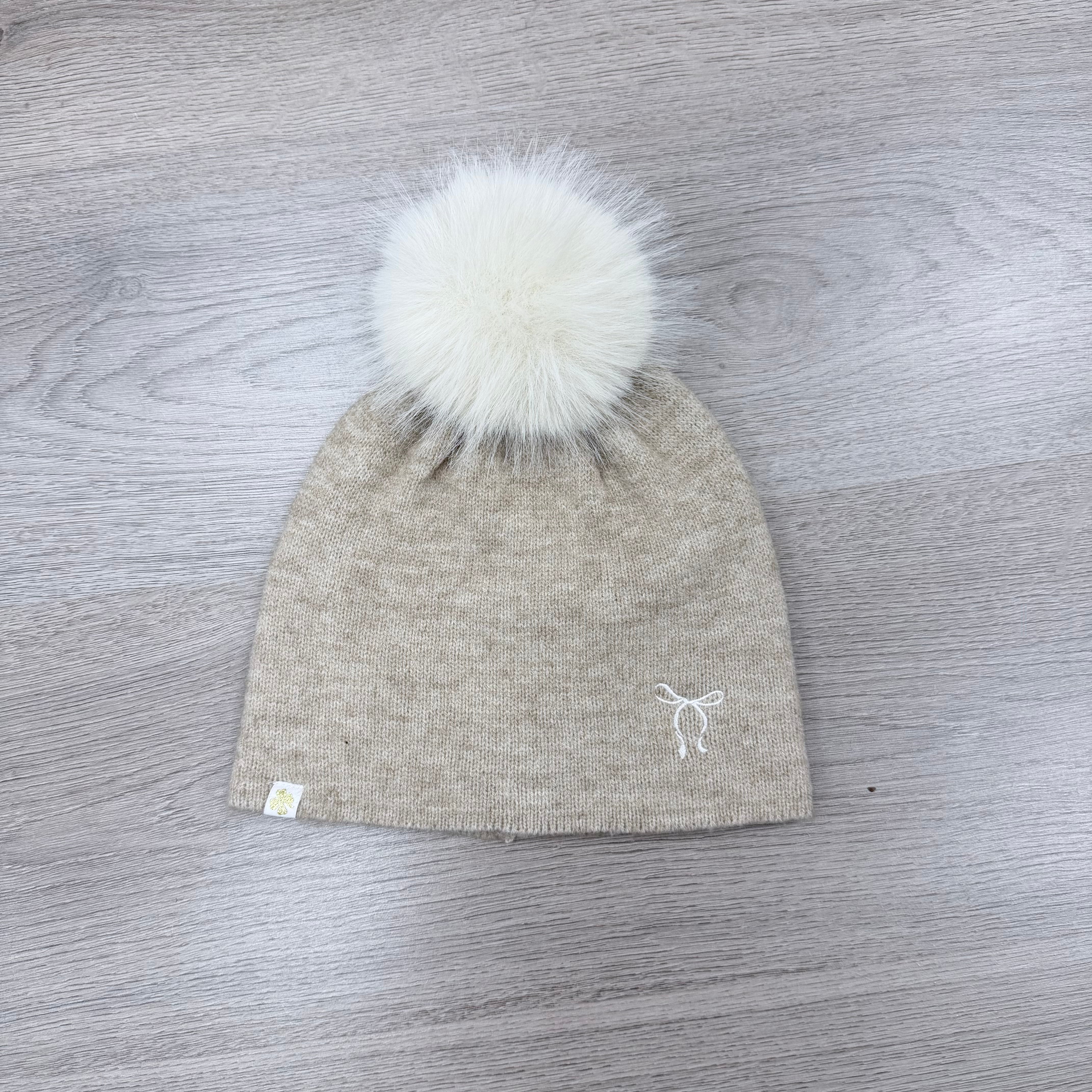 This knitted cap features a big, fluffy pompom on top and a charming embroidered bow on the side for an extra touch of fun