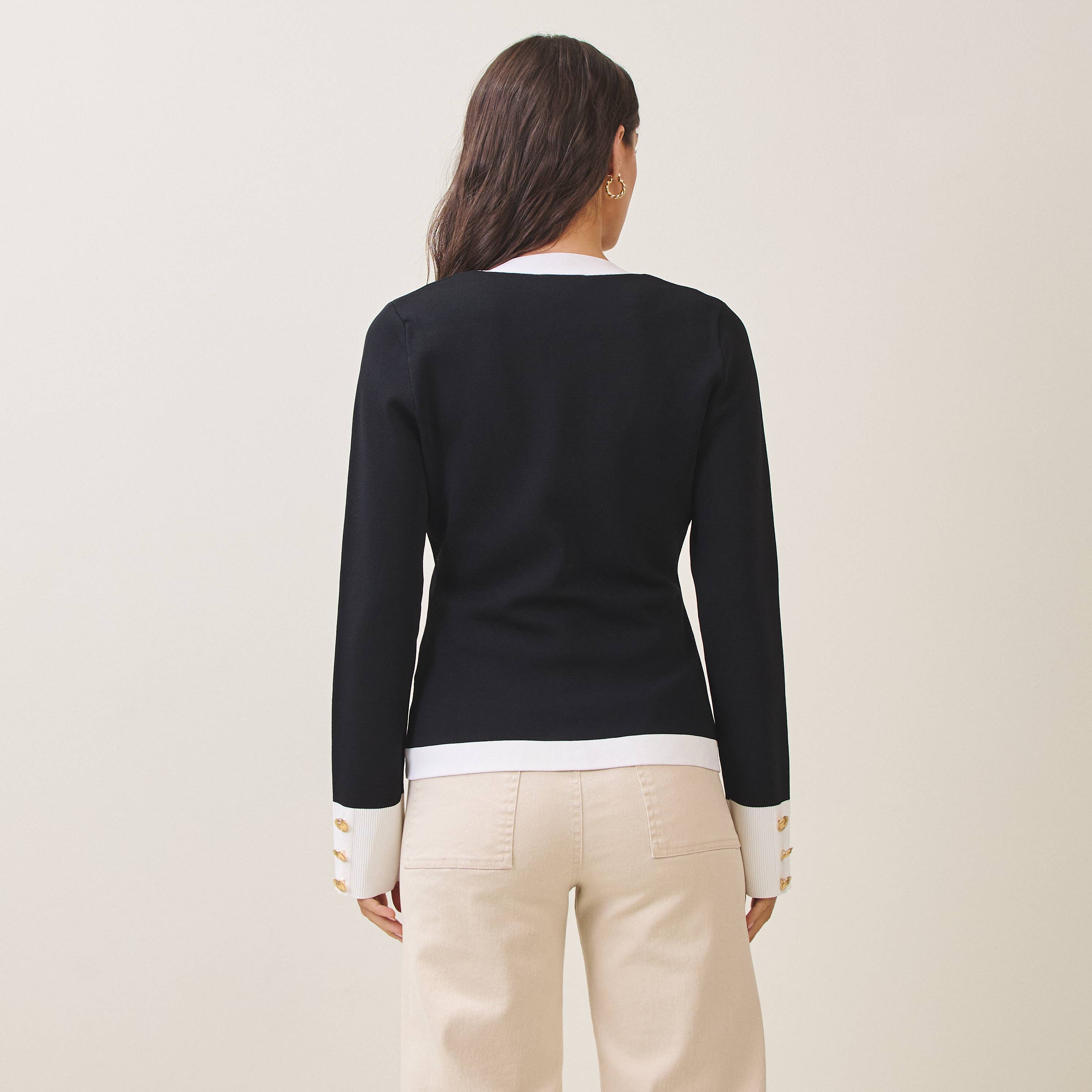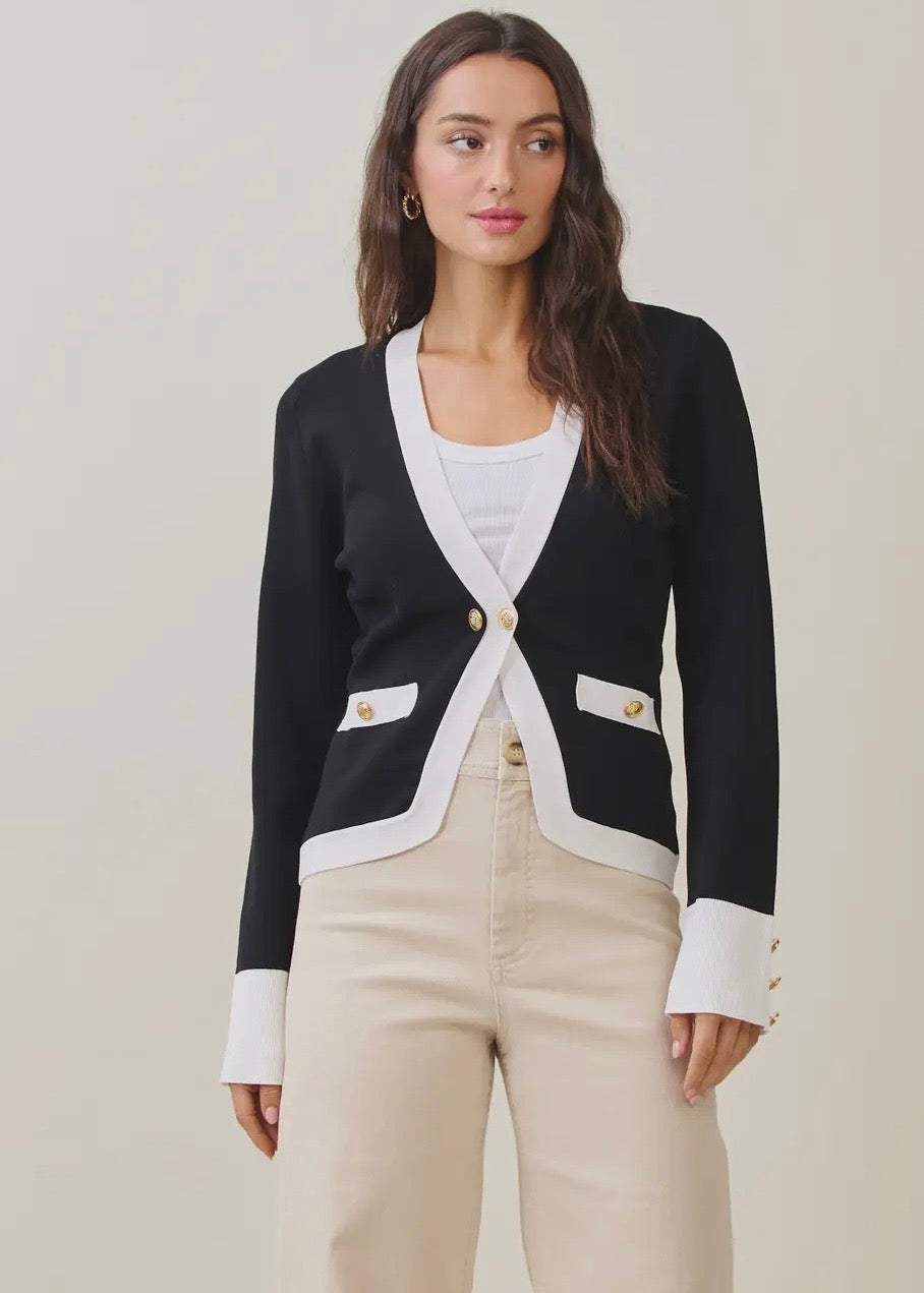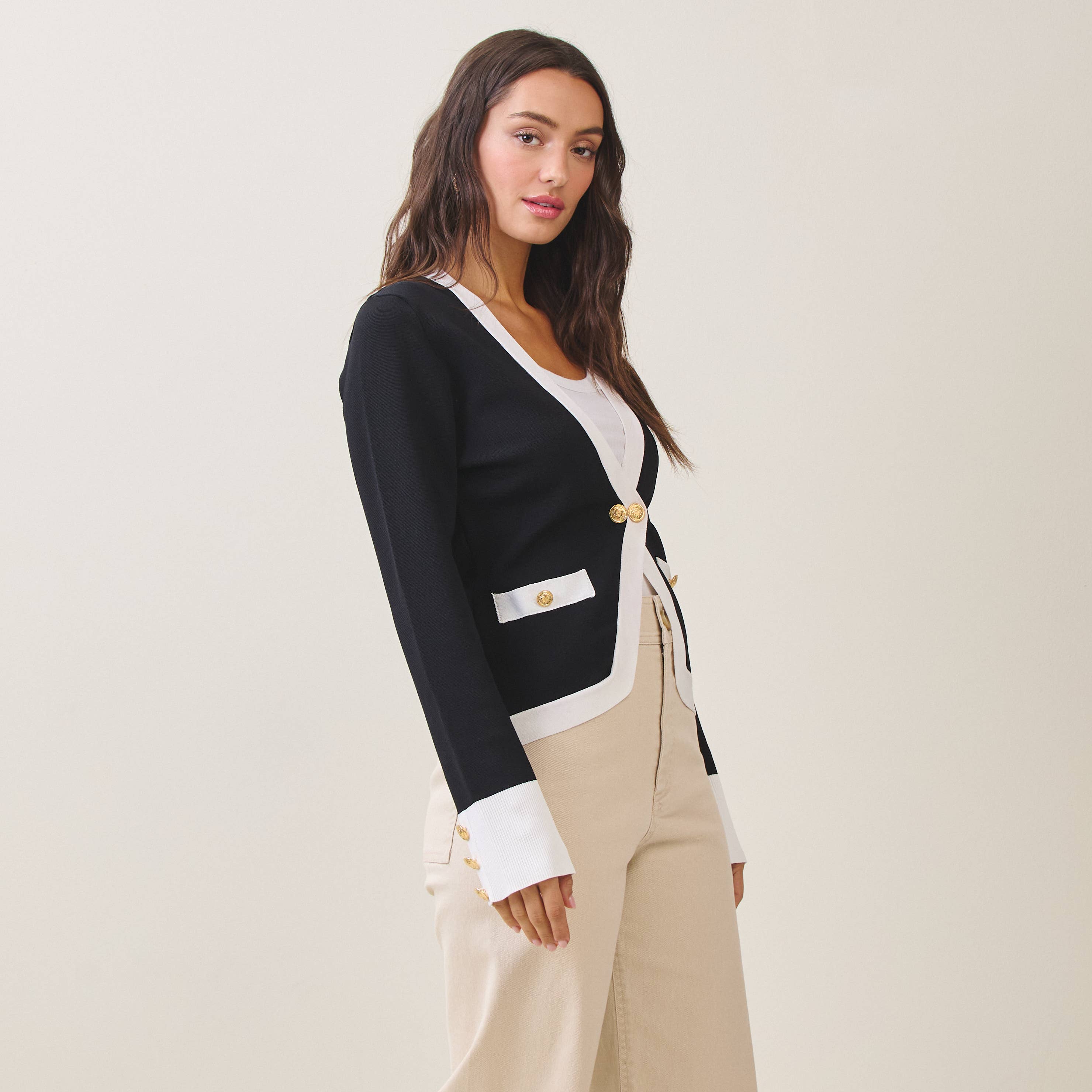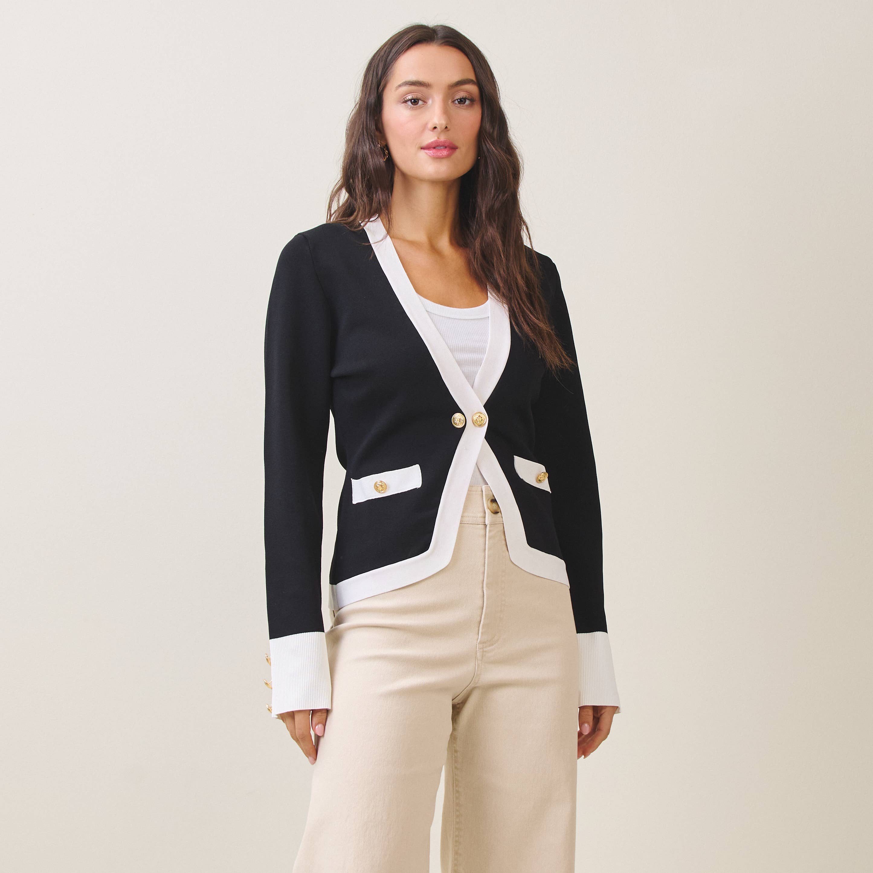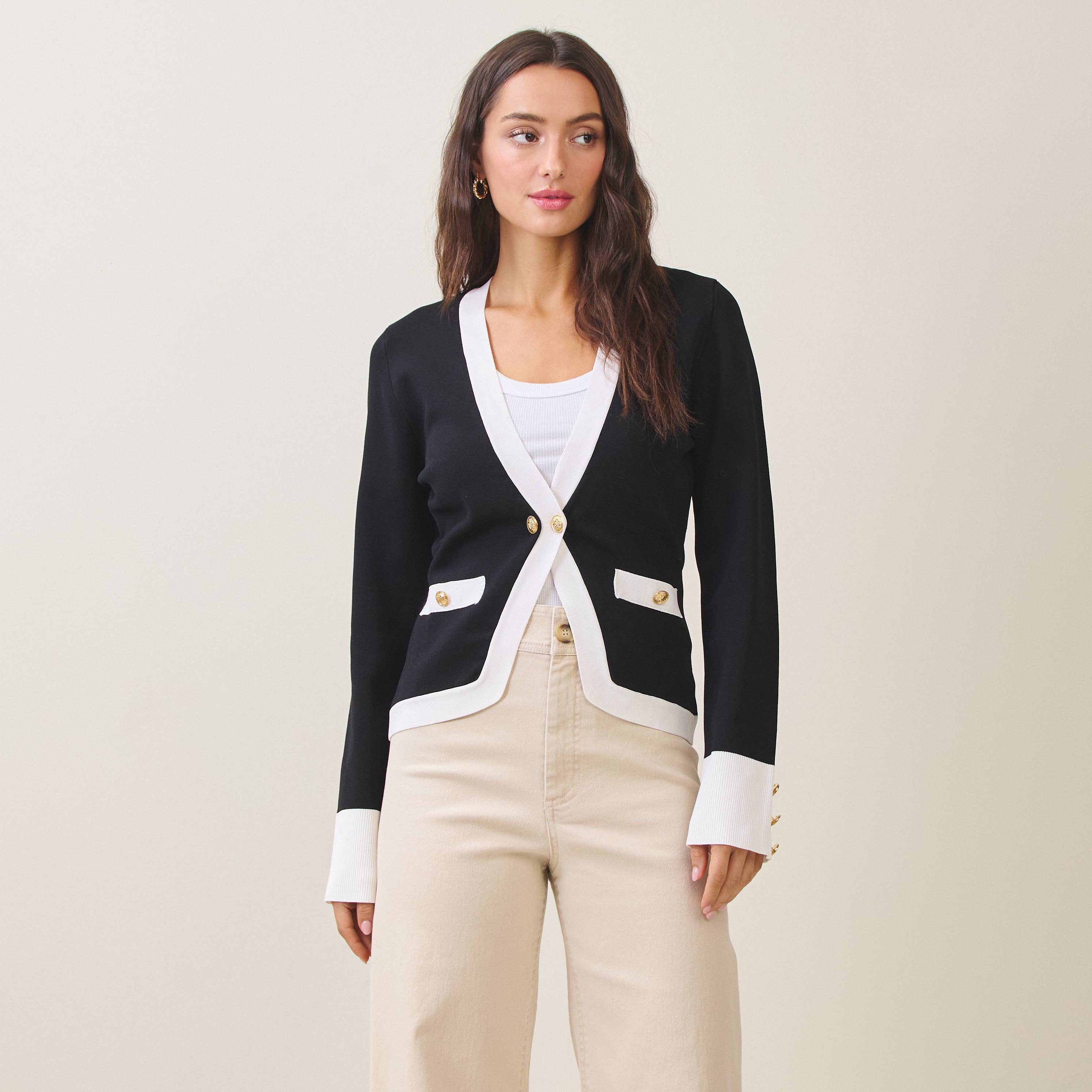 This comfortable sweater jacket features a stylish colorblock design and two-tone knit fabric