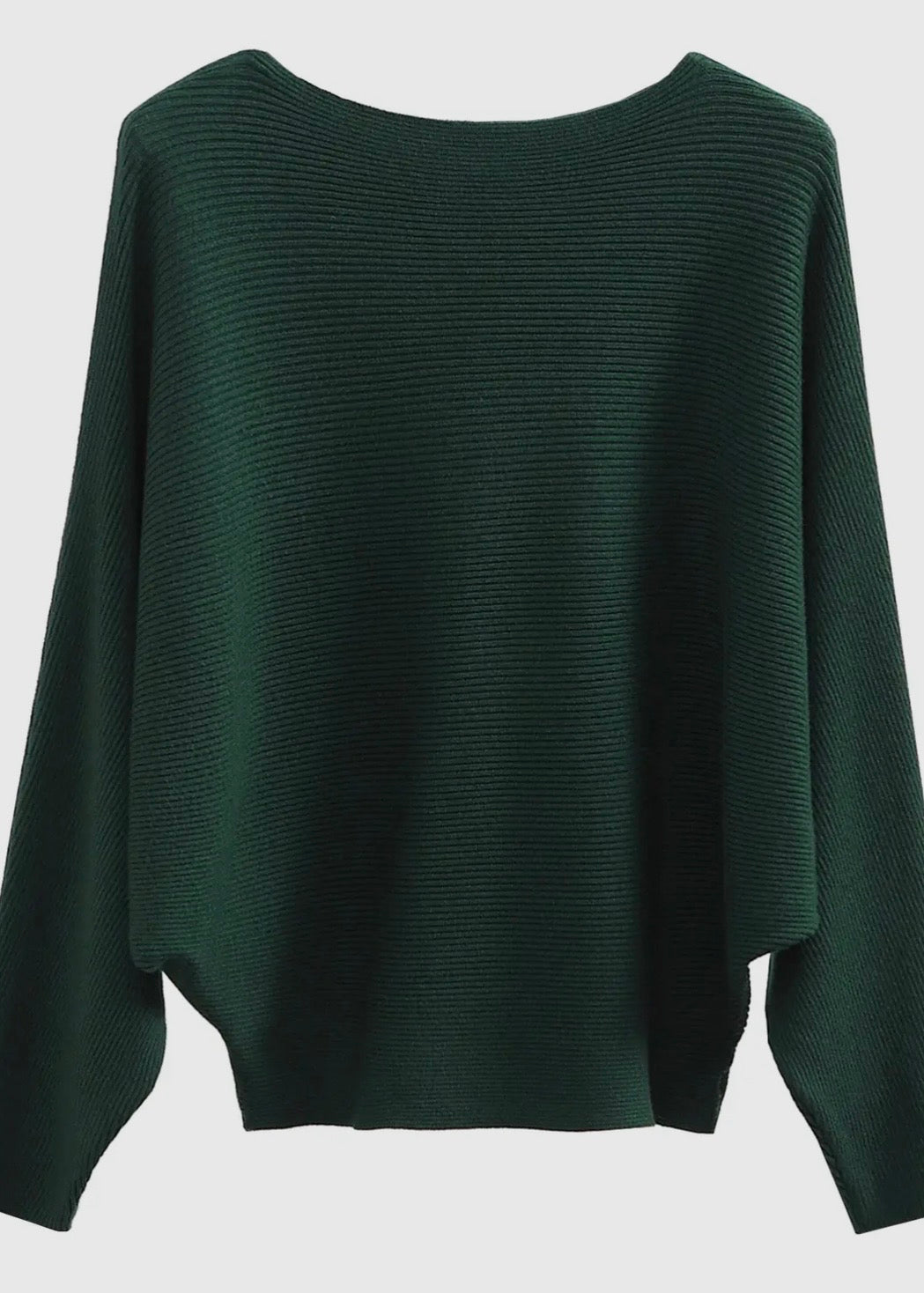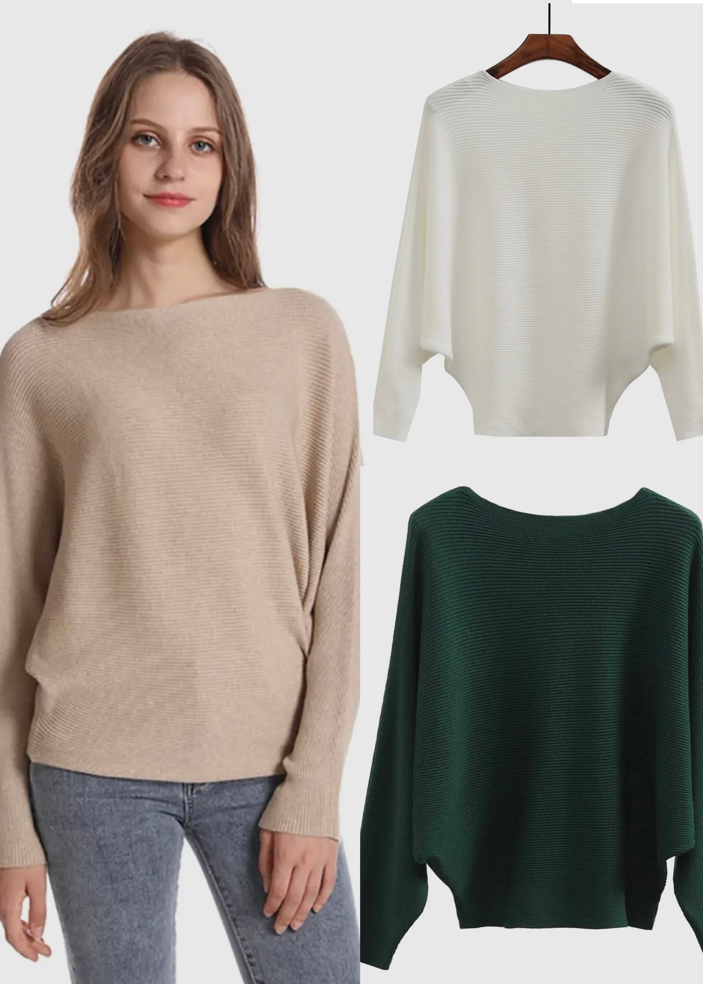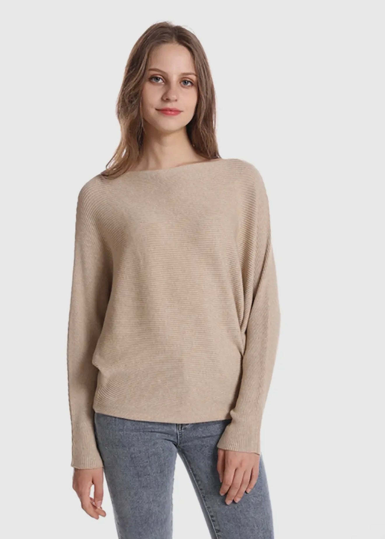With a boat neck, dolman sleeves and ribbing material, this versatile sweater is perfect for work or weekend wear