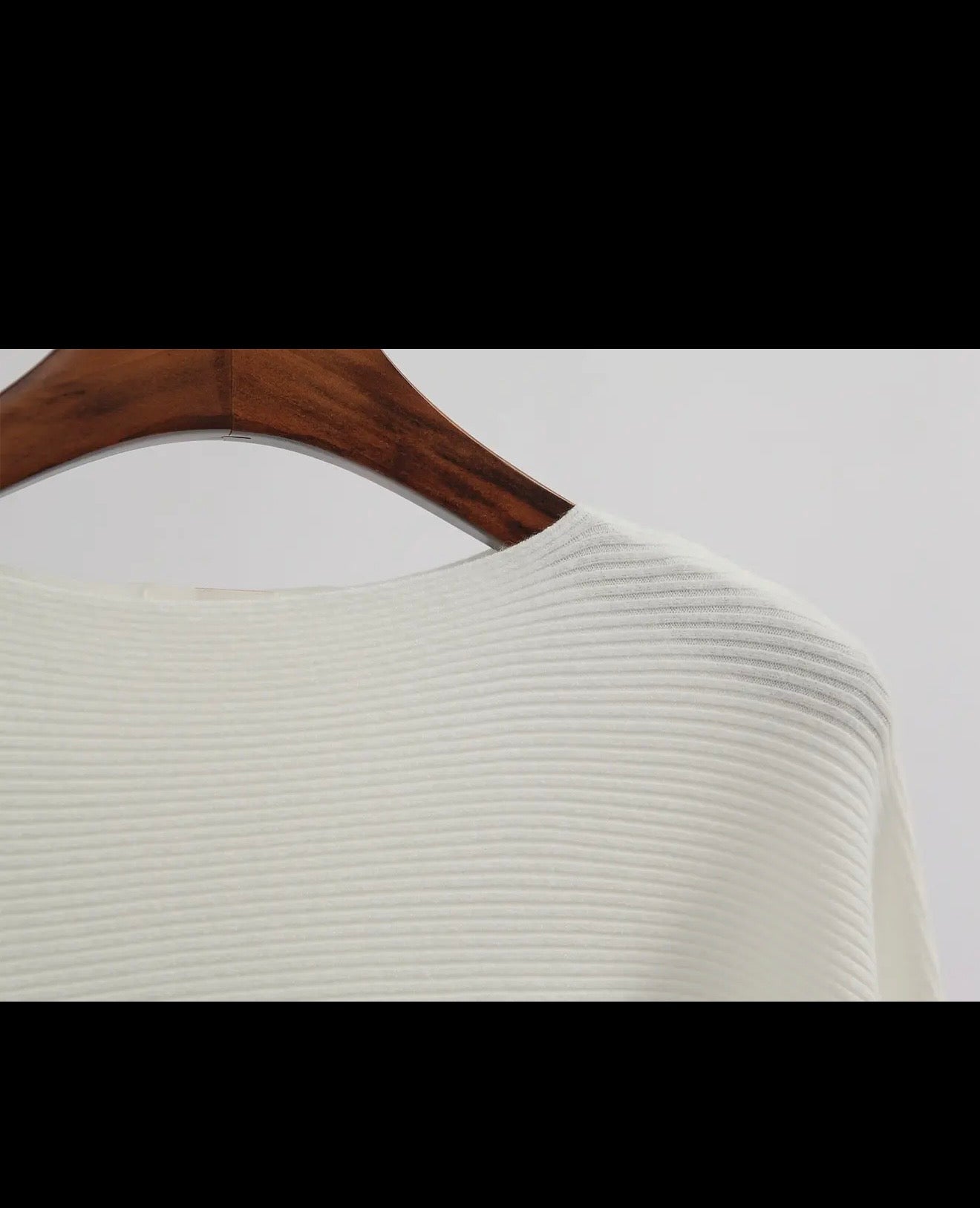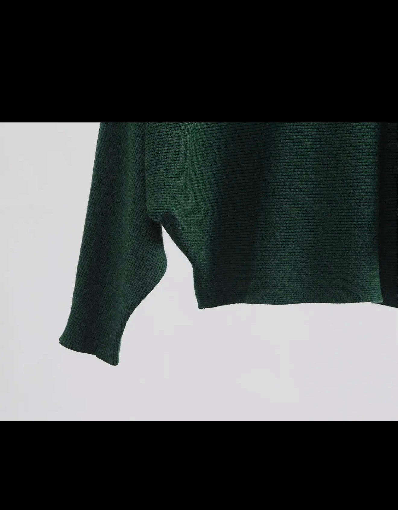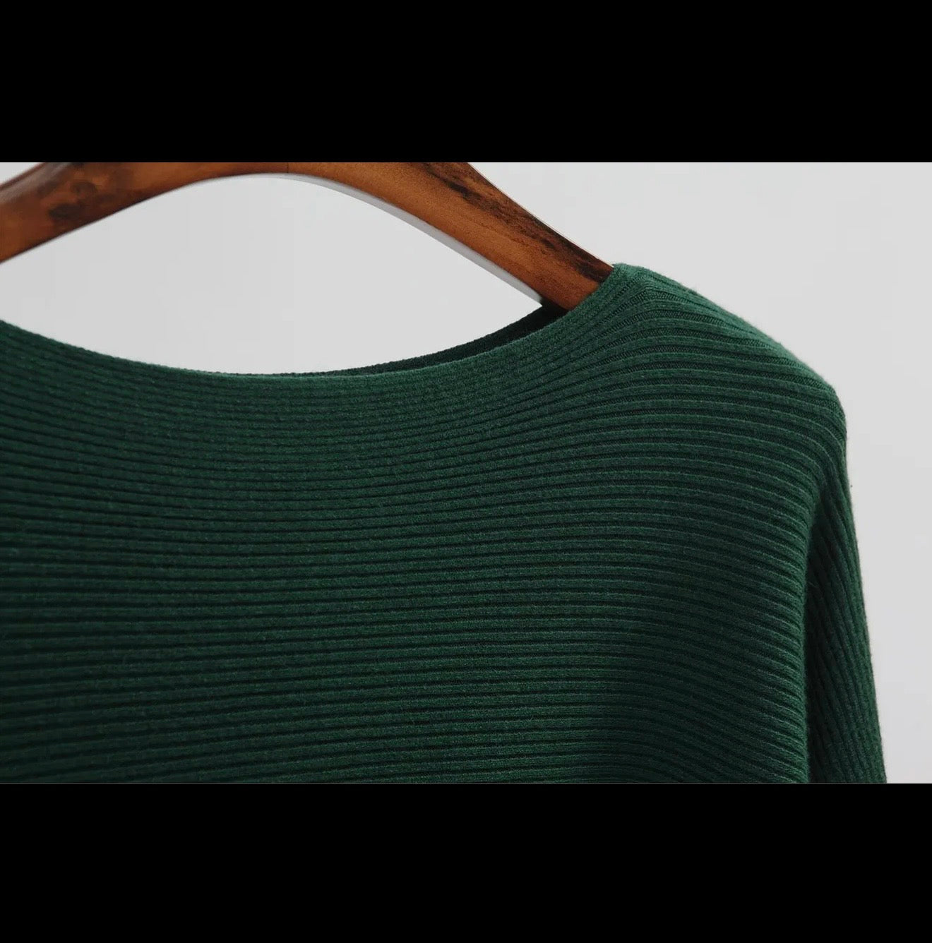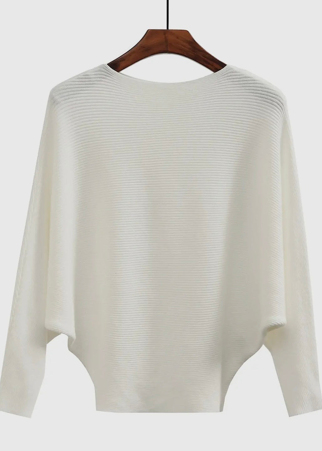 With a boat neck, dolman sleeves and ribbing material, this versatile sweater is perfect for work or weekend wear