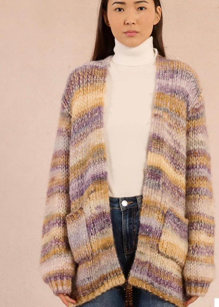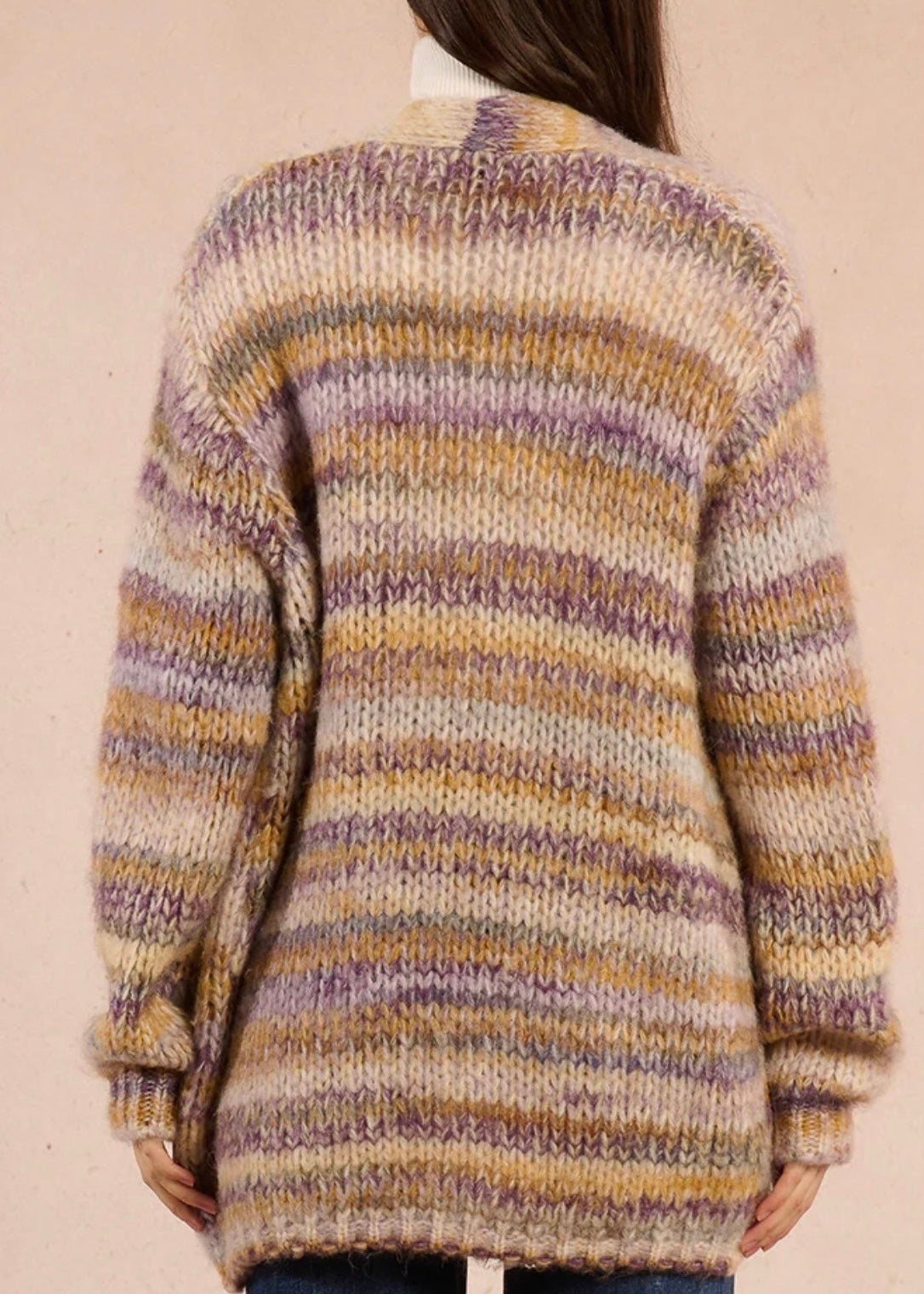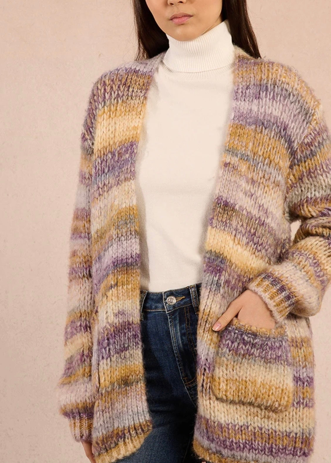 • Throw on the Rowan Cardigan and let the good vibes flow. This oversized open knit beauty drapes effortlessly over everything in your closet, with long sleeves that feel like a cozy hug and a playful multicolor palette that keeps things interesting. Practical patch pockets on the low front sides mean you've got somewhere to stash your essentials—or just your hands when you're feeling chill.
