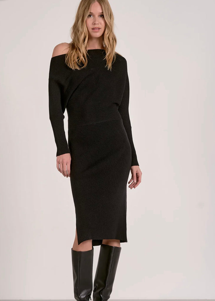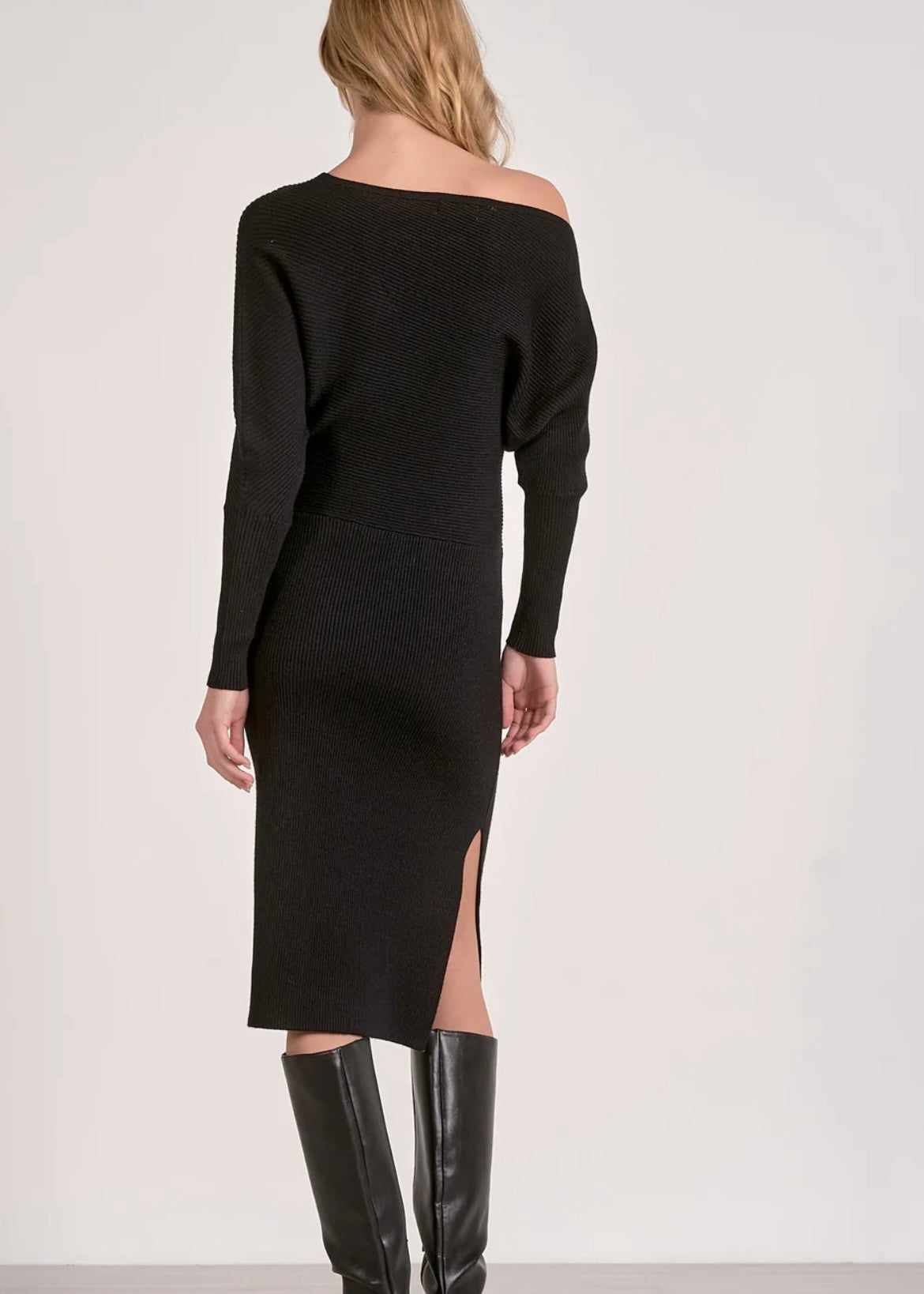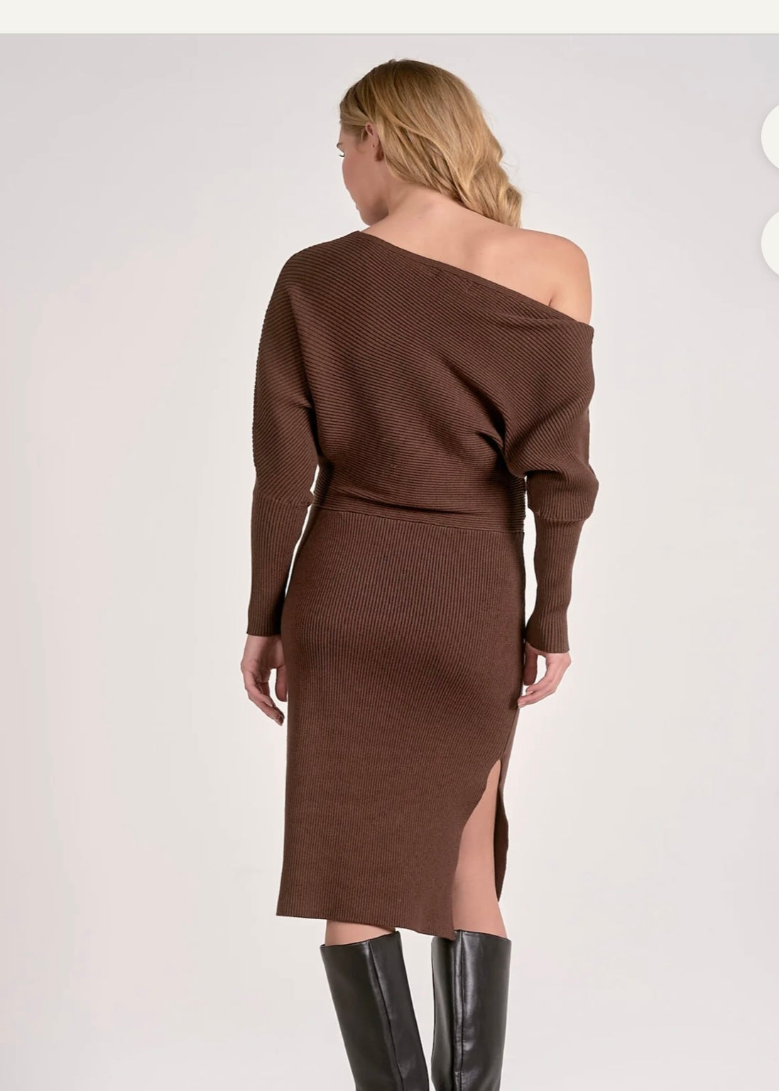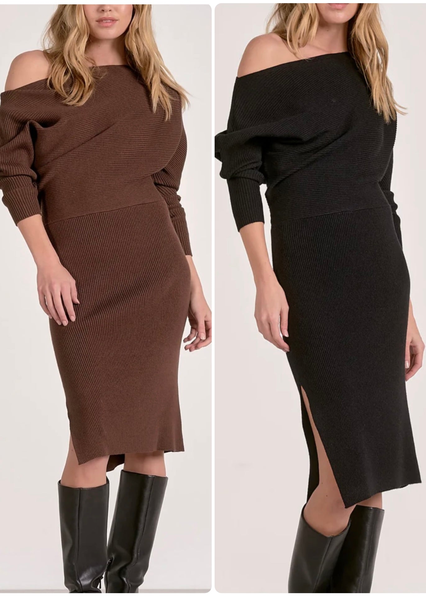 The dolman sleeves and side slit on the fitted skirt add a touch of elegance. Available in Chocolate and Black