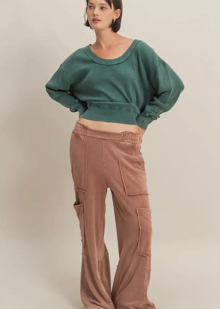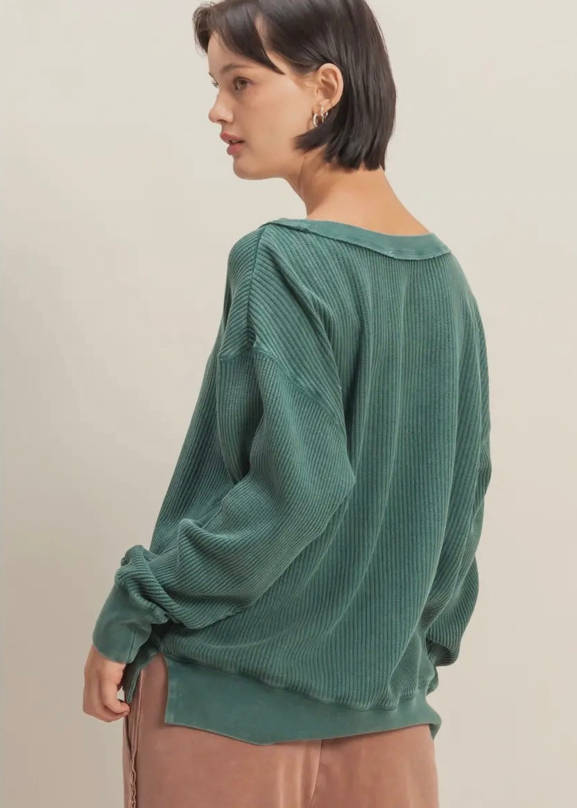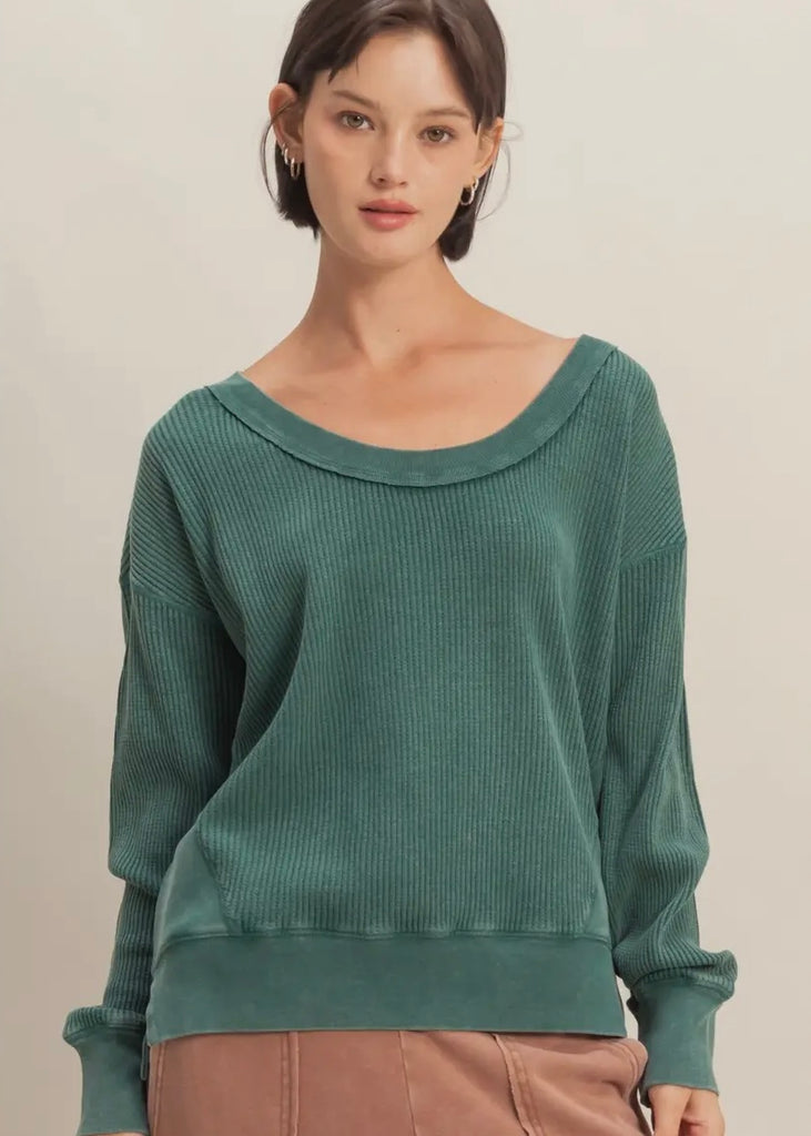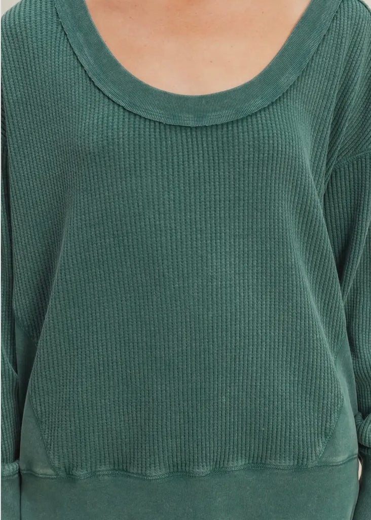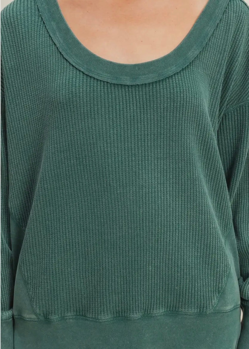 Featuring a mineral wash construction, this piece has a scoop neckline and long sleeves with drop shoulders