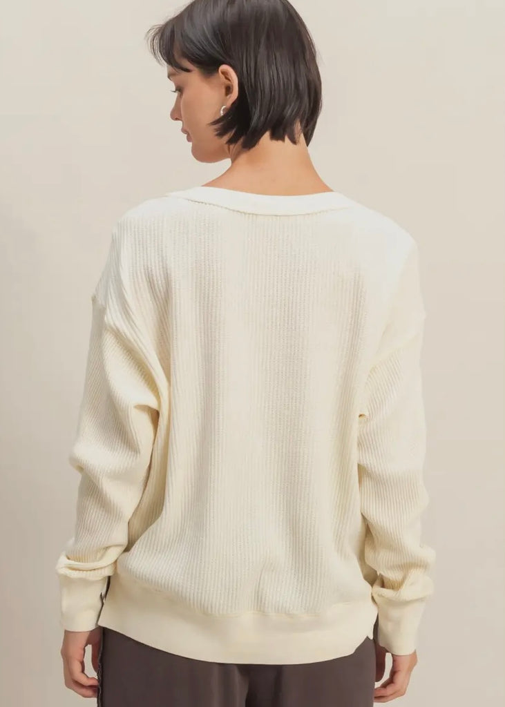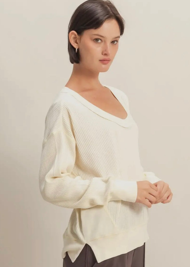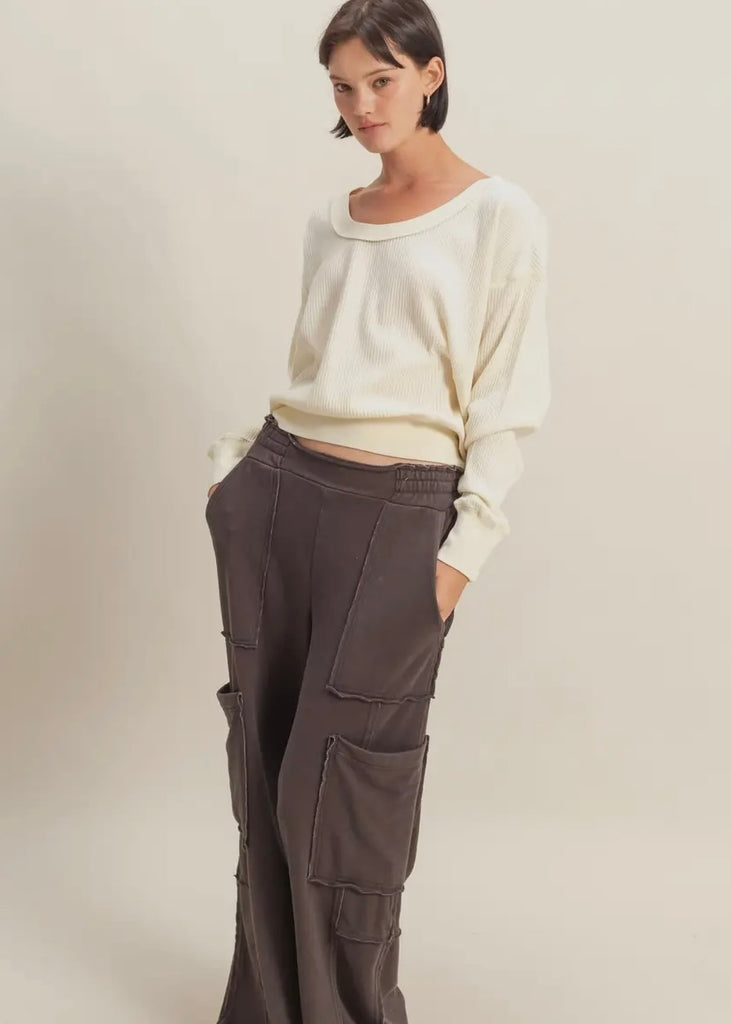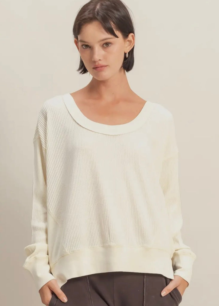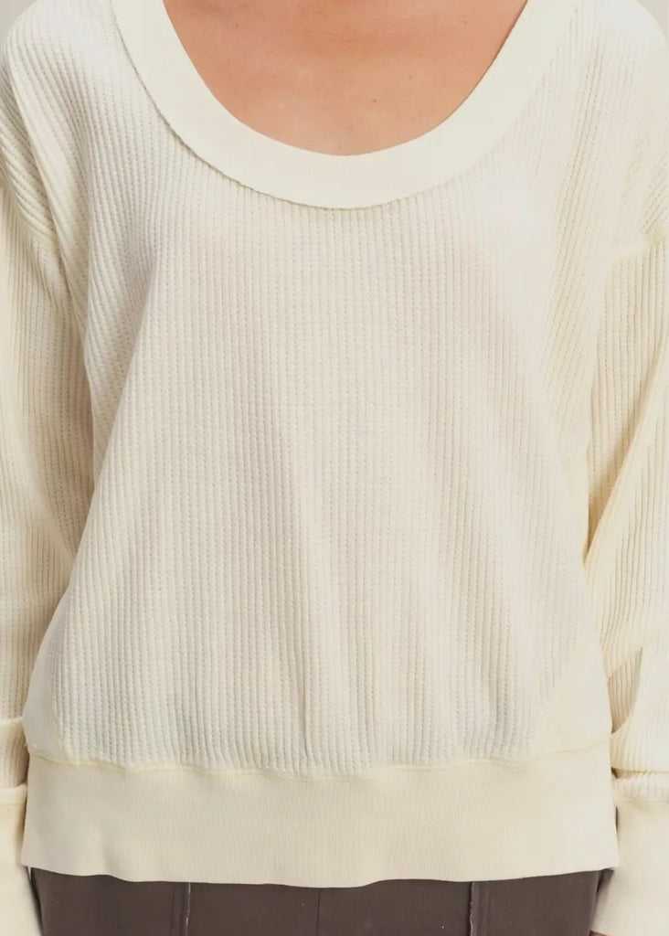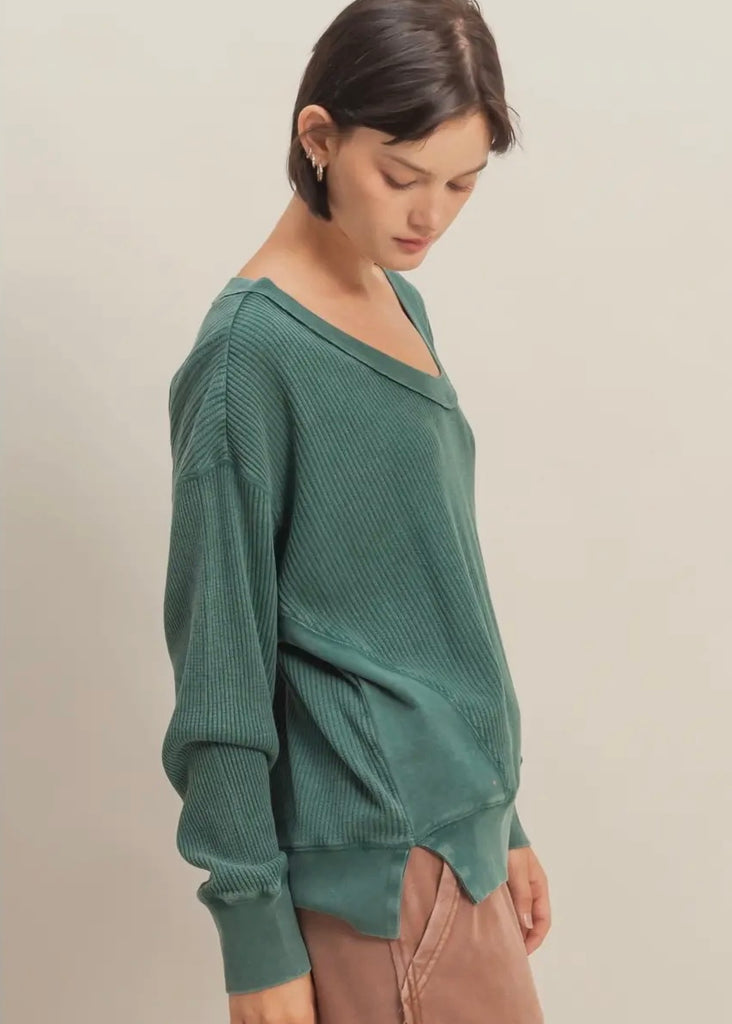 Featuring a mineral wash construction, this piece has a scoop neckline and long sleeves with drop shoulders