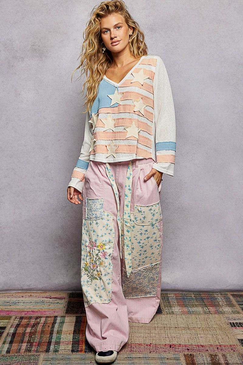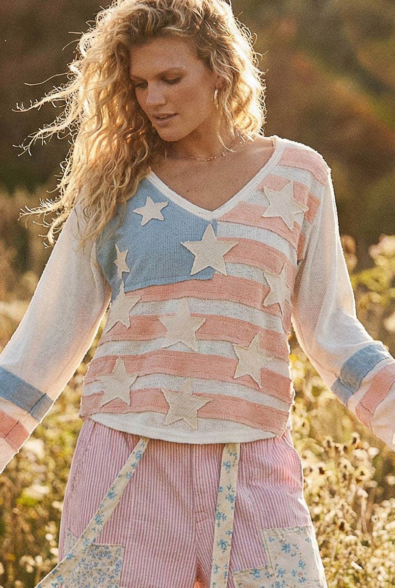Our long sleeve Patriotic Patch V-Neck Pullover features bold stars-and-stripes patchwork design with contrasting panels throughout