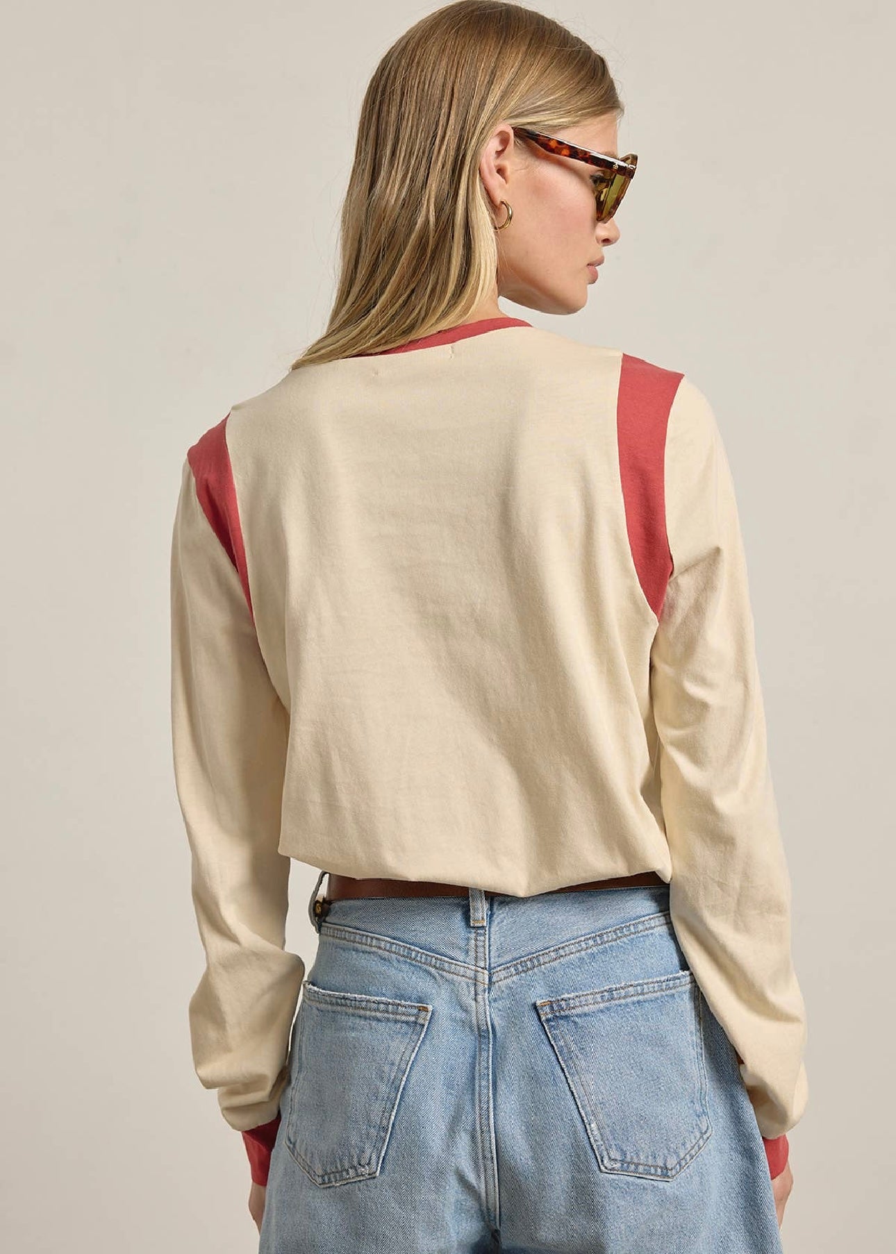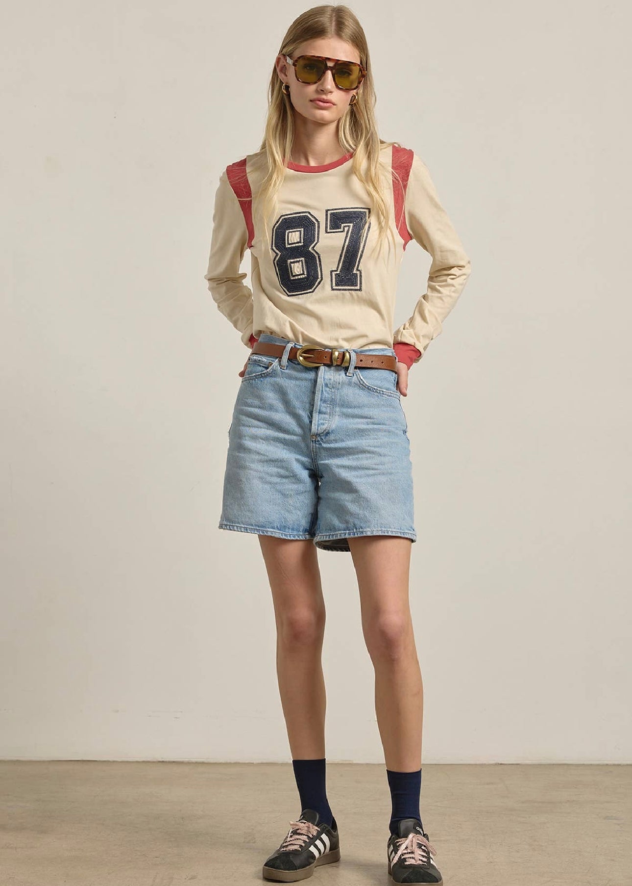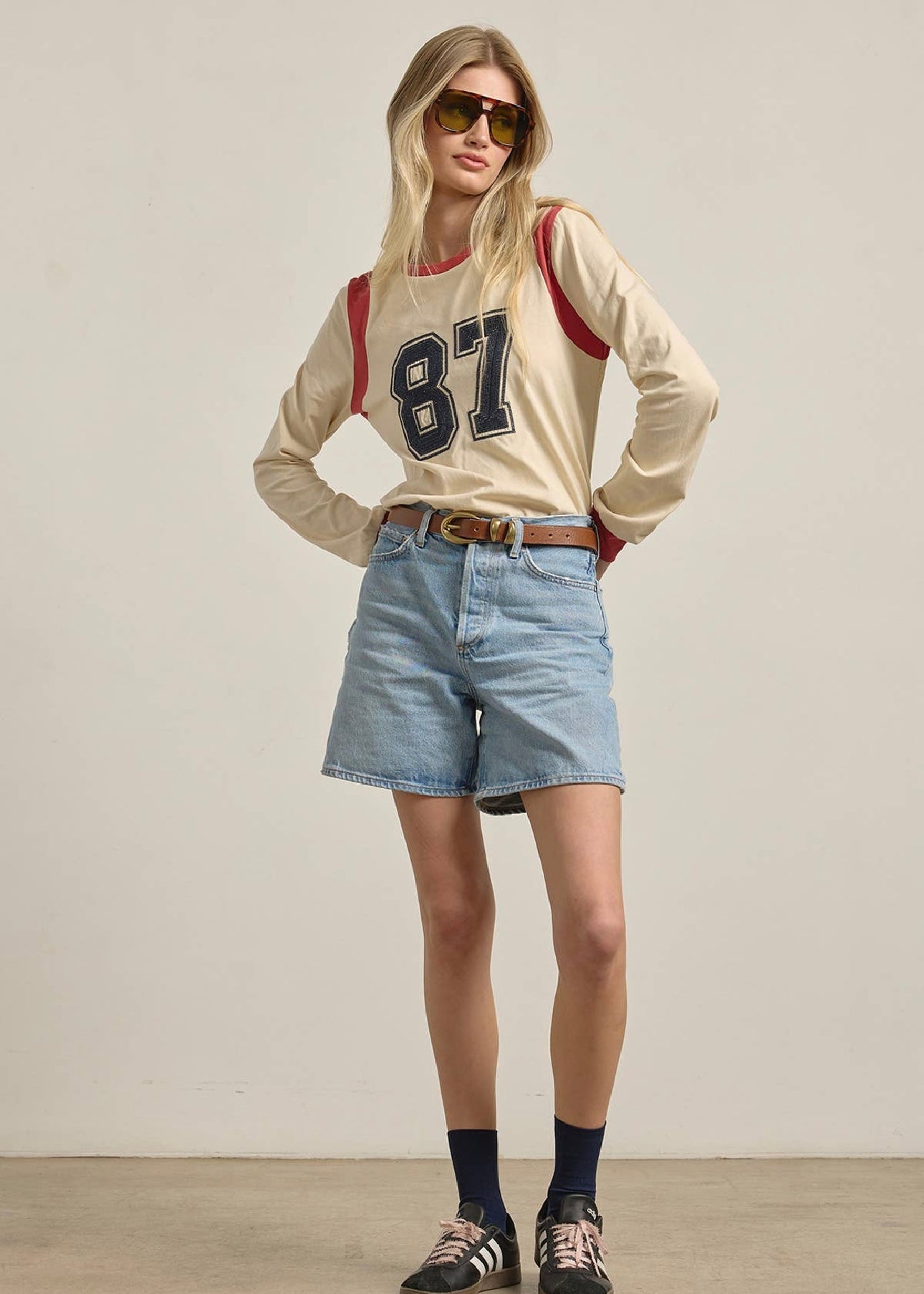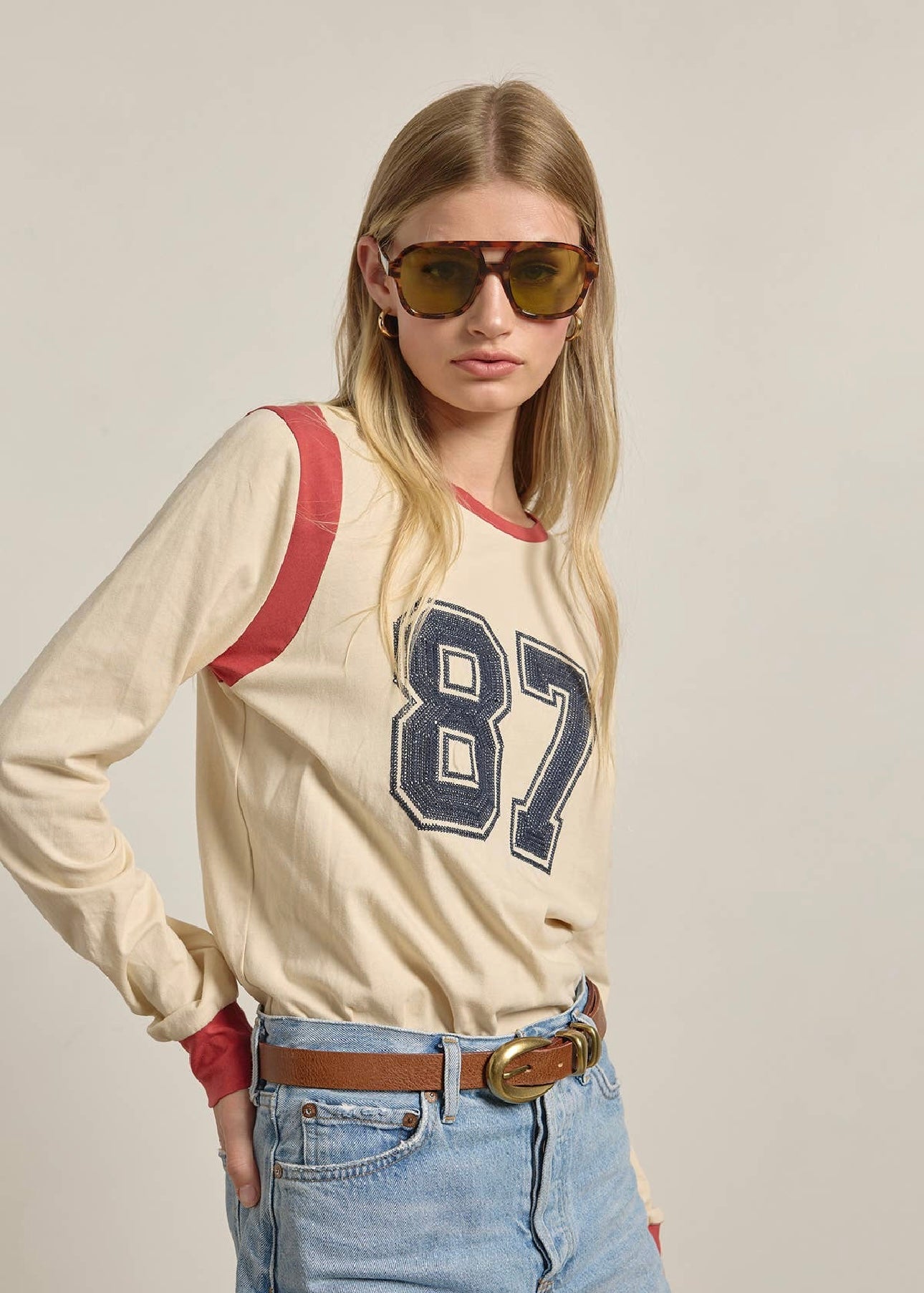 A sporty-chic long sleeve top featuring a bold embroidered “87” varsity graphic on the front. Designed with contrast color-block details at the neckline, shoulders, and cuffs, it offers a trendy yet casual vibe. Lightweight, comfortable, and perfect for layering or wearing solo.