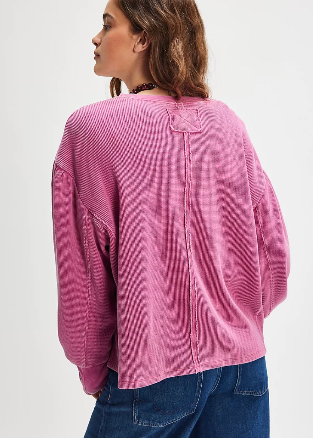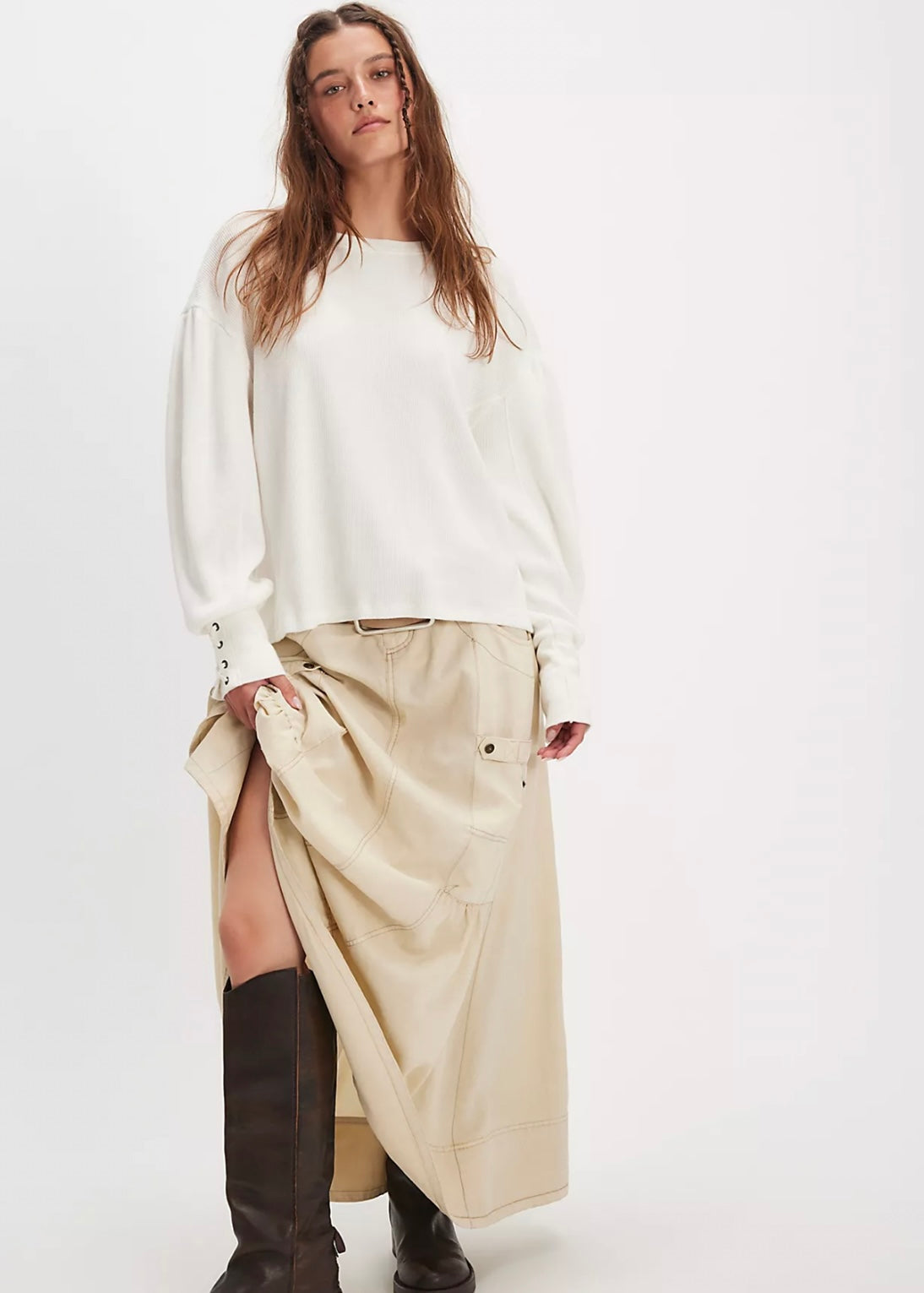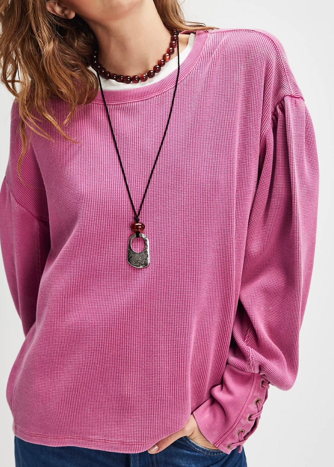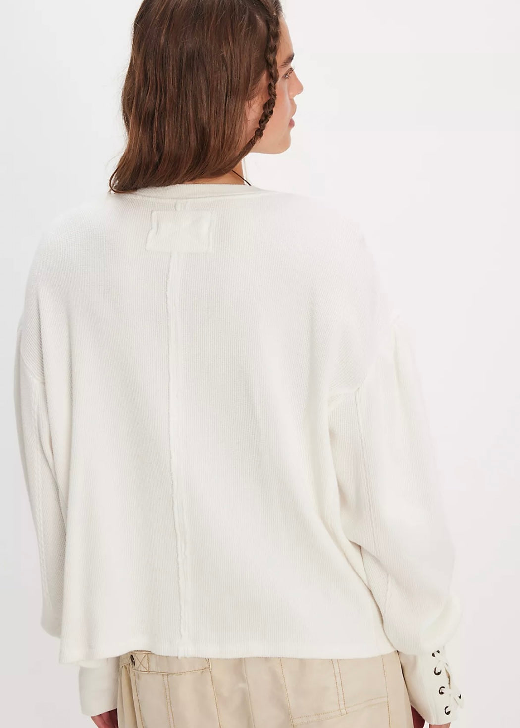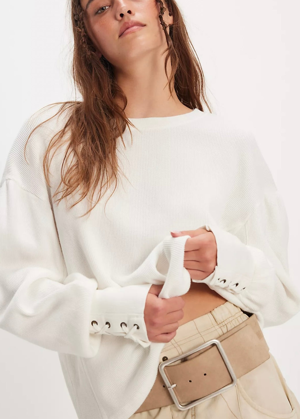 Lace-up details adorn the cuffs of this laidback long sleeve from Free People, featured in a classic thermal fabrication with voluminous sleeves for added dimension.