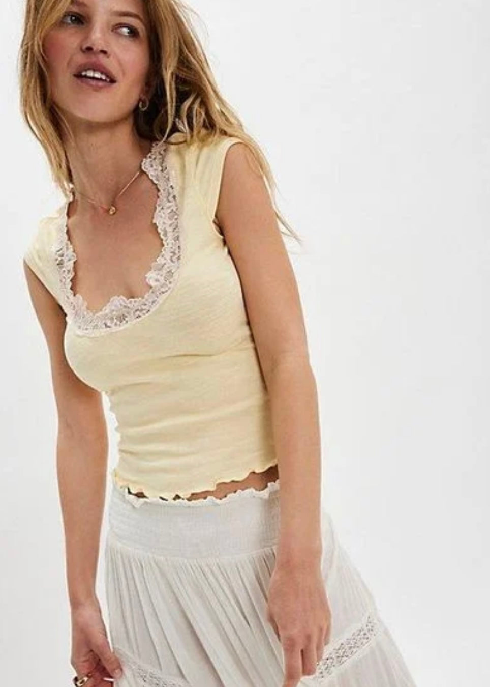 Intricate lace adorns the neckline of this flattering tee from Free People. Featuring a wide neckline with capped short sleeves and lettuce-edge trim.