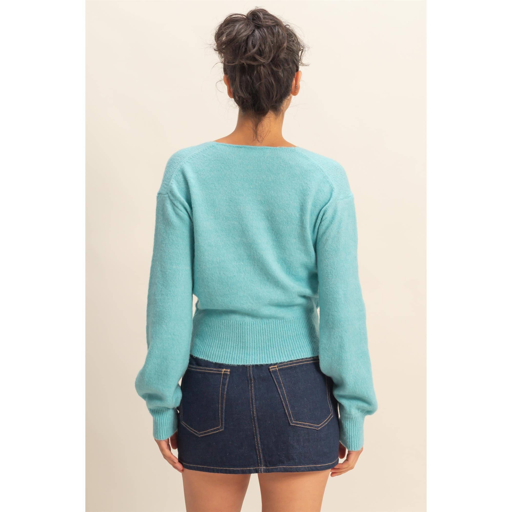 This surplice knit sweater features a flattering V-neckline with an elegant overlapping front. Designed with a relaxed drop shoulder and finished with ribbed cuffs and hem, the fitted waistband adds subtle structure. Perfect for pairing with jeans or skirts, it's ideal for cozy evenings and casual outings alike.