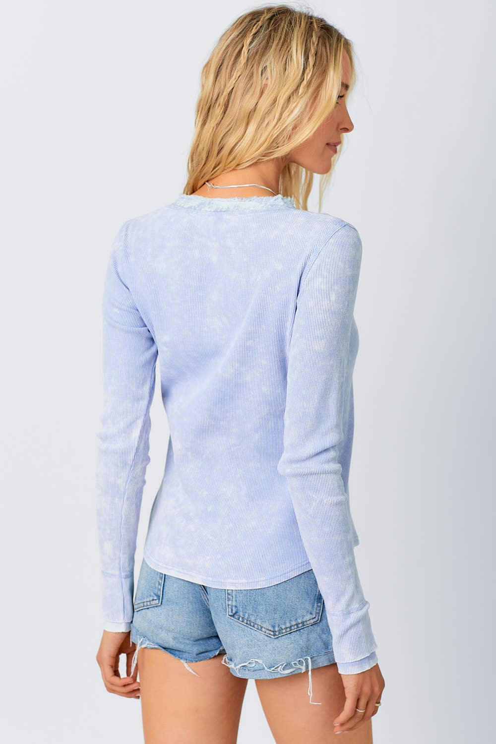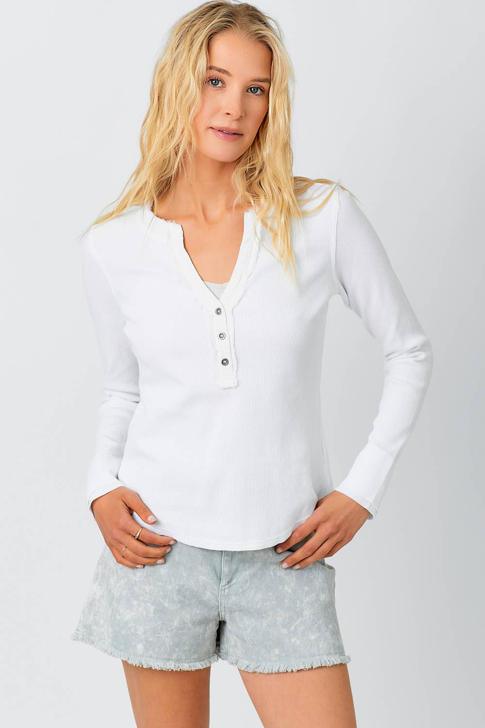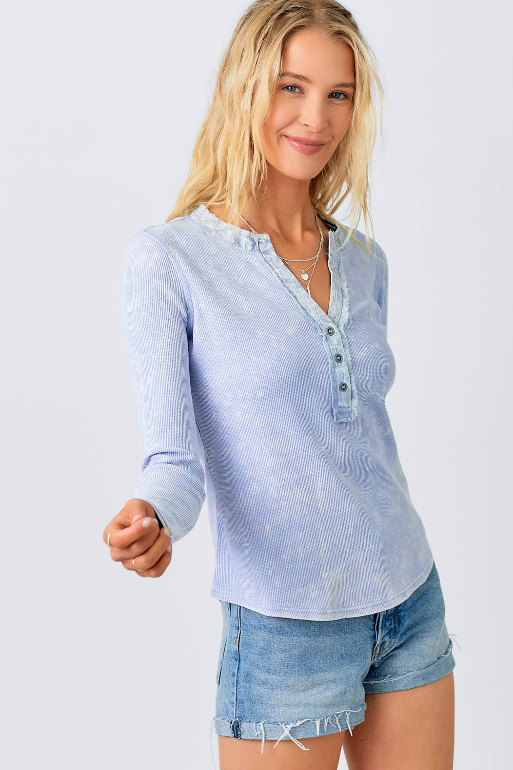 • Effortless layering meets timeless style with this washed thermal henley. The V-neck design and button trim detail add subtle sophistication, while the long sleeves and hi-lo hem create a flattering, modern silhouette. Soft thermal fabric offers warmth and comfort for everyday wear. Perfect on its own or layered under your favorite pieces for a polished, versatile look.