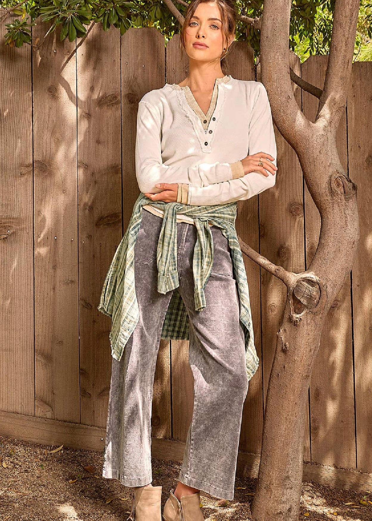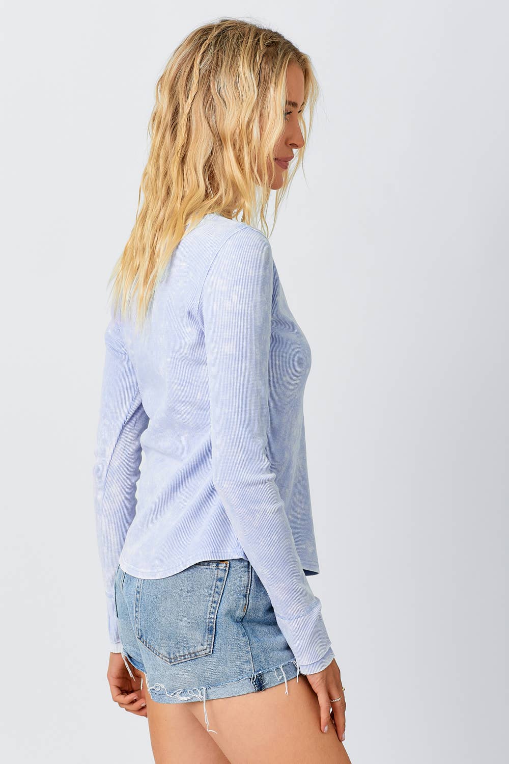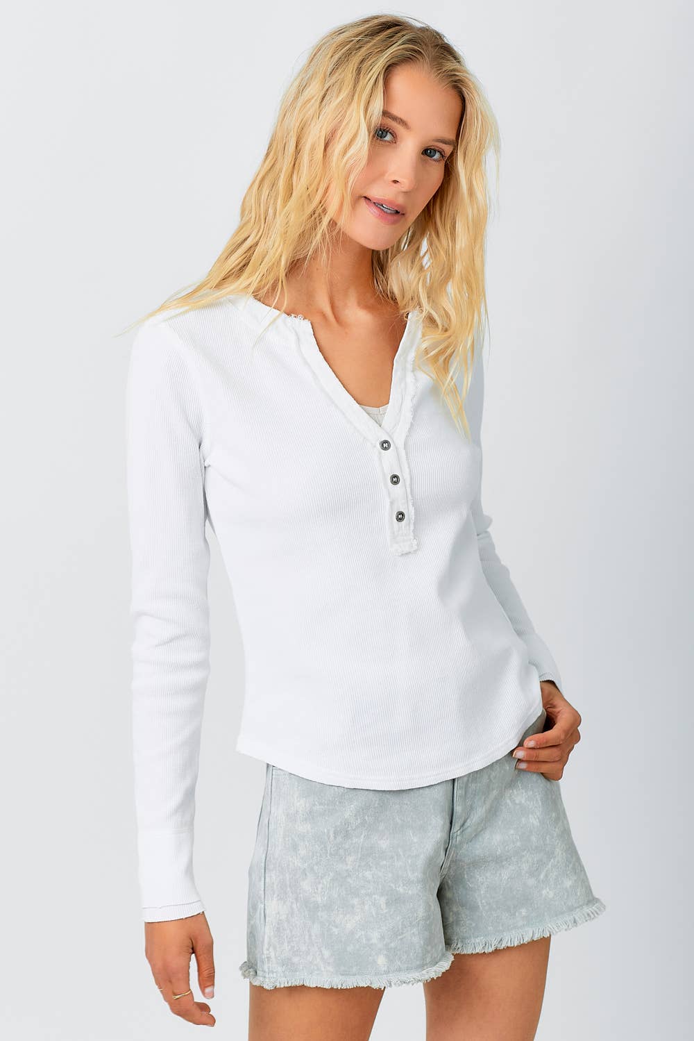 • Effortless layering meets timeless style with this washed thermal henley. The V-neck design and button trim detail add subtle sophistication, while the long sleeves and hi-lo hem create a flattering, modern silhouette. Soft thermal fabric offers warmth and comfort for everyday wear. Perfect on its own or layered under your favorite pieces for a polished, versatile look.