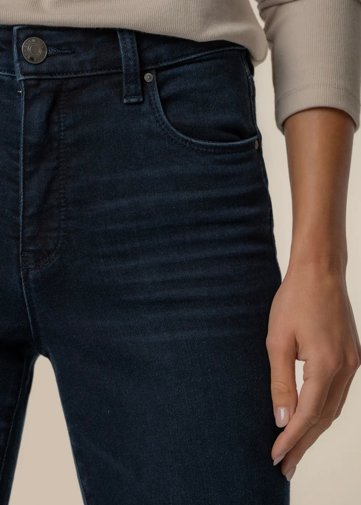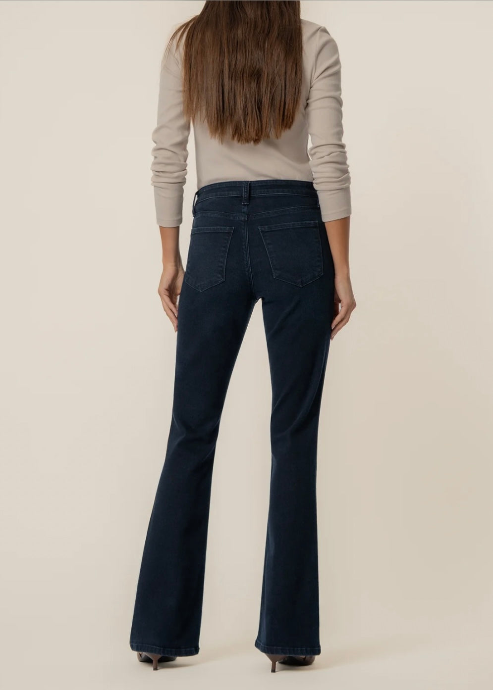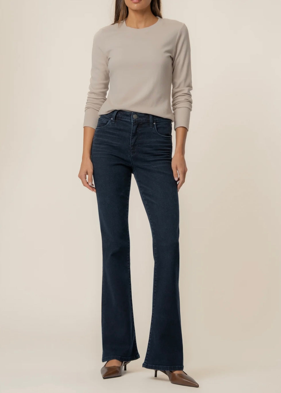 Elevate your everyday look with these high rise flare leg jeans, designed in a classic Euro wash for timeless style. Crafted from a very stretchy material, they offer a comfortable, sculpted fit that moves with you. Featuring Fab Ab front pockets for a smooth, flattering silhouette, these jeans are the perfect blend of style and support.
