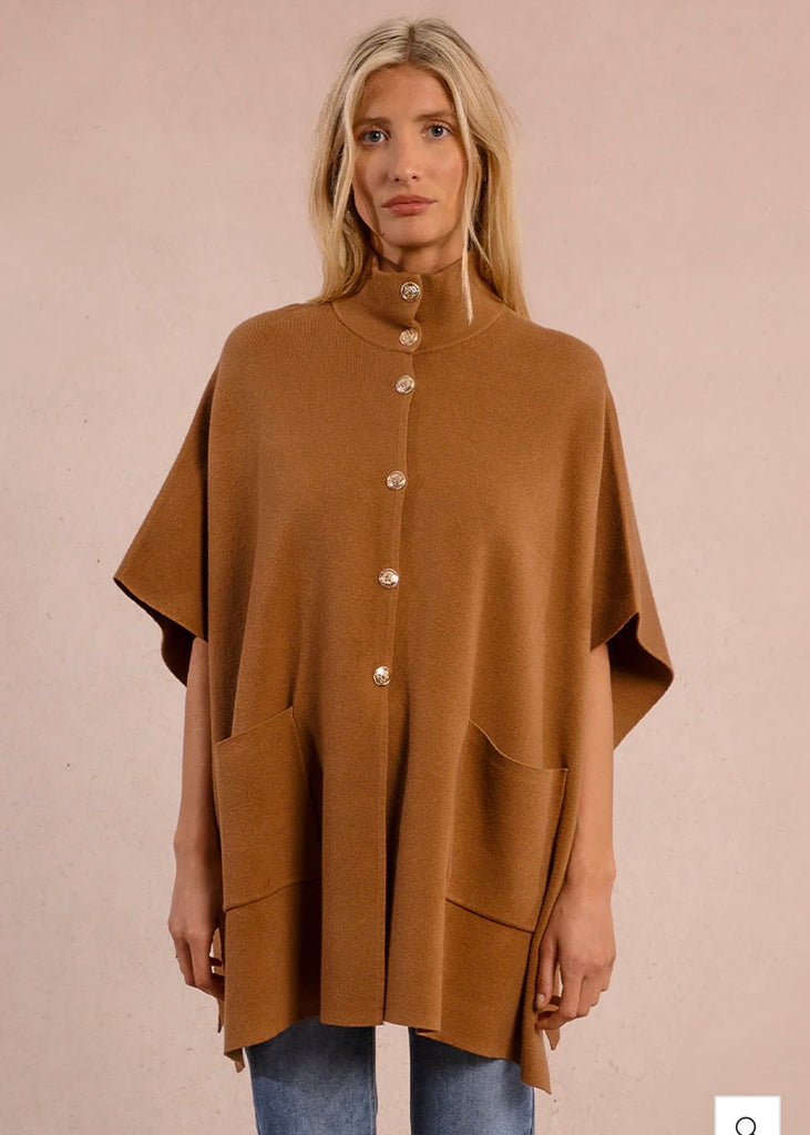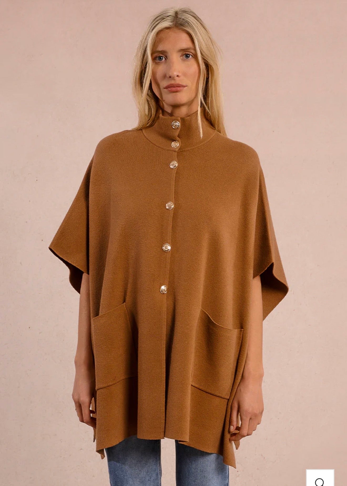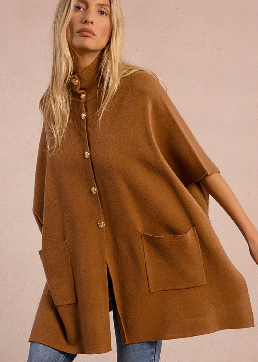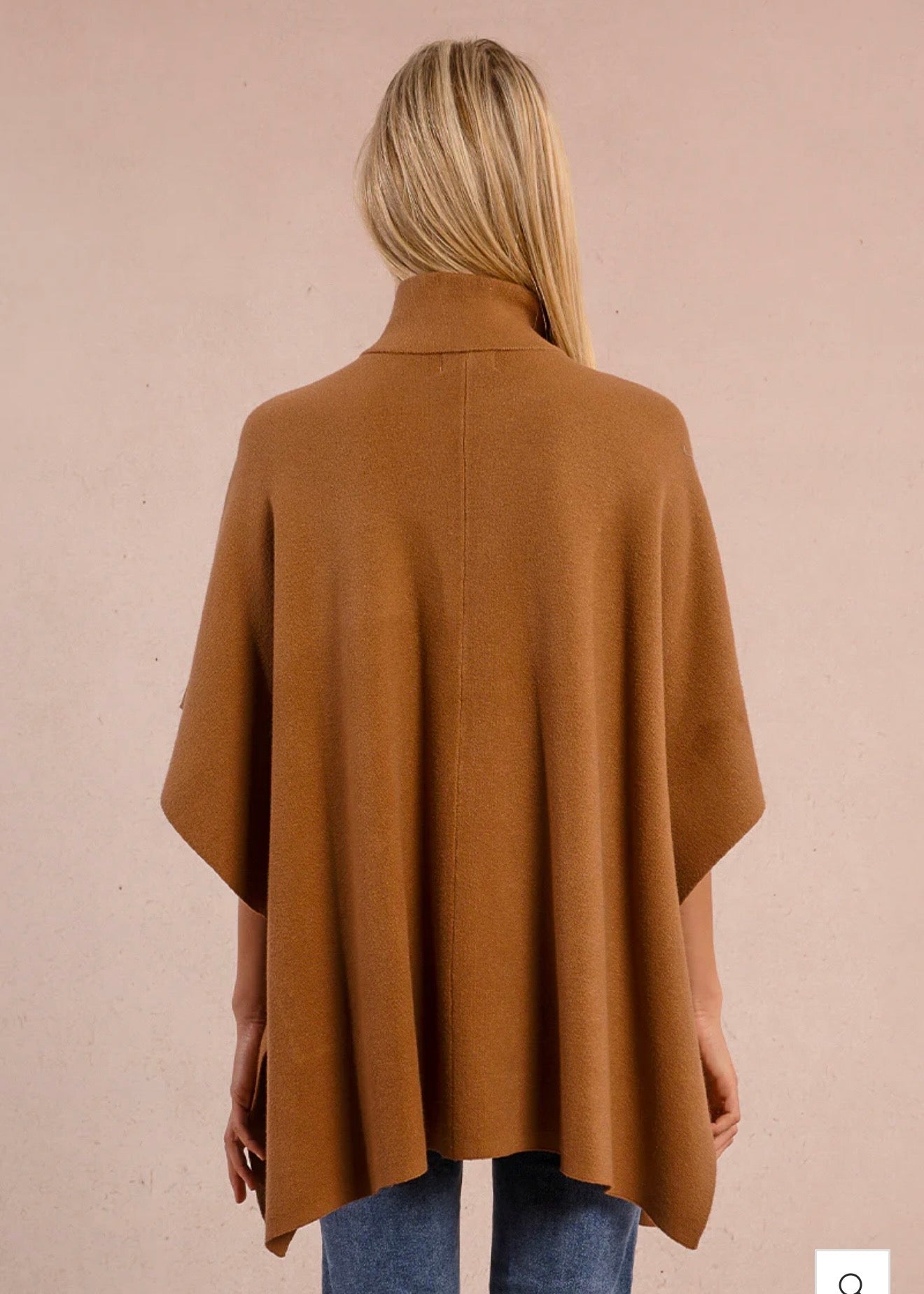 Elevate your style with our Camel Chic Cape. Crafted in a polished camel color, this modern knit cape exudes sophistication