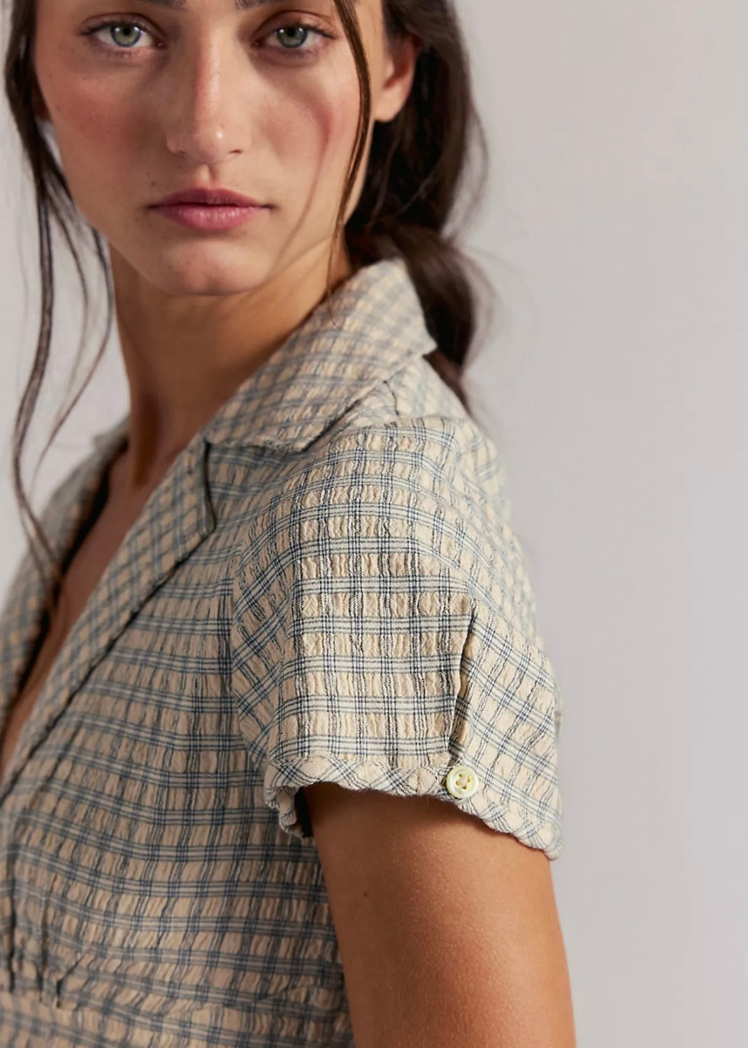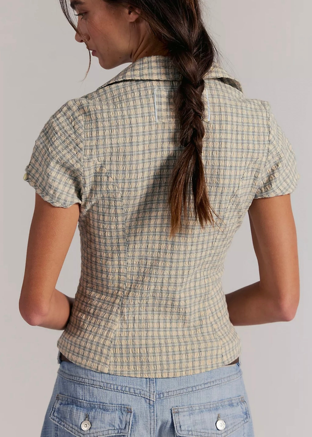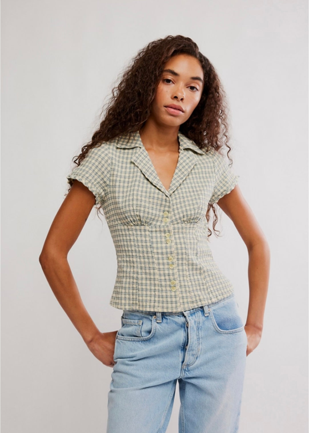 Add that vintage vibe to your look with this button-front top from Free People, featuring a fitted bodice, ruched underbust, and collared V-neckline for elevated finish.