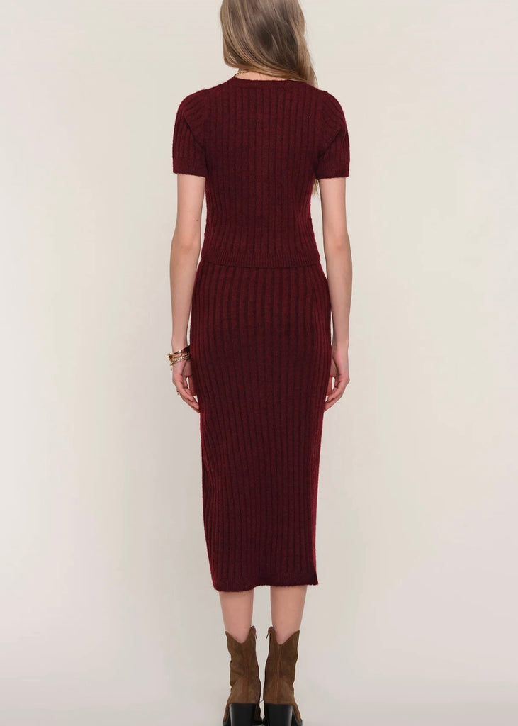 It features a short sleeve, knit cardigan with novelty buttons and a slim fit, midi skir