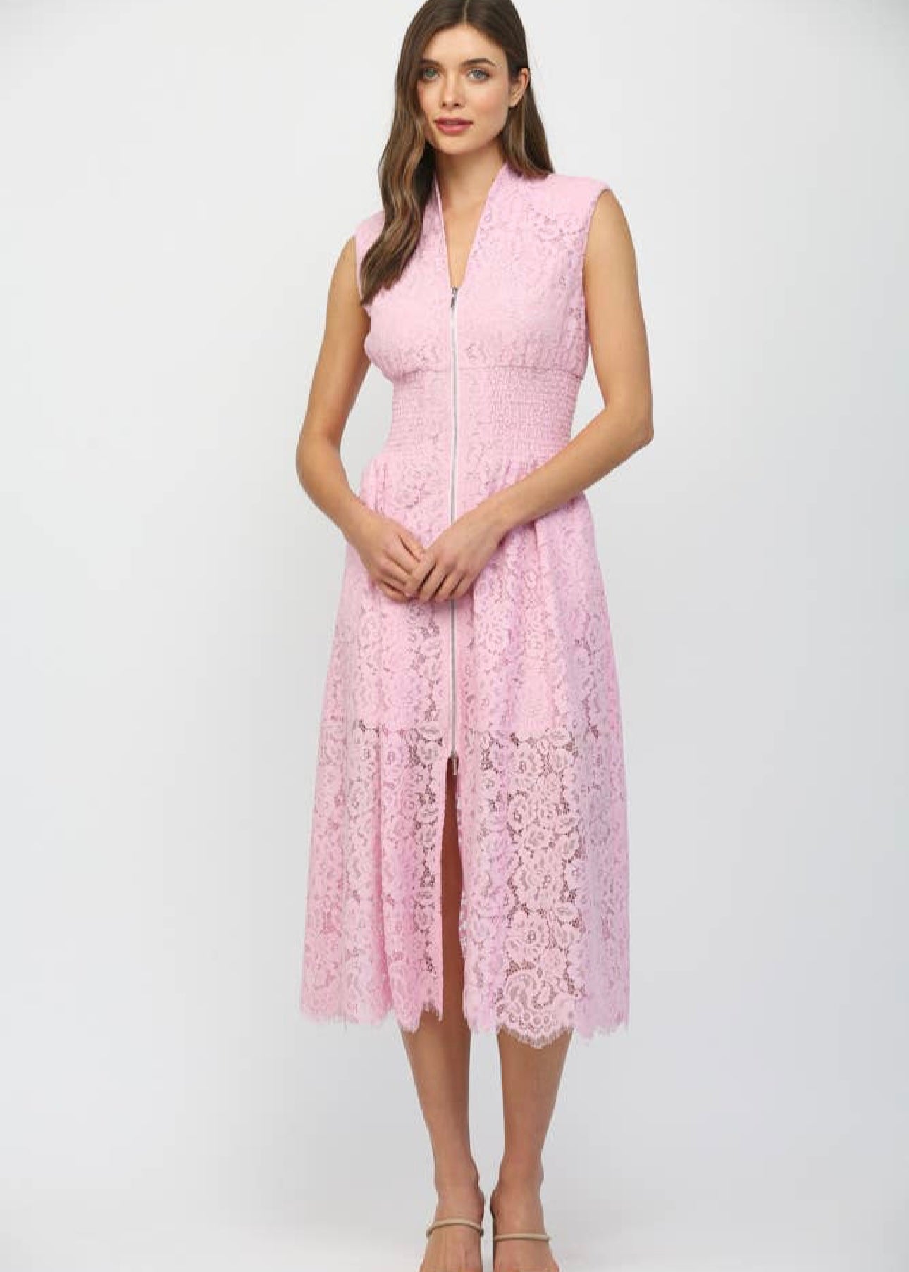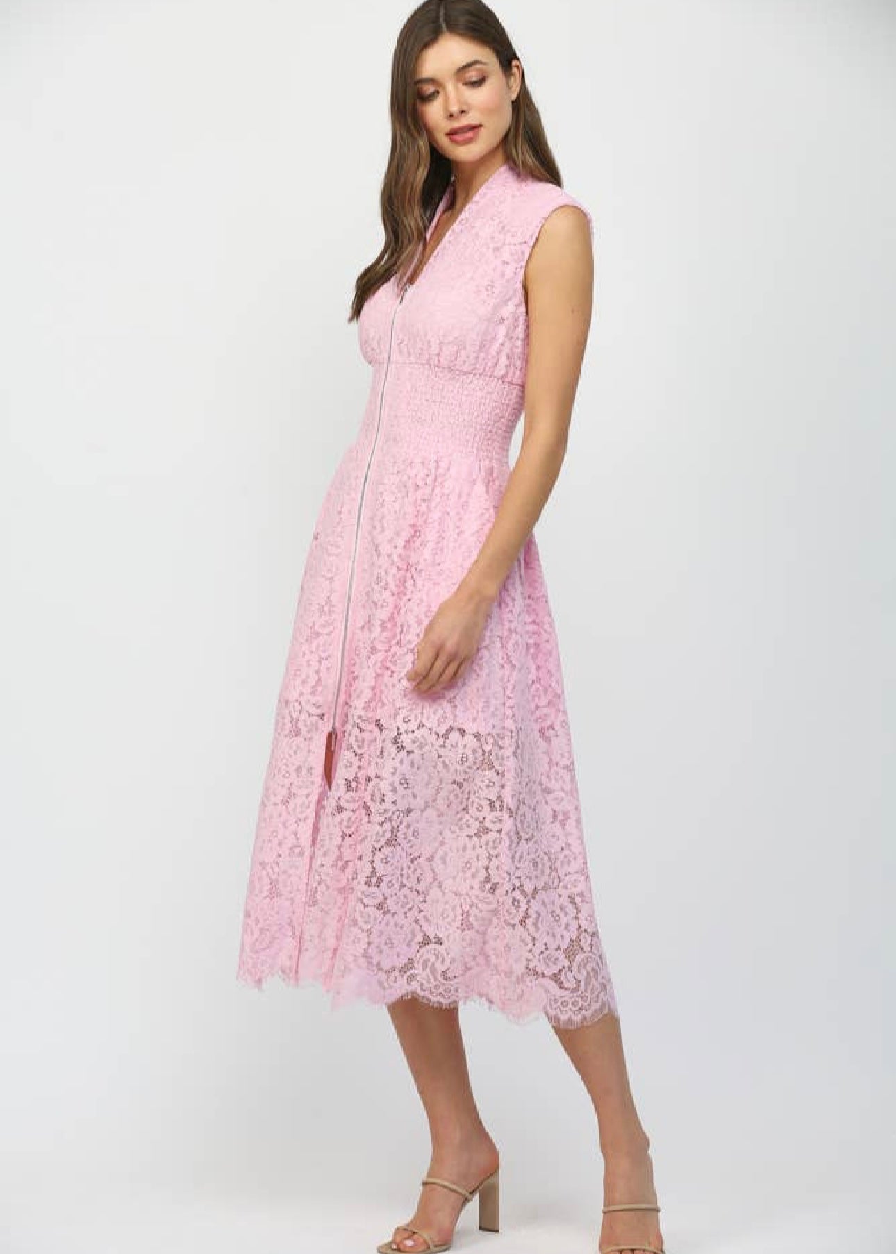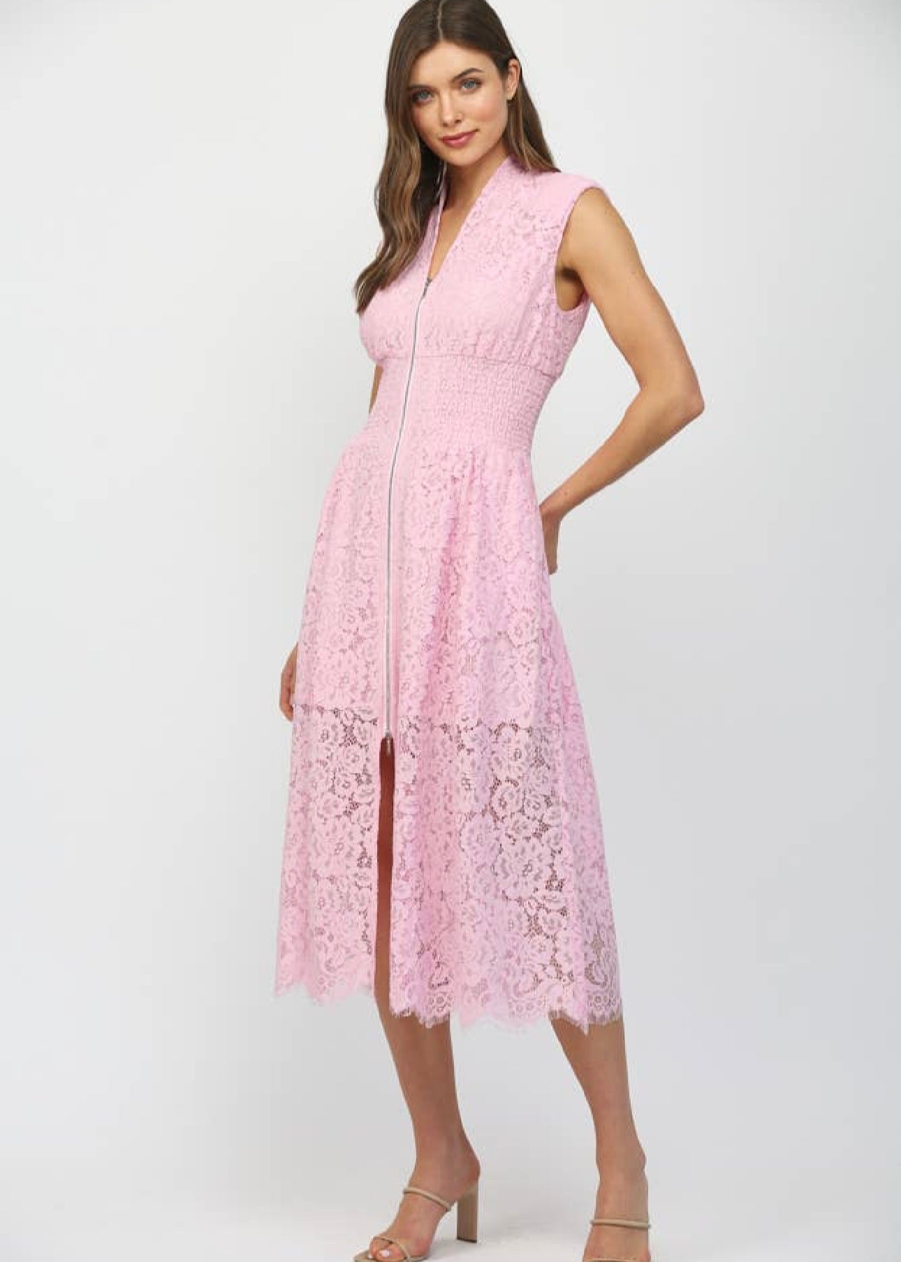 The Carolyn Midi Dress features a front zip closure and intricate lace detailing, providing a blend of elegance and functionality. Constructed with quality materials, it offers a comfortable fit while the lace adds a sophisticated touch, suitable for various occasions.