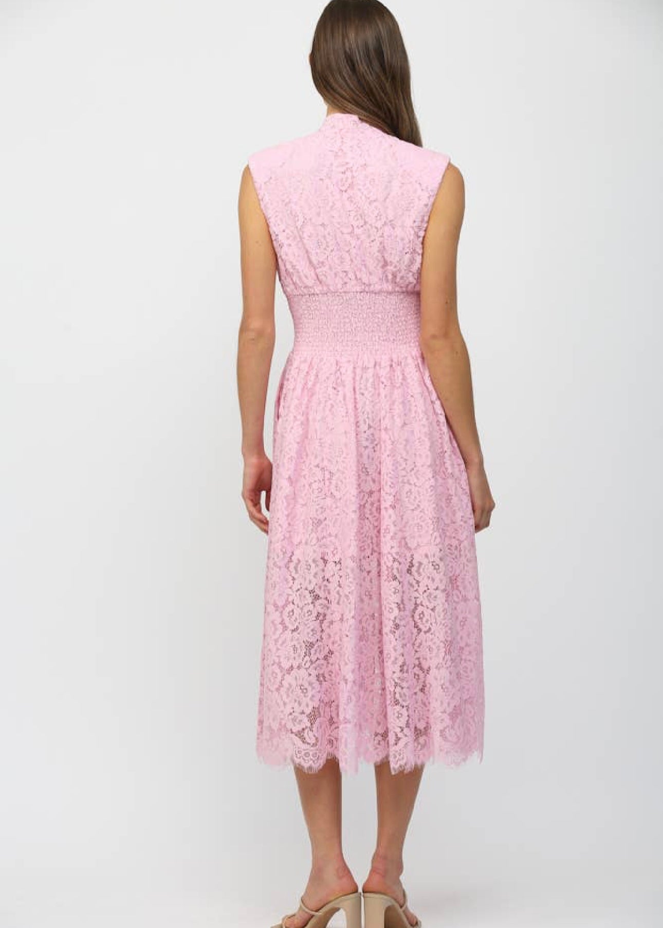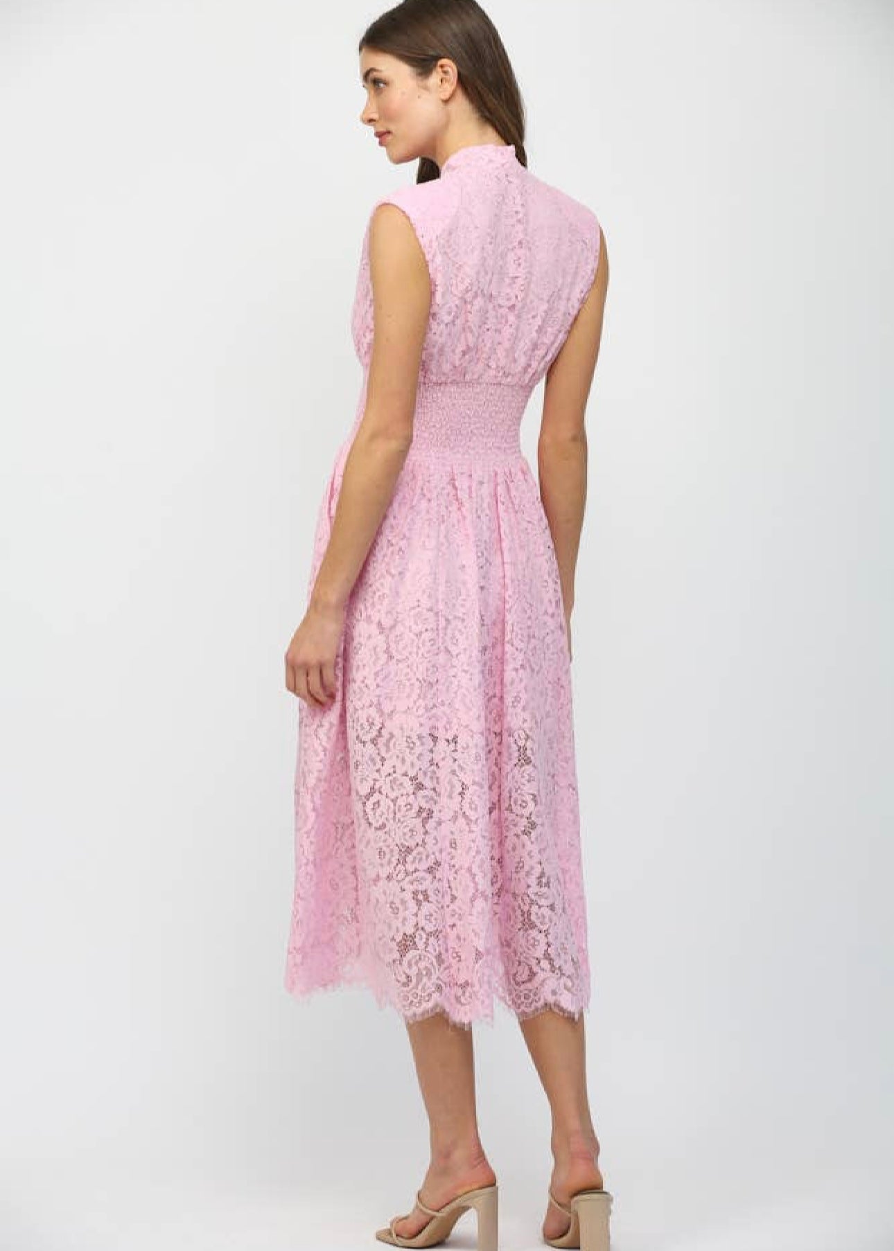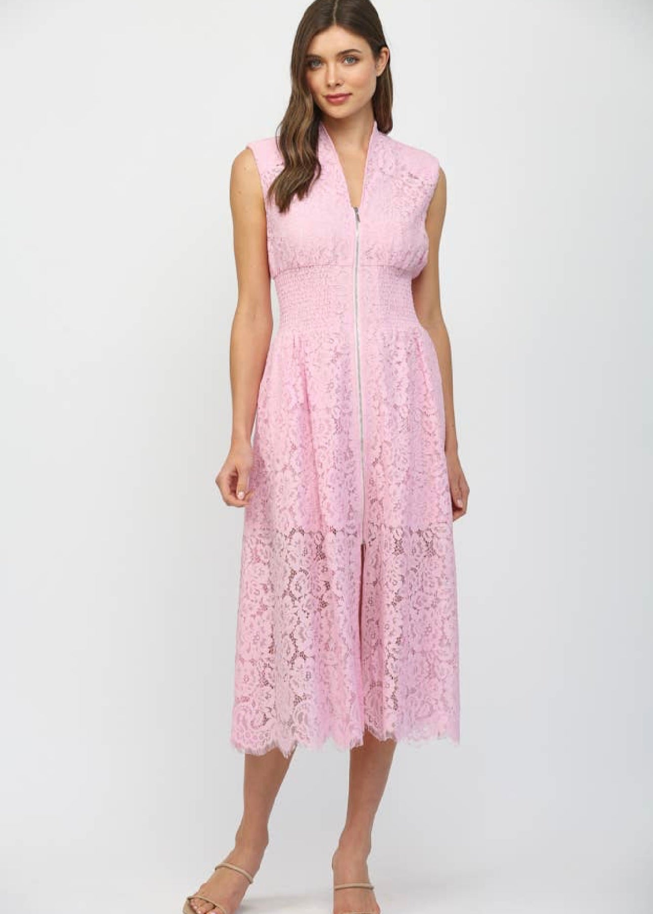 The Carolyn Midi Dress features a front zip closure and intricate lace detailing, providing a blend of elegance and functionality. Constructed with quality materials, it offers a comfortable fit while the lace adds a sophisticated touch, suitable for various occasions.