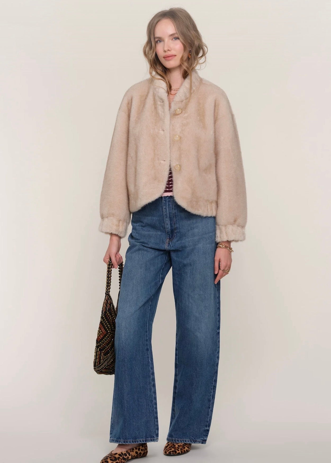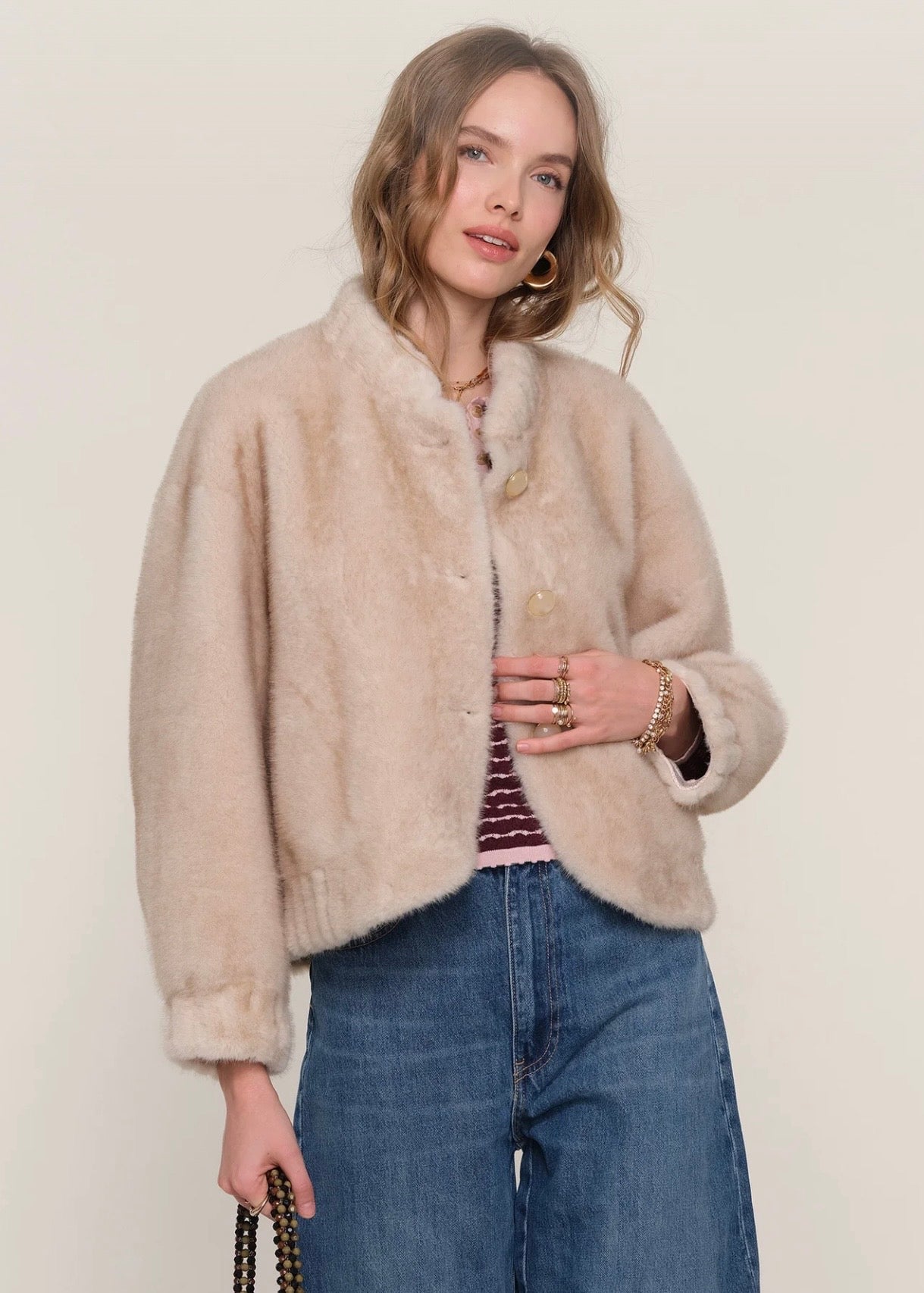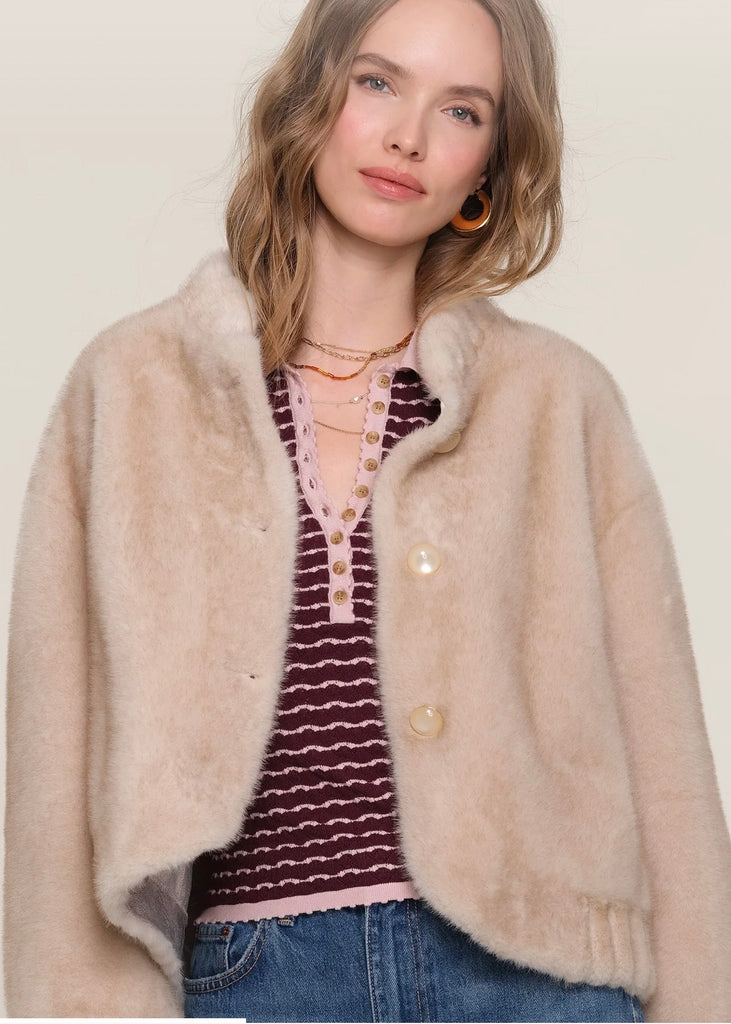 • The Gellar Jacket is a super special piece this season. Made from a fluffy, faux fur it has an elastic cuff and hem. Wear it over your favorite mini dress, or with jeans and a tee, for an effortlessly, cool look.