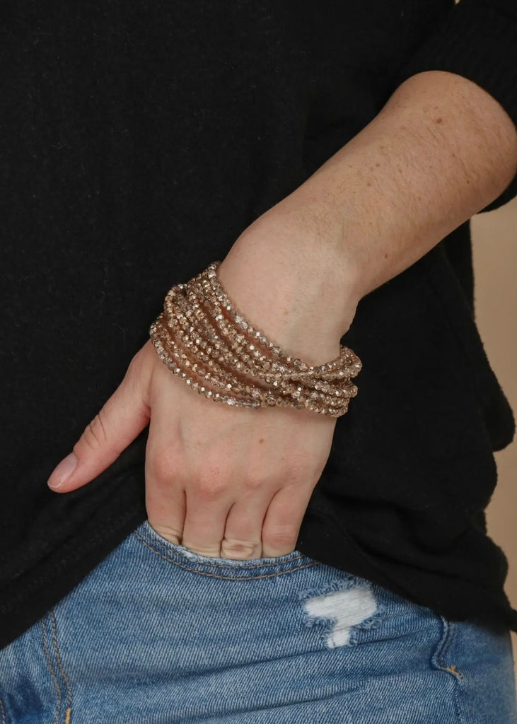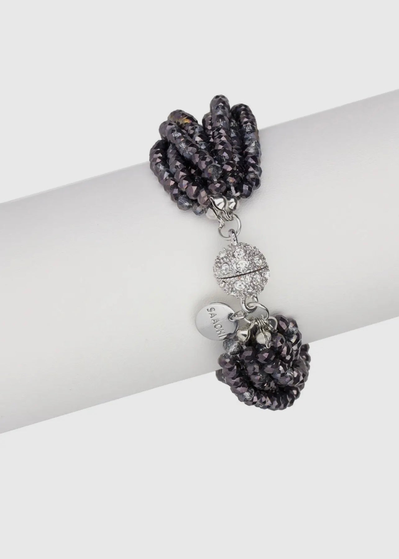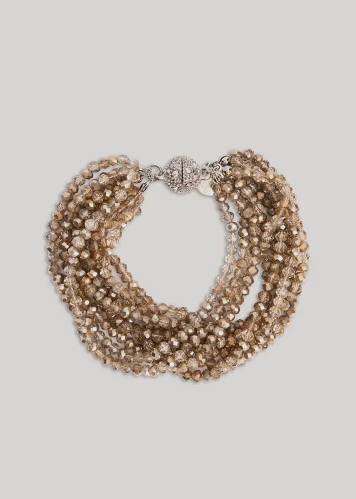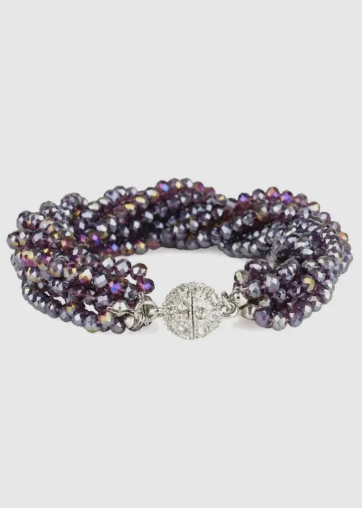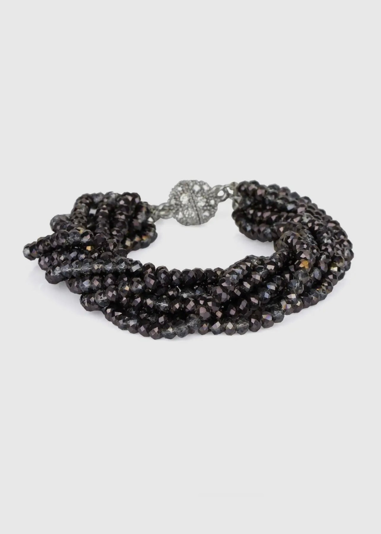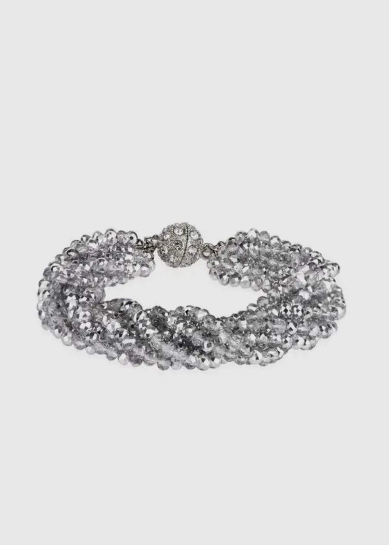 Twisted strands of multidimensional glass beads add a luminous touch, while the pave magnetic ball closure adds effortless style