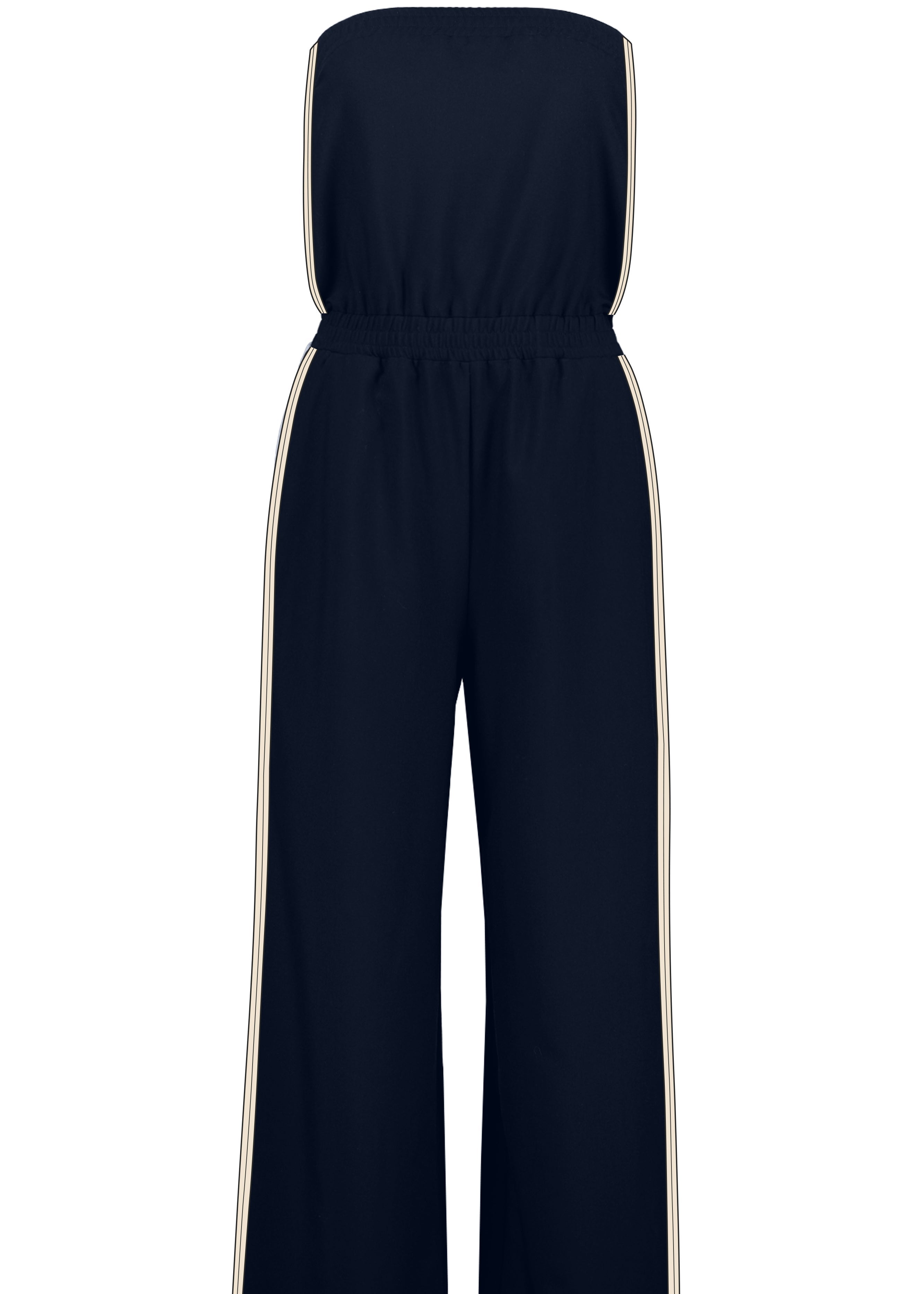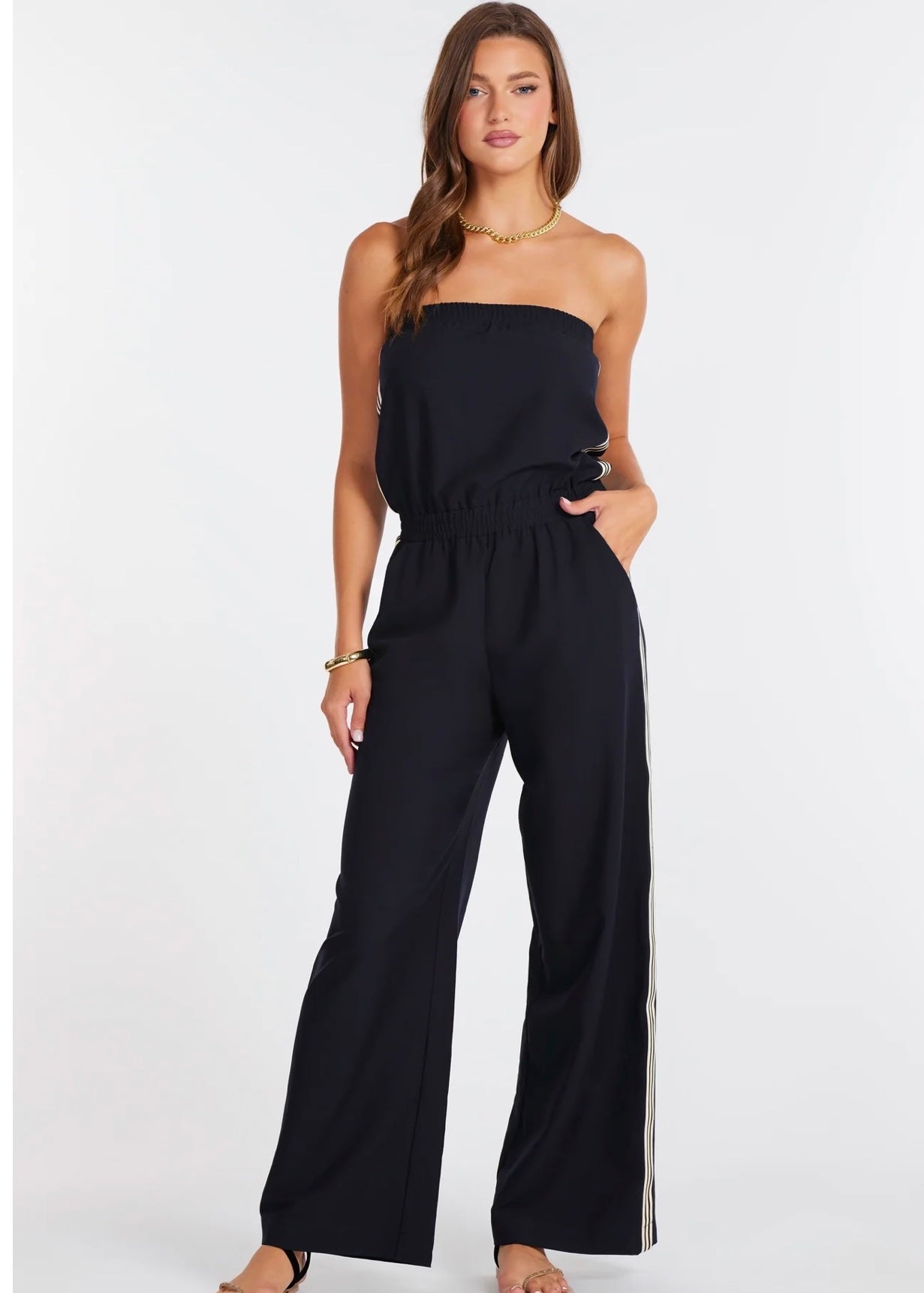 Clean, modern, and endlessly versatile, this strapless jumpsuit offers a streamlined silhouette with a relaxed, flattering drape