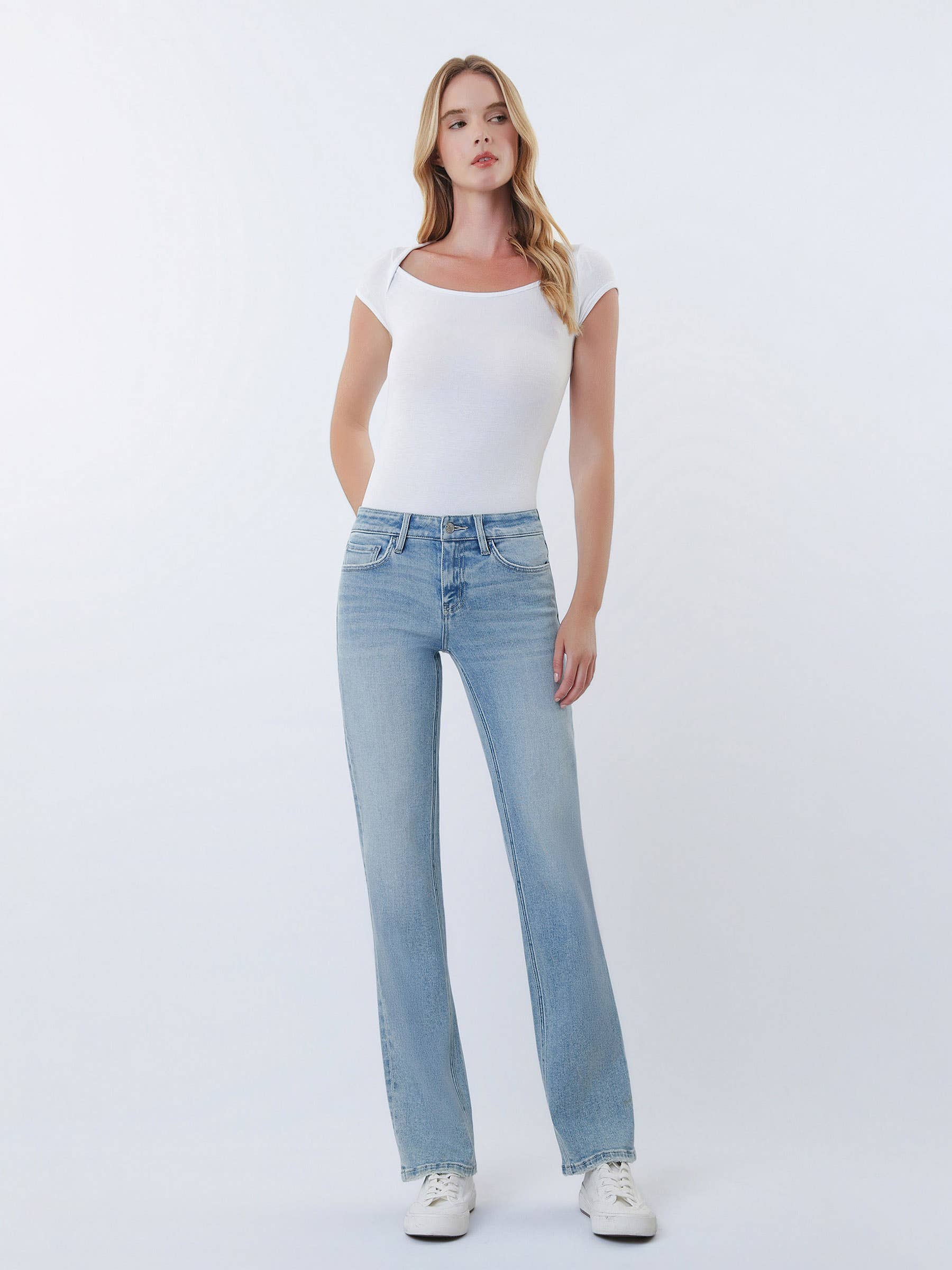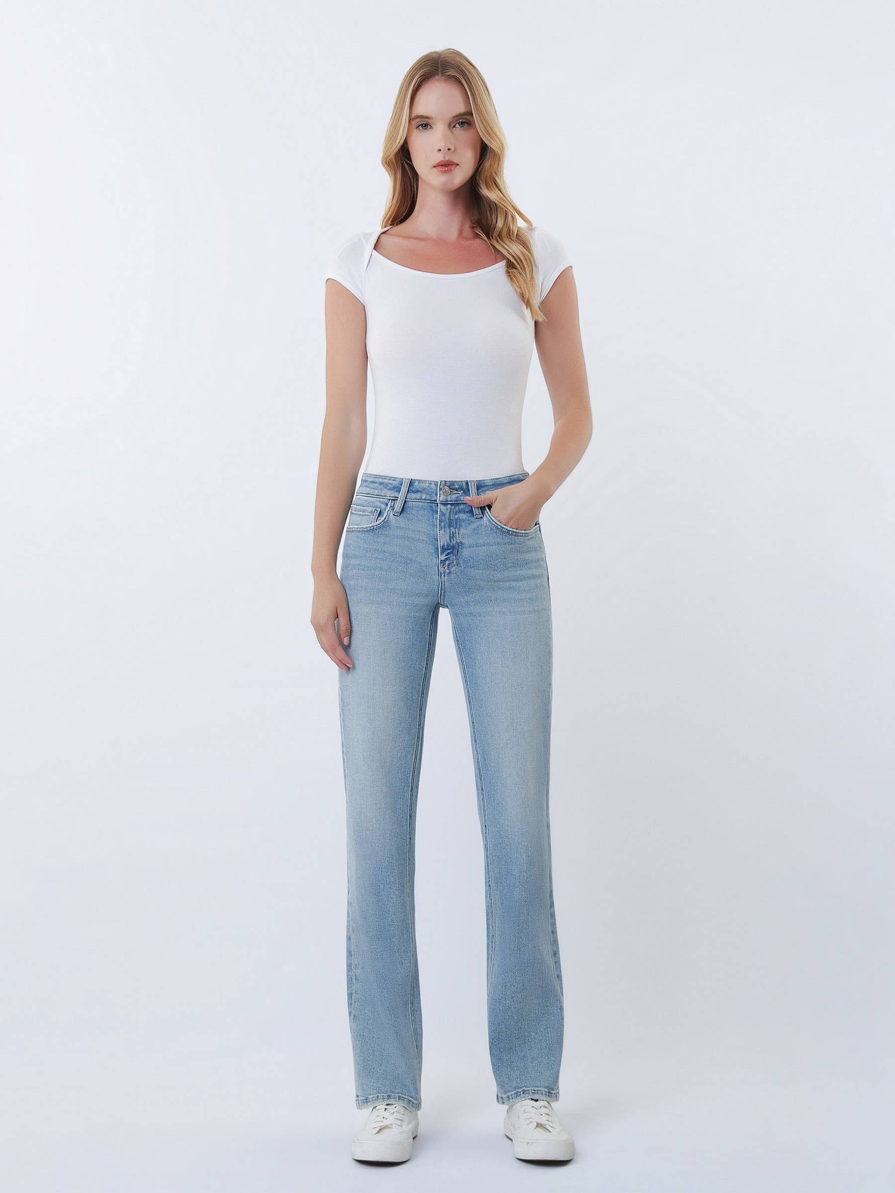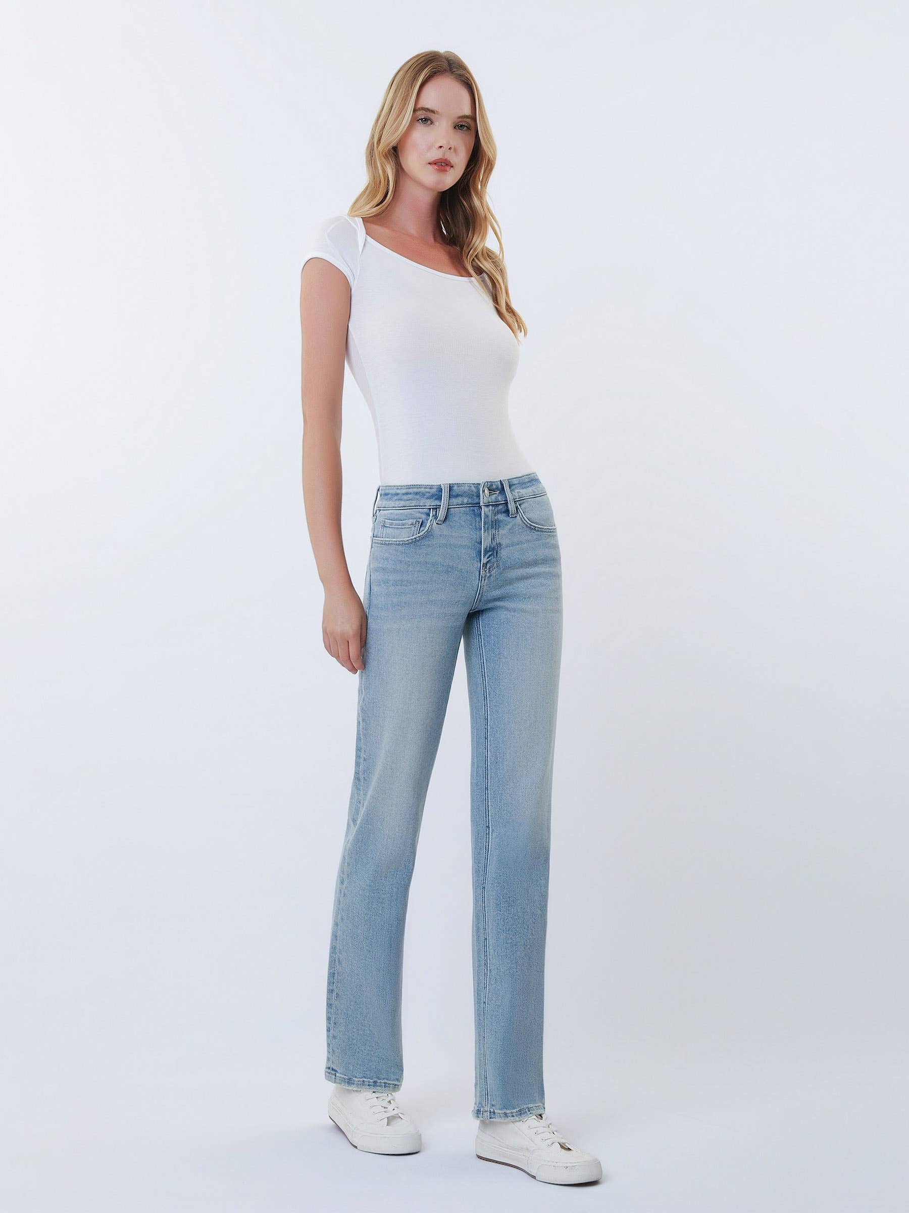 LOW RISE LIGHT WASH STRAIGHT JEANS WITH TINT COMFORT STRETCH DENIM, LOW RISE WAIST, 5 POCKETS, FINISHED HEM, FULL LENGTH, LIGHT WASH, STRAIGHT JEANS WITH TINT F. RISE: 8 1/2" / INSEAM: 31" / LEG OPENING: 16 1/2" MODEL IS 5'10" WEARING A SIZE 26