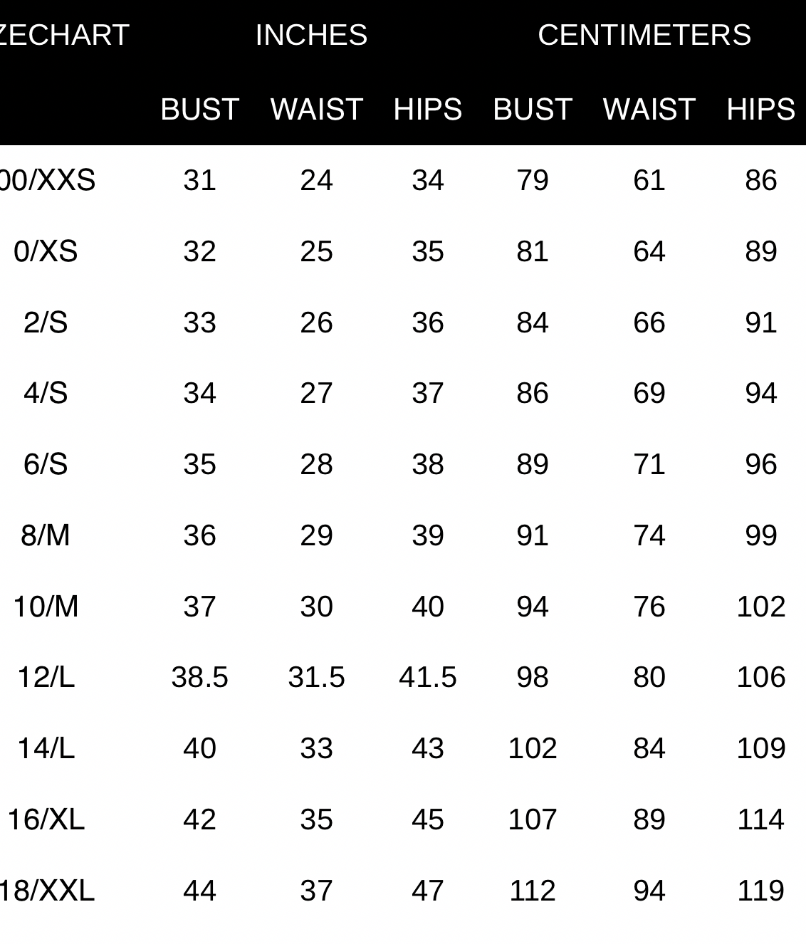 Show size chart