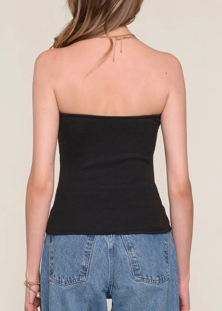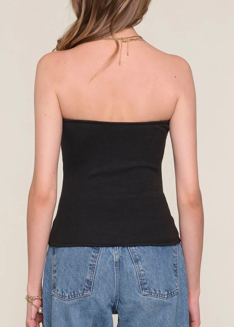 The Marinette Top is a strapless, faux suede top with a slim fit. It features pleats at side seam and a knit back for a super flattering fit