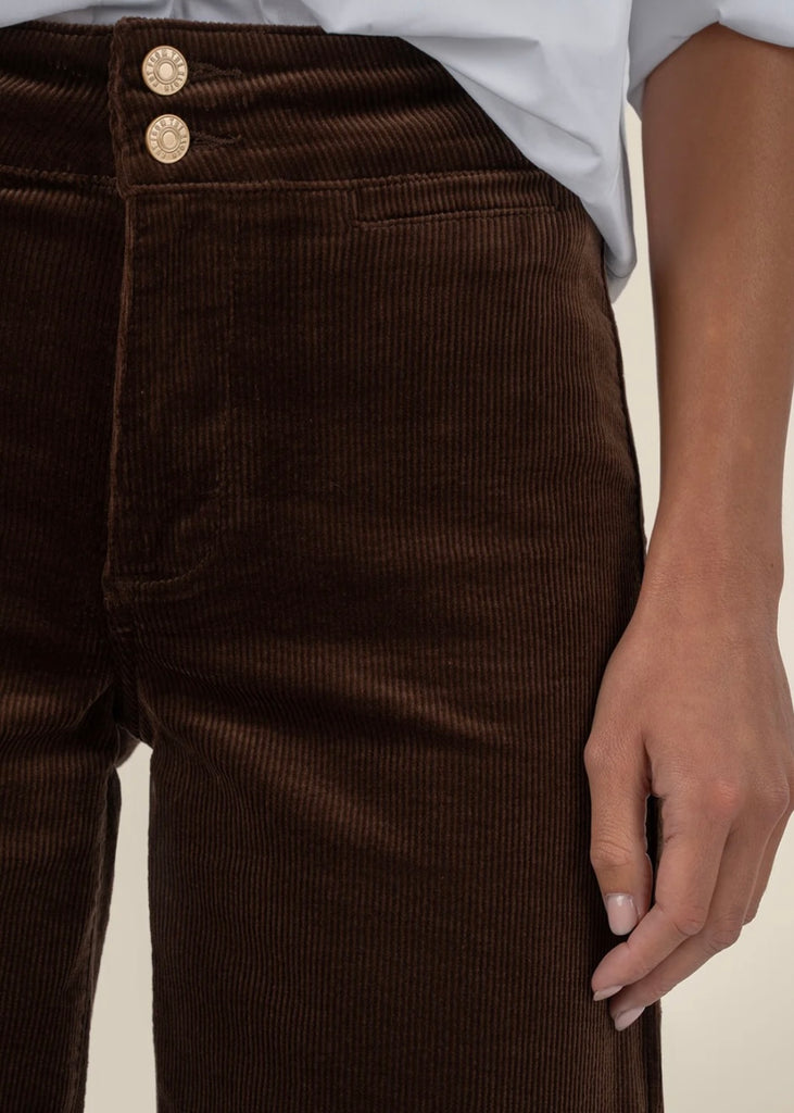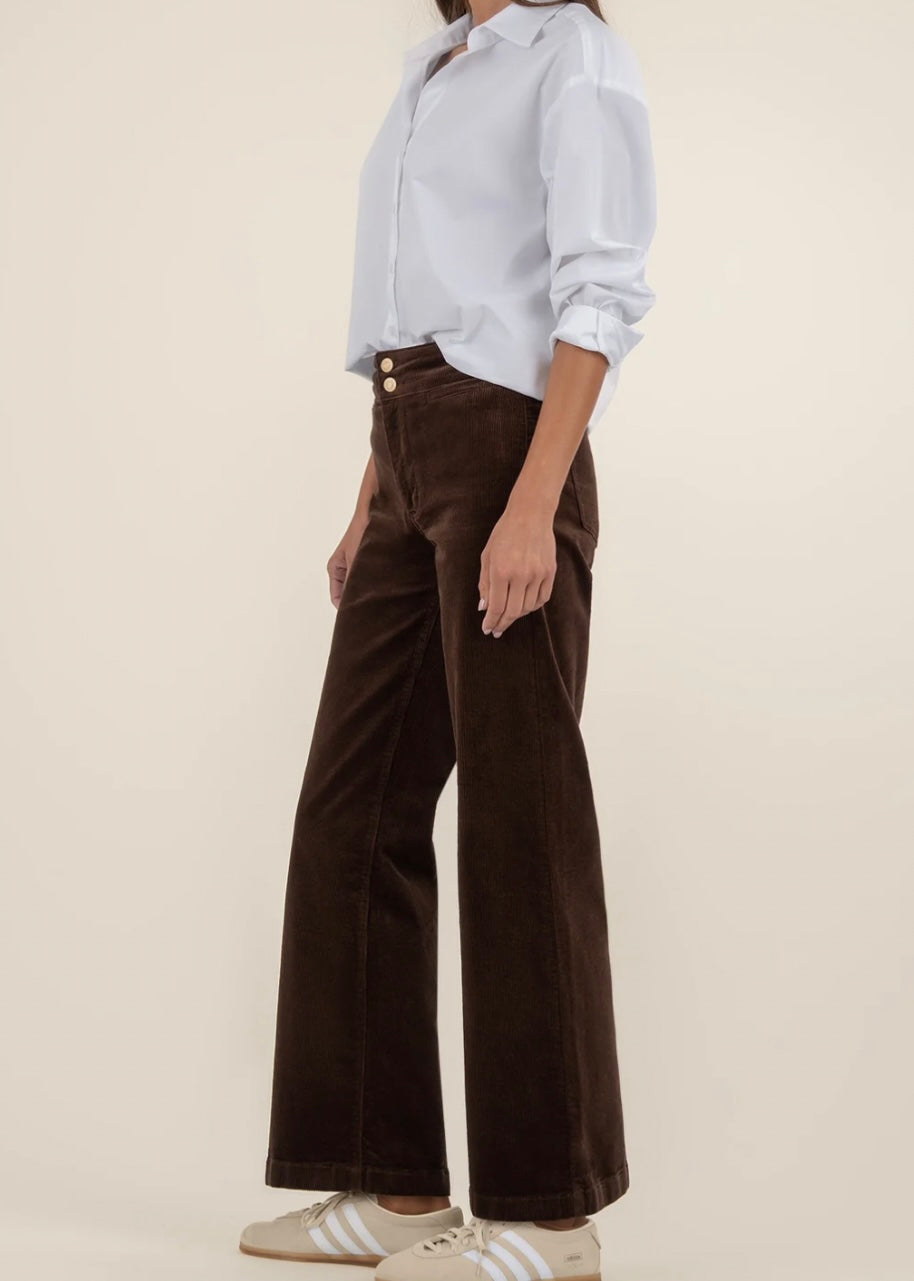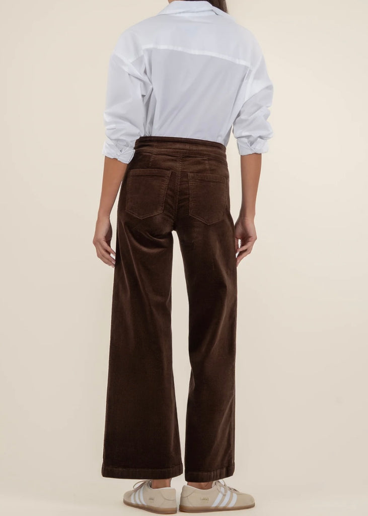 • Stay comfortable and chic in these wide leg corduroy pant in a warm fudge color. Featuring welt pockets and a wide waistband with double buttons, plus a touch of stretch for flexibility, they offer a perfect blend of style and ease. Ideal for adding texture and warmth to your fall wardrobe.