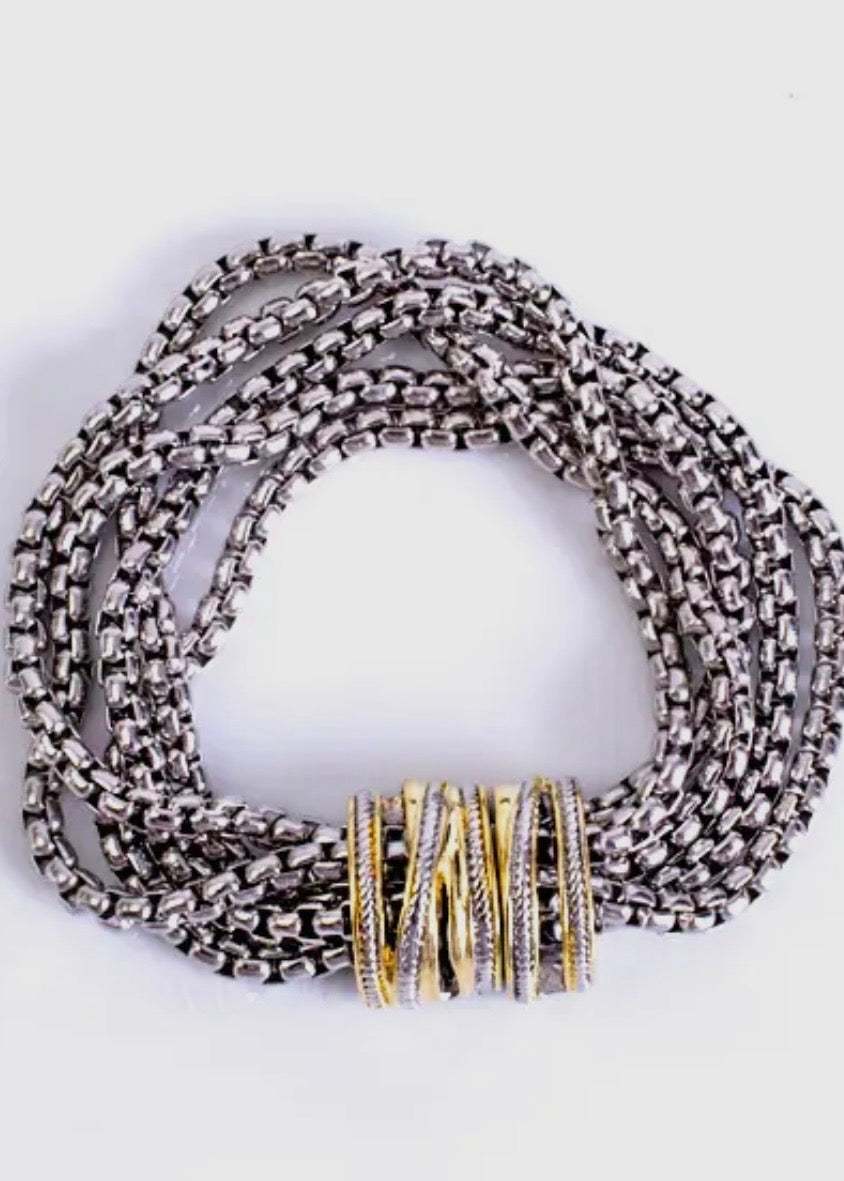 Made with 5 strands of rhodium box style chain, this designer inspired bracelet features a gorgeous cable station and a magnetic closure detailed with gold detailing