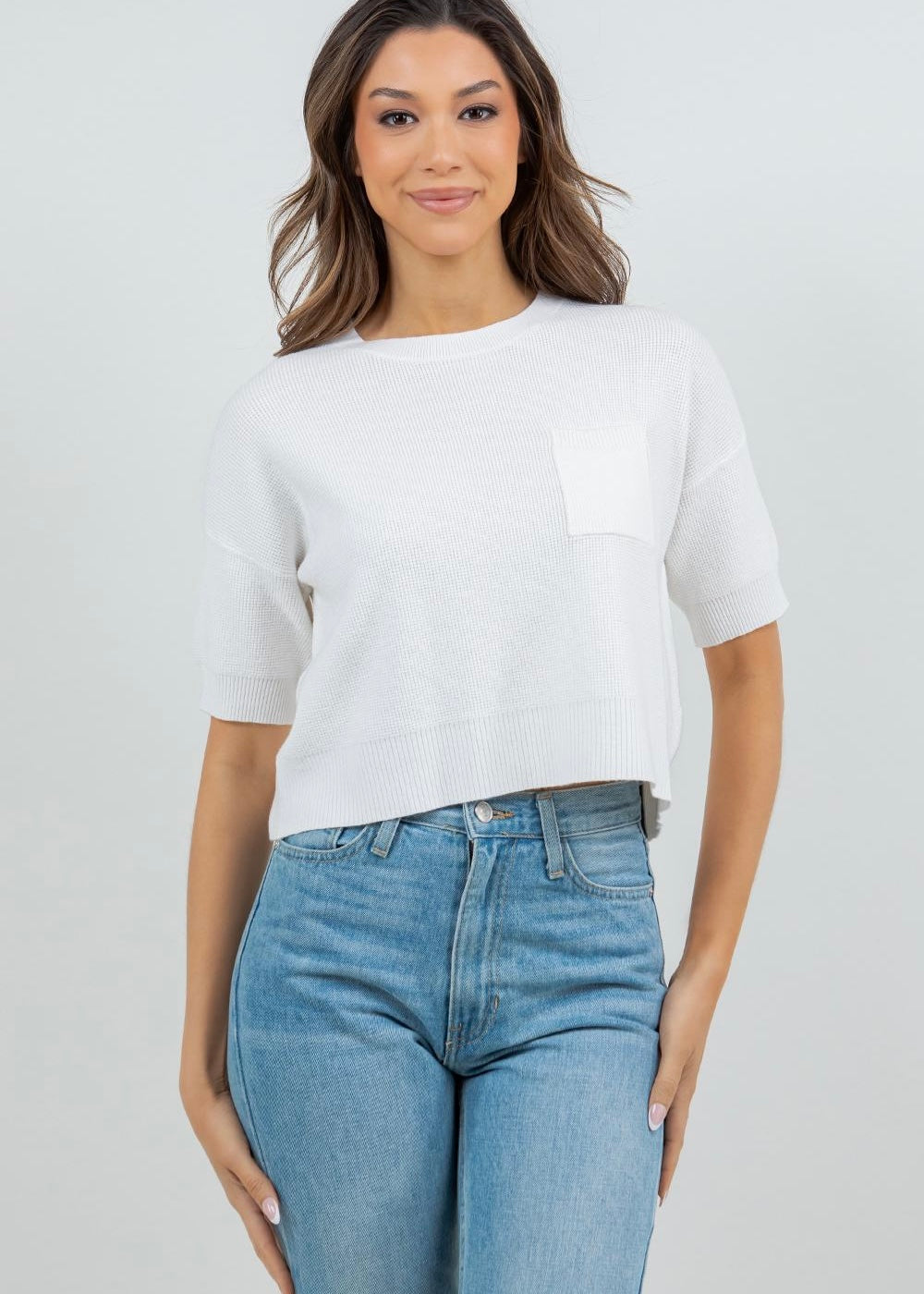 • Effortless layering meets everyday comfort with the Nelly Waffle Knit Tee. This cropped white top features a textured waffle knit fabric that adds subtle dimension, while a functional front pocket keeps essentials within reach.