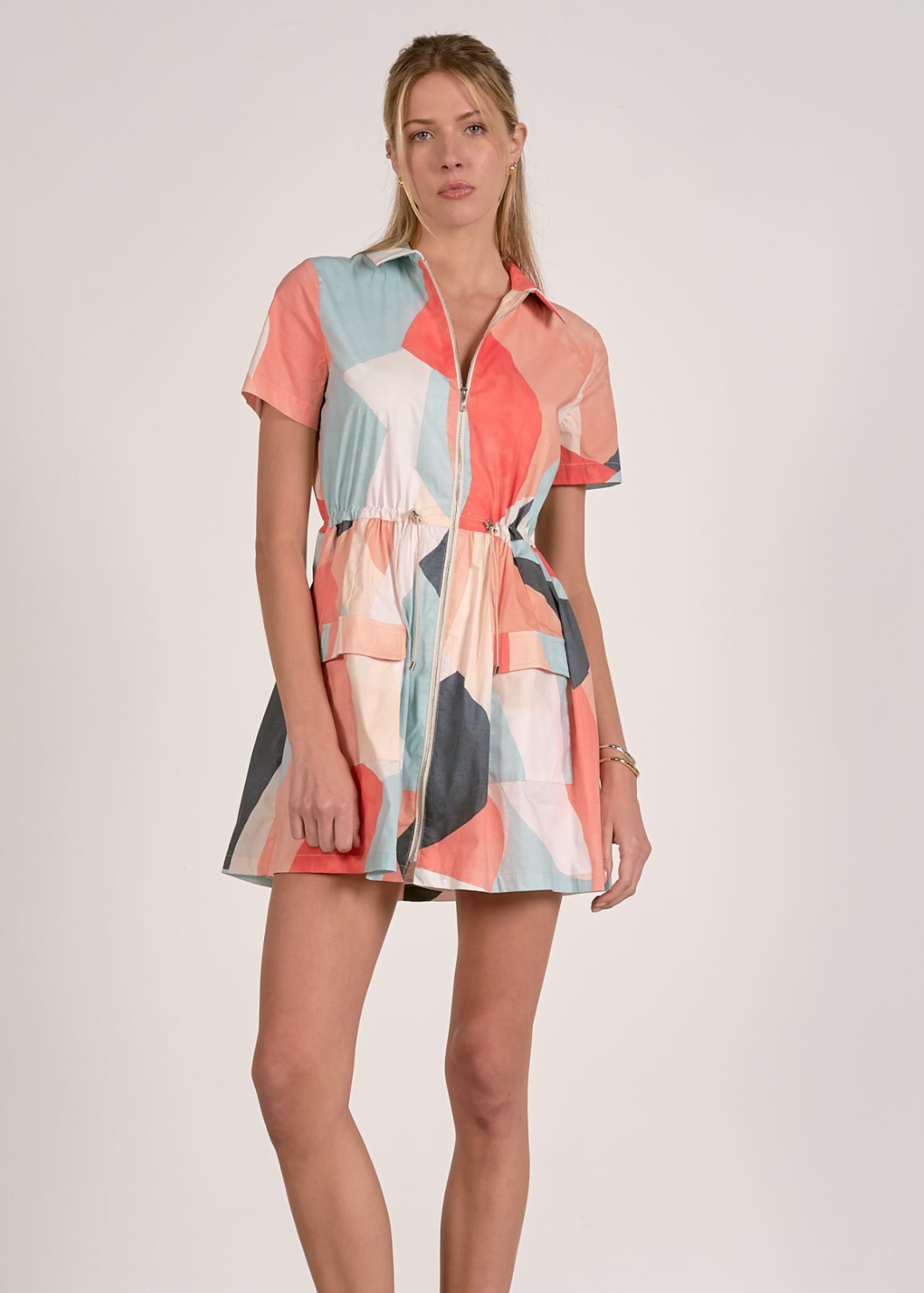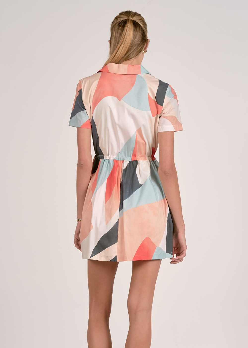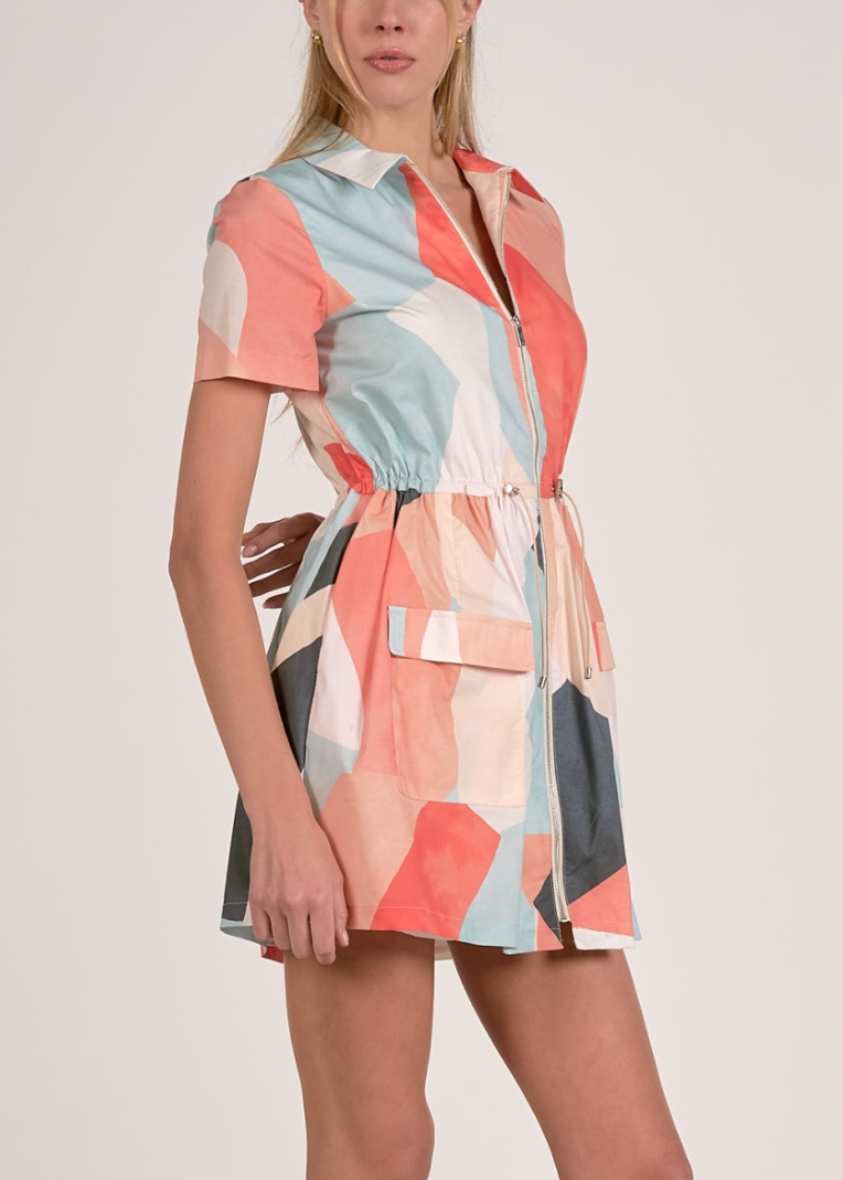 The fully lined interior enhances the dress’s structure, while the abstract pattern in mint, coral, cream, peach, and dark grey provides a modern aesthetic